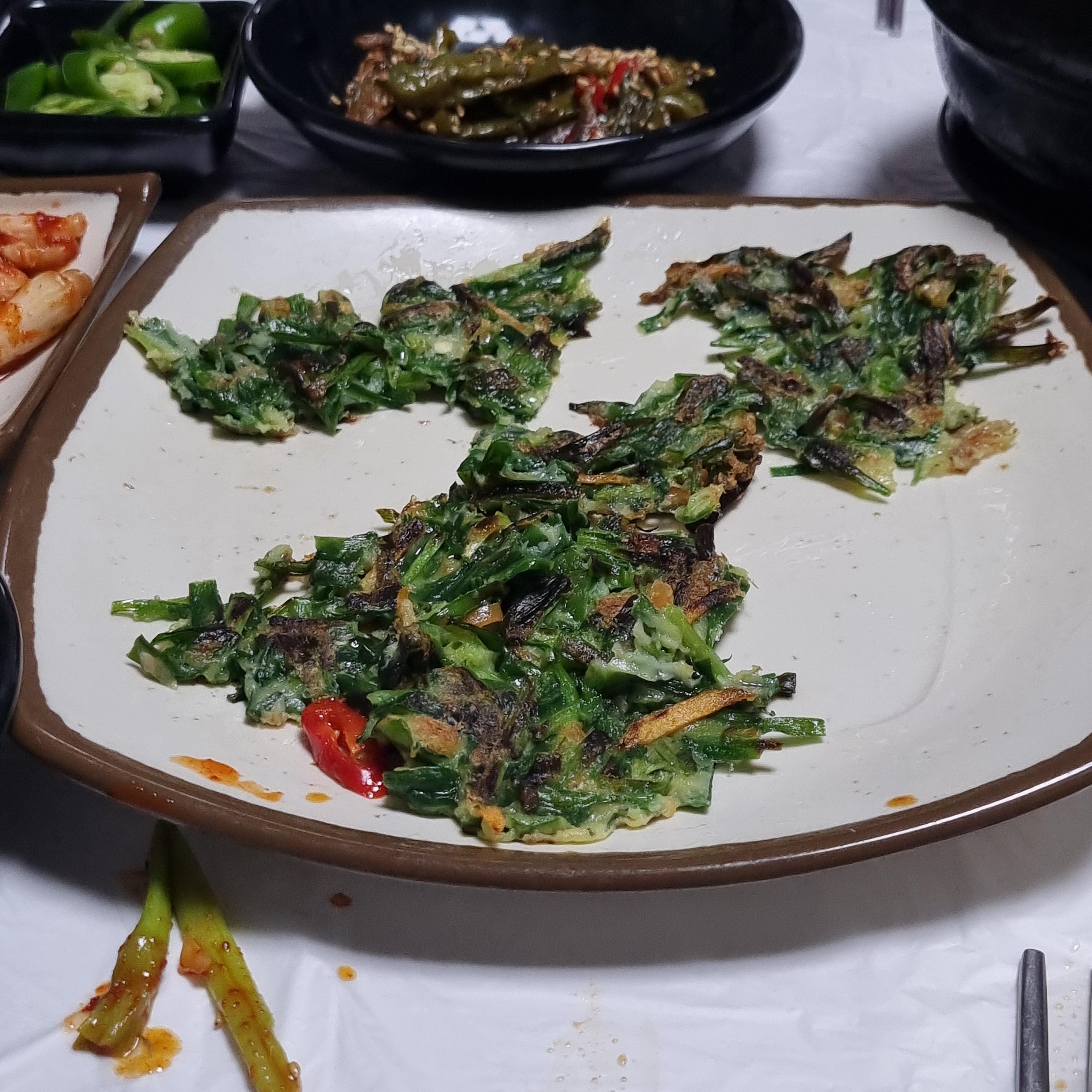 쭈삼볶음을 기다리는 동안 밑반찬을 먹는데 특히 부추전이 마음에 들고 맛있습니다. 먼저 막걸리 한잔 하면 분위기가 살아나는데 전체적이 음식 조합이 아주 잘 맞습니다.