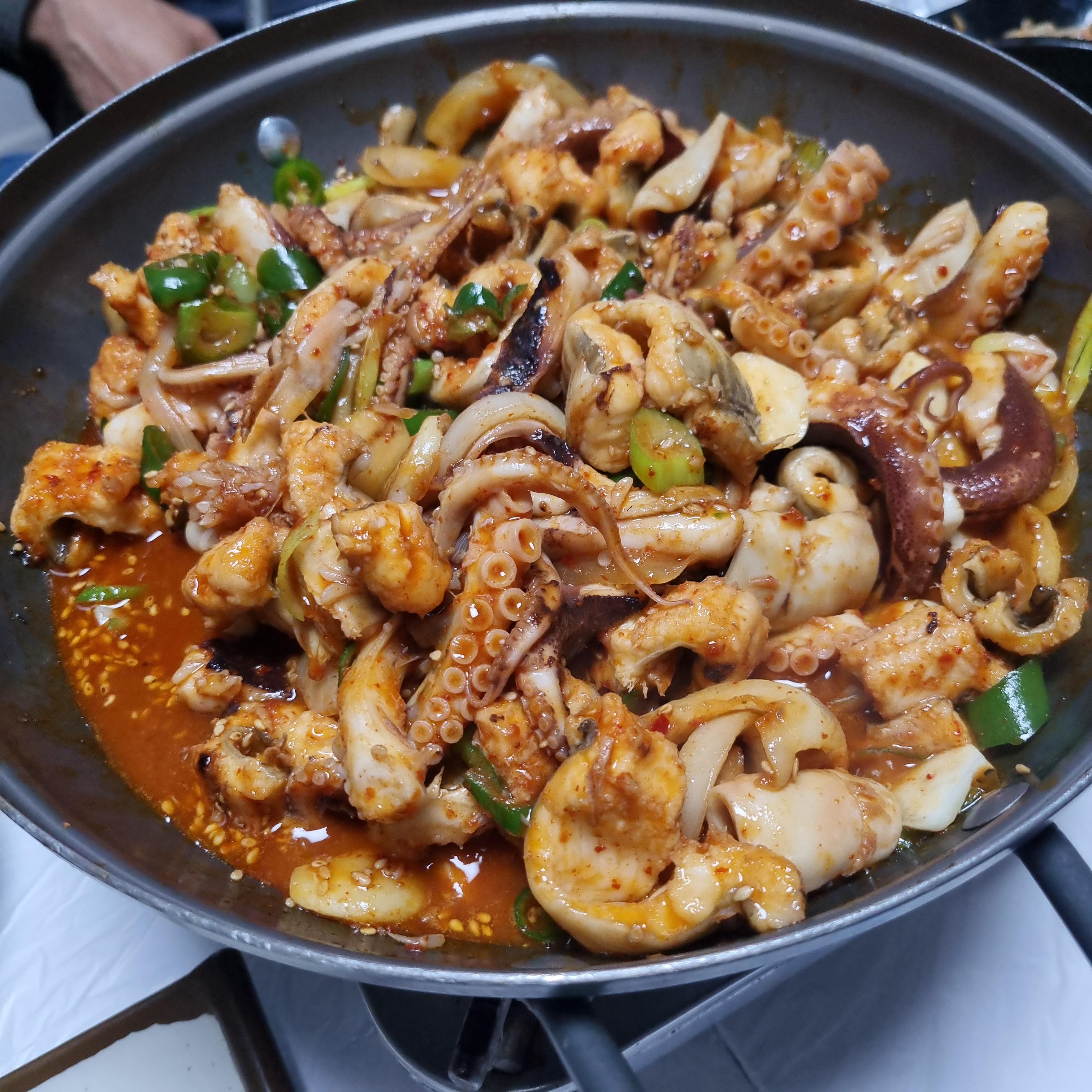 이것이 쭈삼인데 주꾸미와 삼겹살을 주요 재료로 하여 각종양념을 하여 볶아주는 메뉴인데 정말 맛있는 음식입니다. 주꾸미는 가을에 많이 나오지만 냉동보관된 것이 있어 계절에 상관없이 많이 나오는 음식입니다.