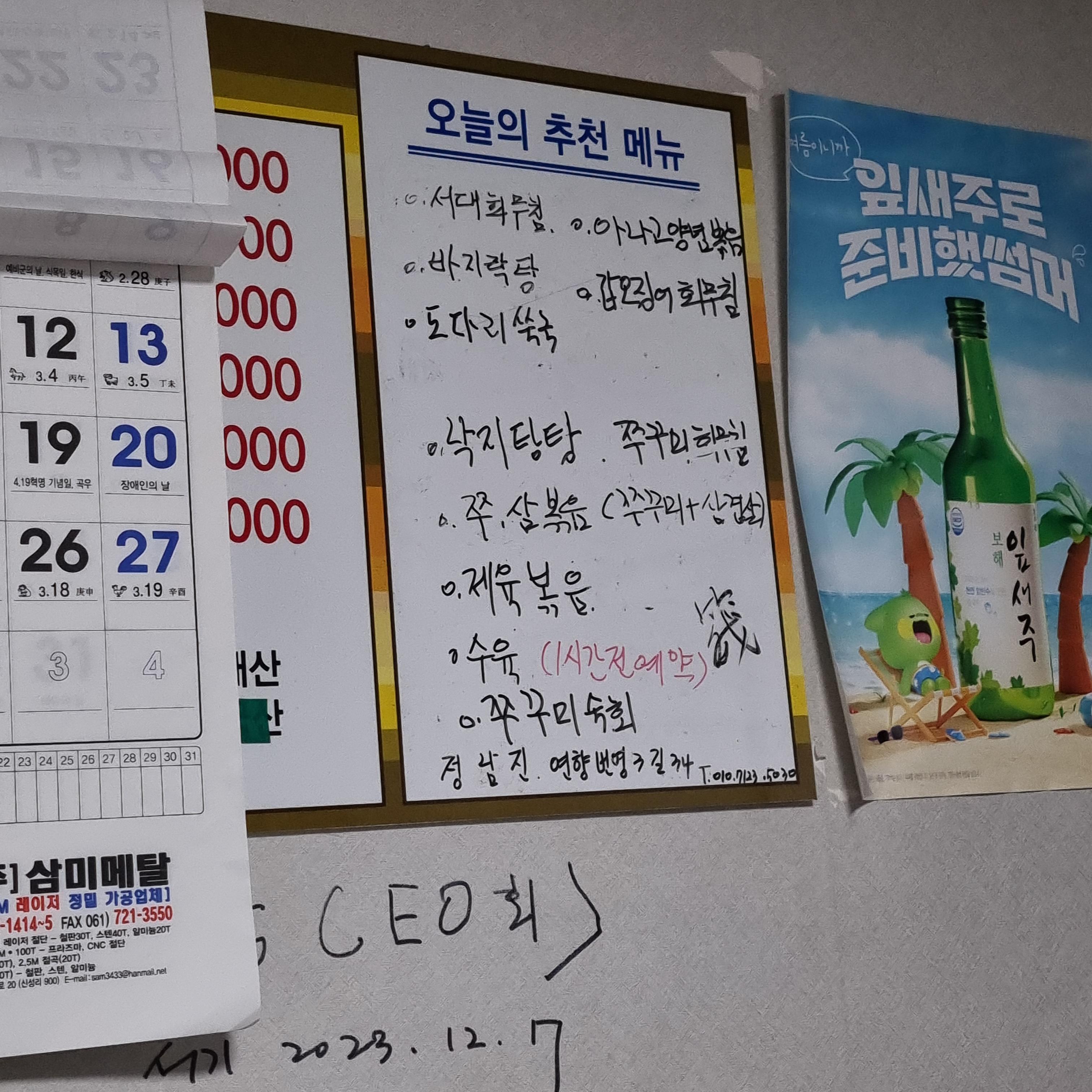 주요 메뉴는 서대회무침, 갑오징어회무침, 쭈꾸미볶음, 바지락탕, 도다리쑥국, 낚지 탕탕이, 주꾸미회무침, 수육, 제육볶음, 전어회등이 있습니다.