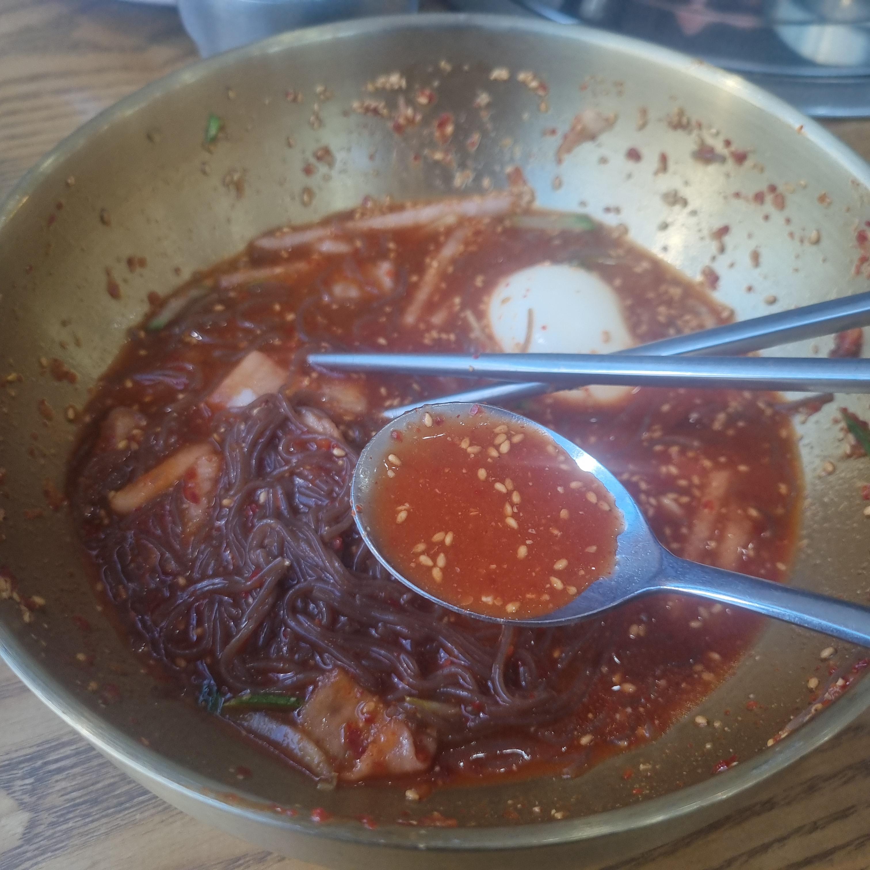 저가 좋아하는 비빔냉면인데 예전에는 물냉면을 주로 먹었는데 이곳에서는 꼭 비빔냉면을 찾습니다. 이유는 비빔냉면의 양념맛이 너무 좋으면서 조그마한 그릇에 시원한 육수가 조금 나오는데 이것을 함께 섞어 혼합여 드시면 너무 맛있습니다.