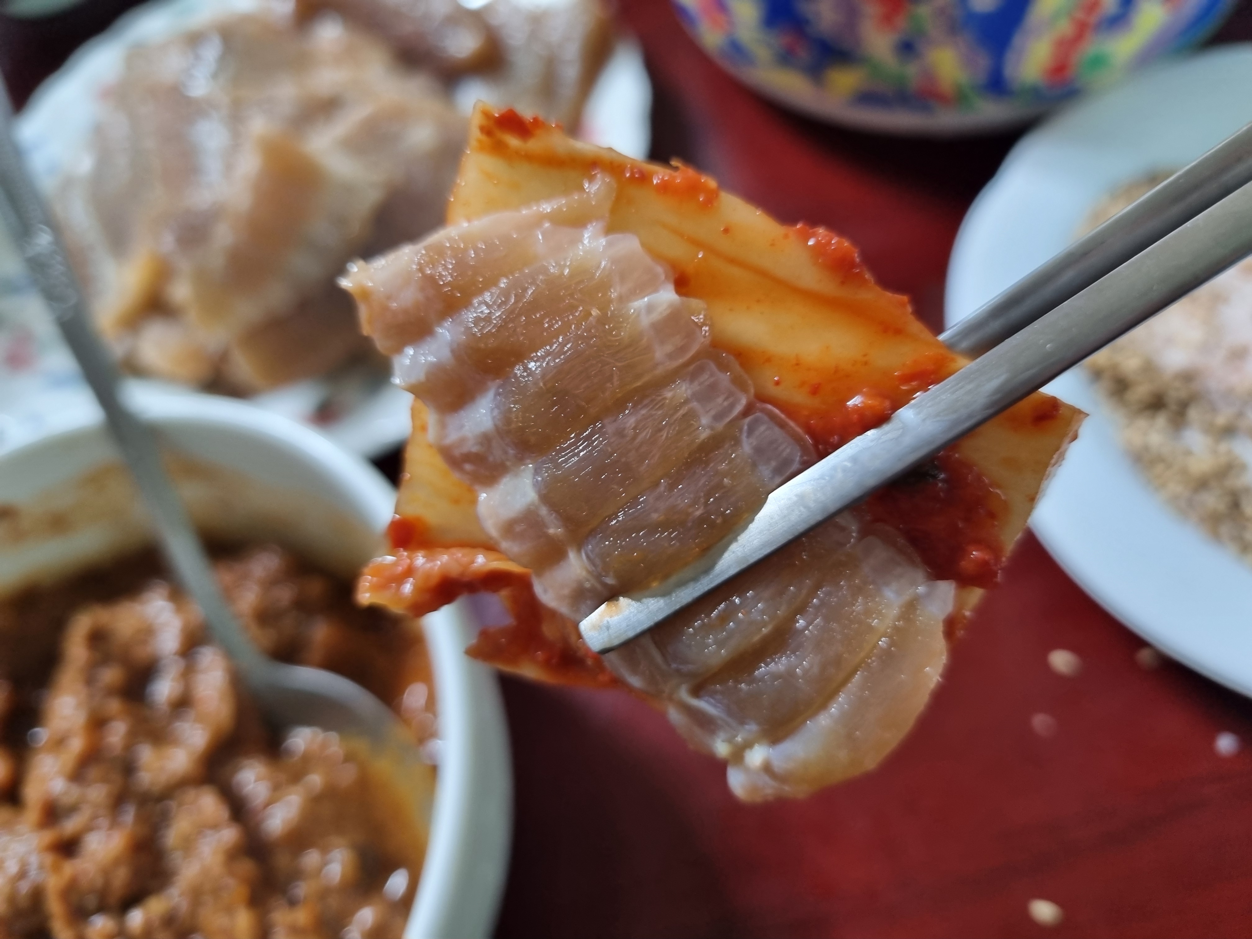 홍어는 전라도 지역에서 삼합으로 많이 드시는데 김치와 삼겹살구이 또는 수육과 함께 쌈으로 드시면 최고의 맛으로 먹을 수 있는데 오늘 필자는 돼지고기를 준비 못해 그냥 김치와 함께 먹었습니다.