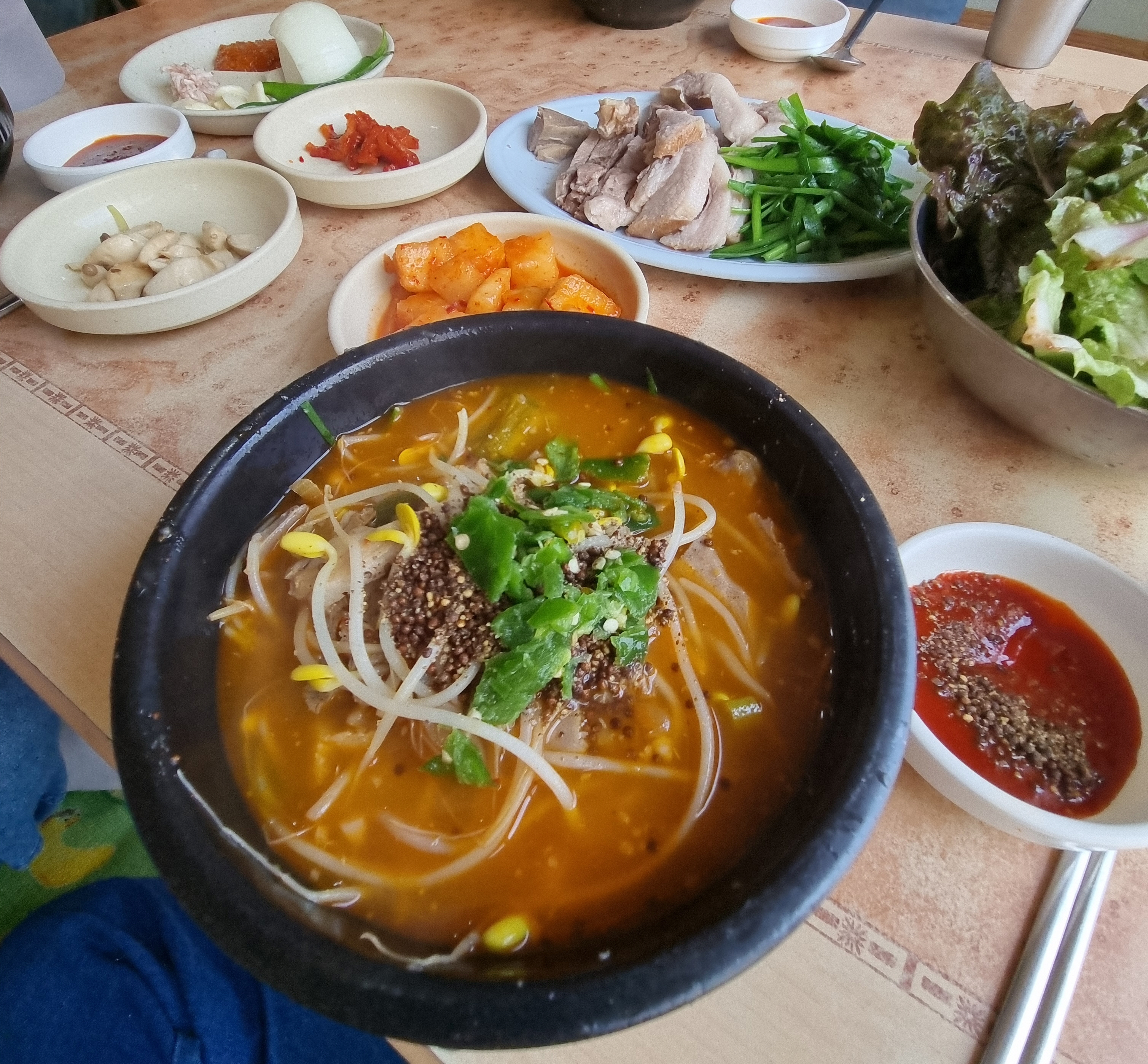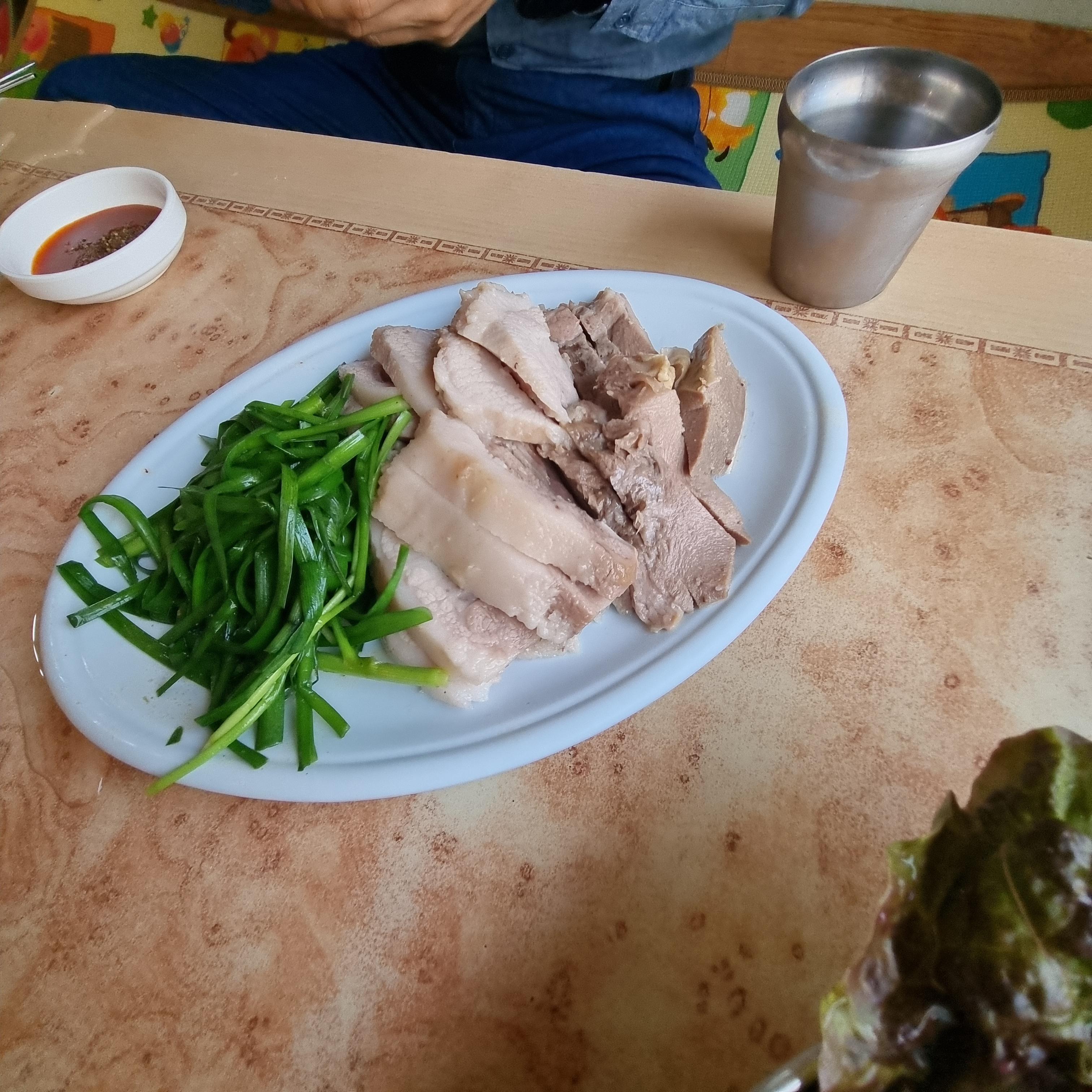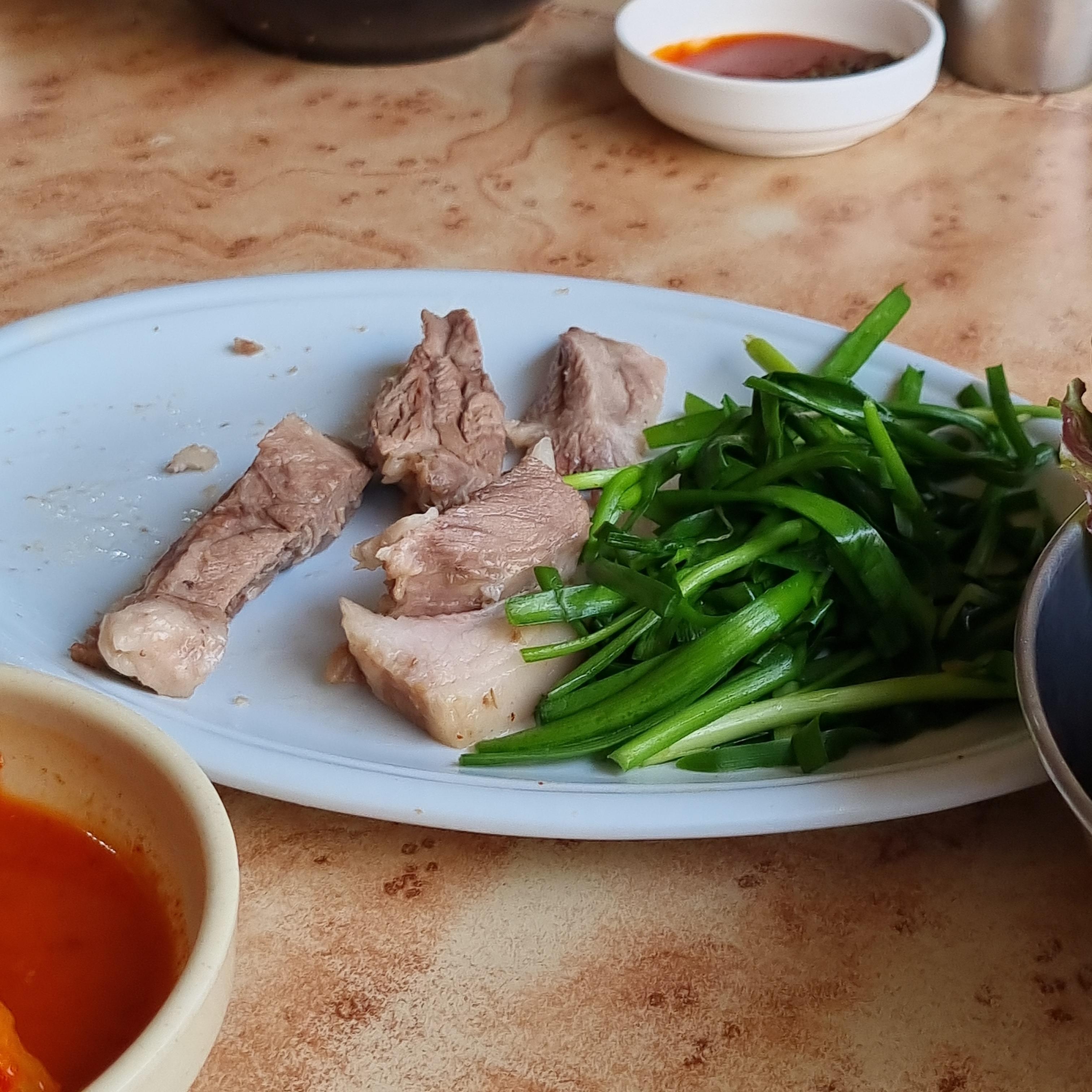 수육은 부추가 삶아서 돼지고기와 함께 나오는데 양은 많지 않지만 도톰하게 썰어져 있고 언듯 보기에 비계가 많은 듯 하지만 살고기가 많고 쫀득한 부위라 정말 맛있습니다.