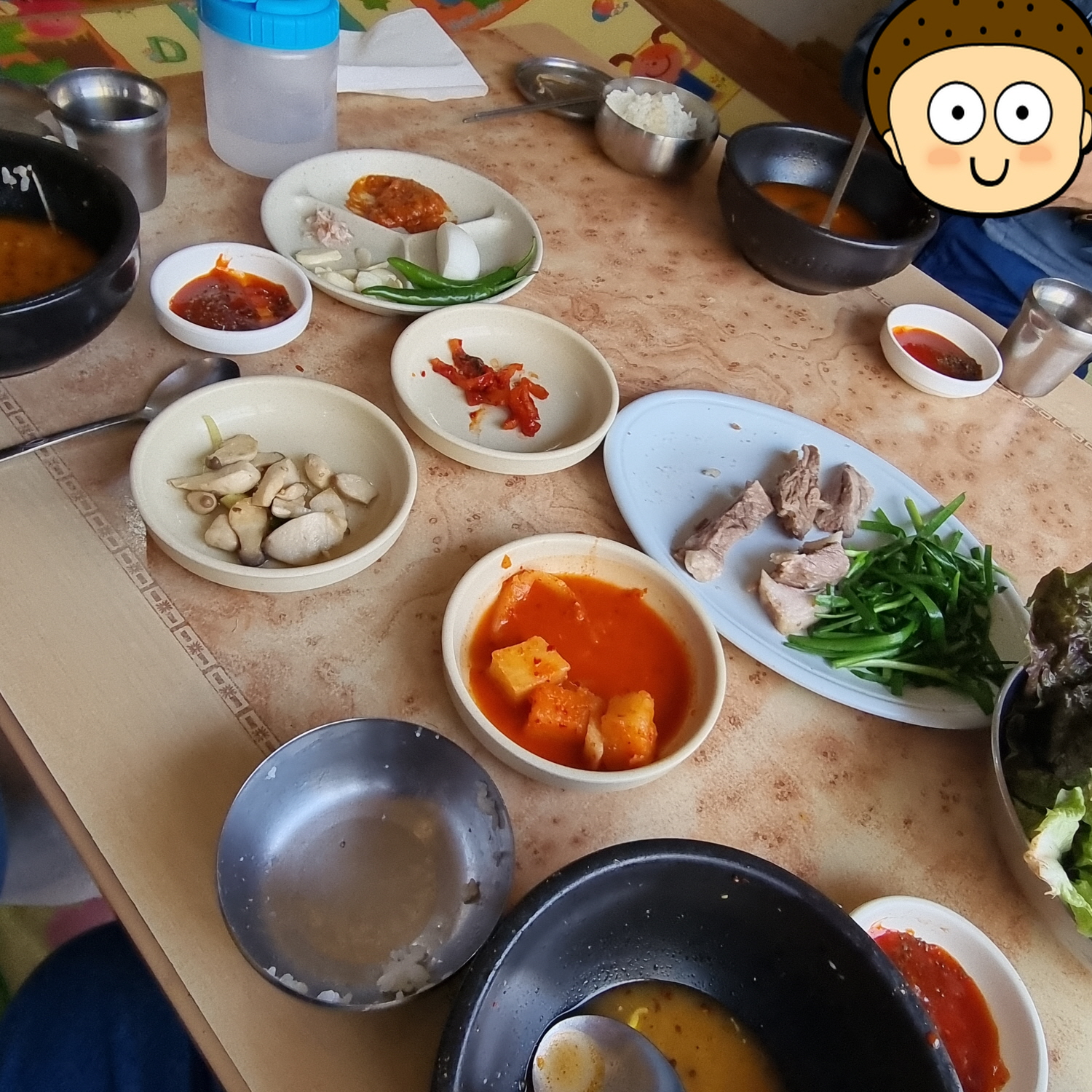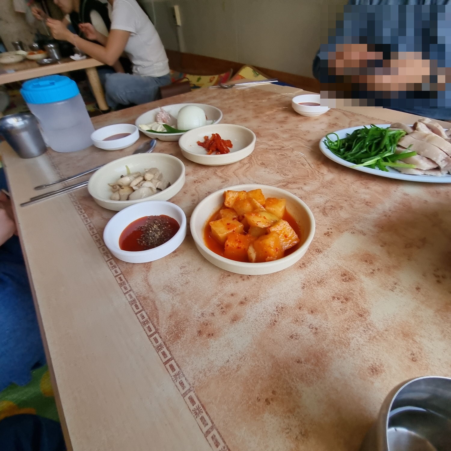 기본반찬은 깍두기와 버섯볶음이 나오고 나머지는 양념이 나옵니다.