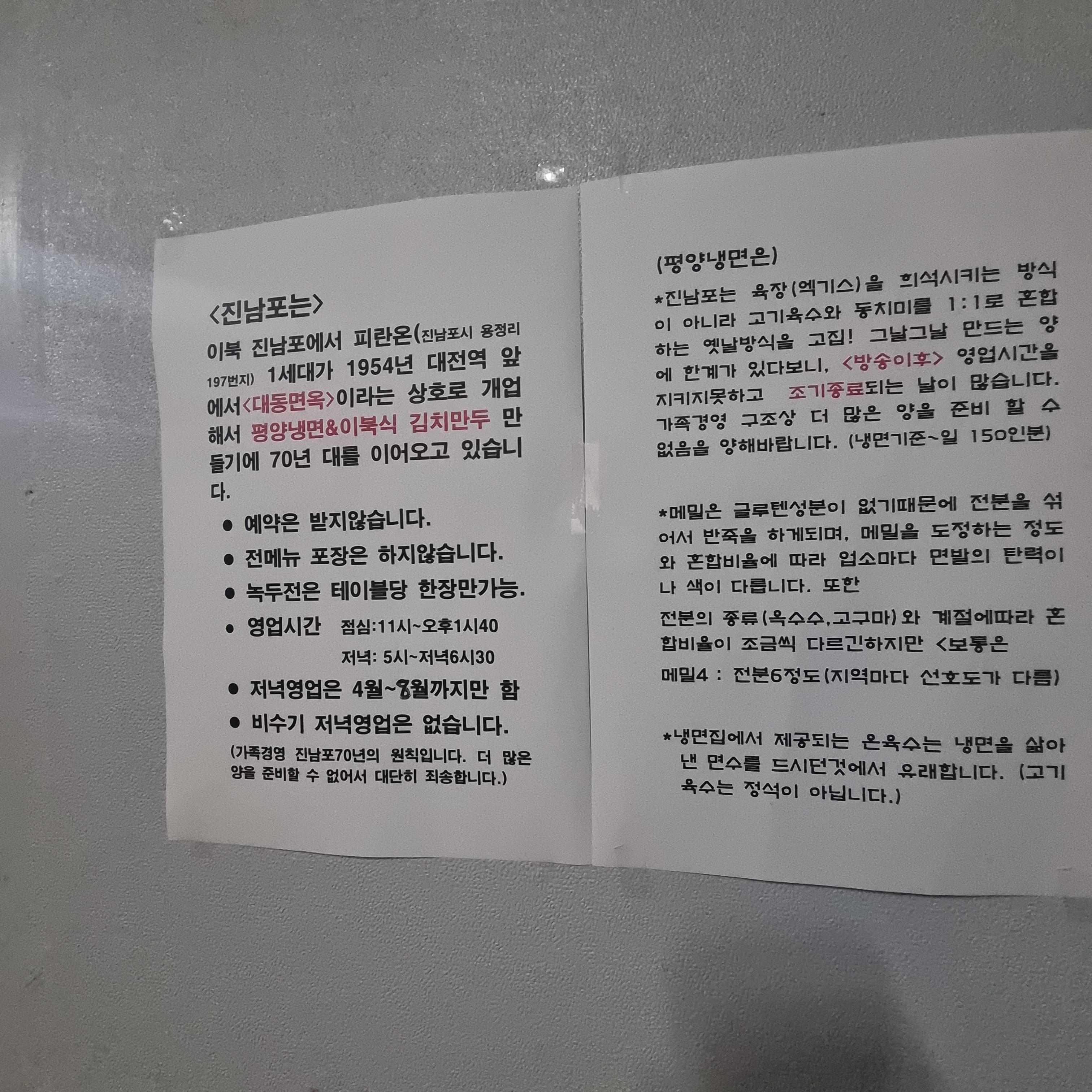 진남포 면옥의 역사에 대해서도 잘 설명하는 글이 벽에 붙어 있습니다.