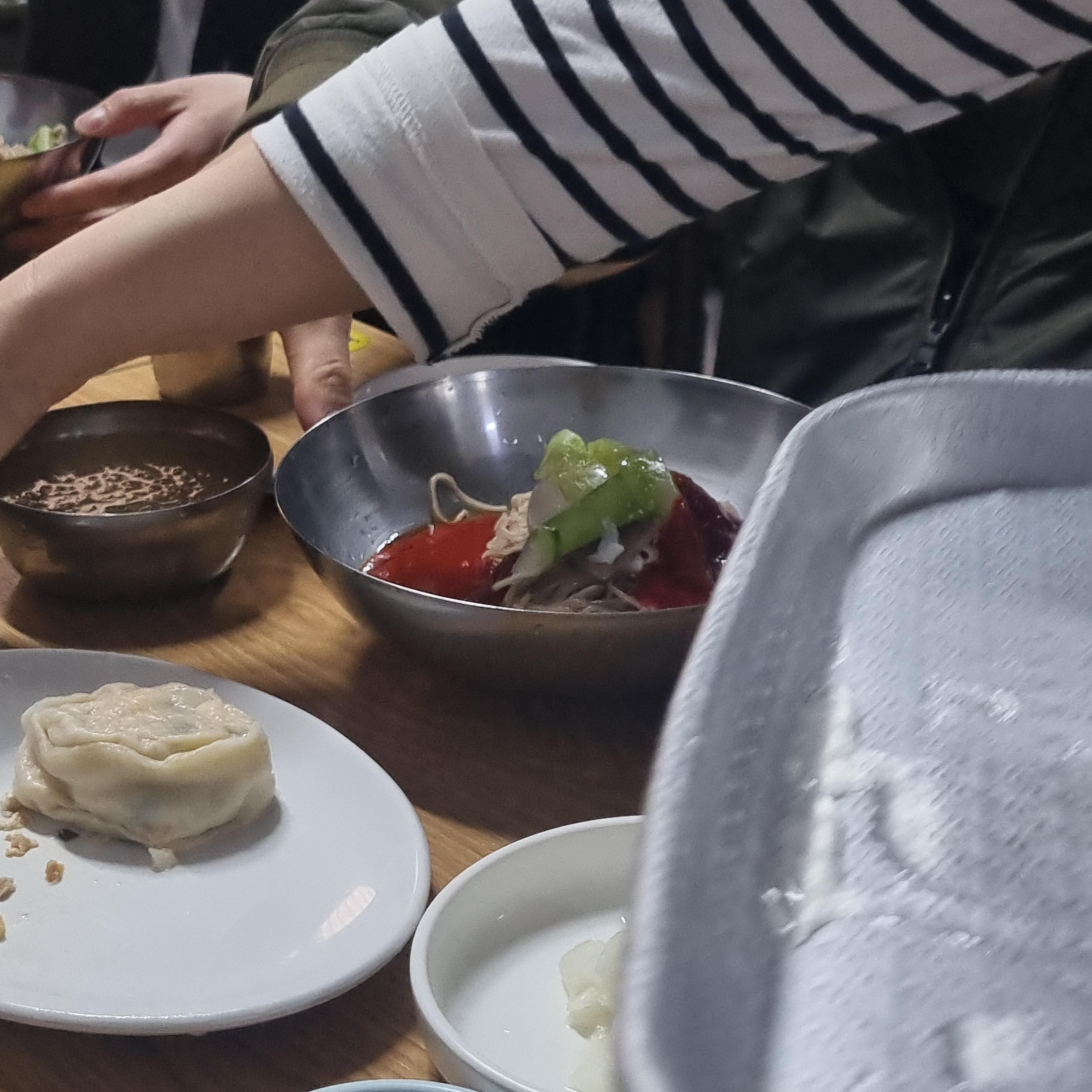 우리는 4인이 방문하여 각자 물냉과 비냉을 주문하고 찐만두와 녹두전을 각각 하나씩 추가 주문했습니다.
