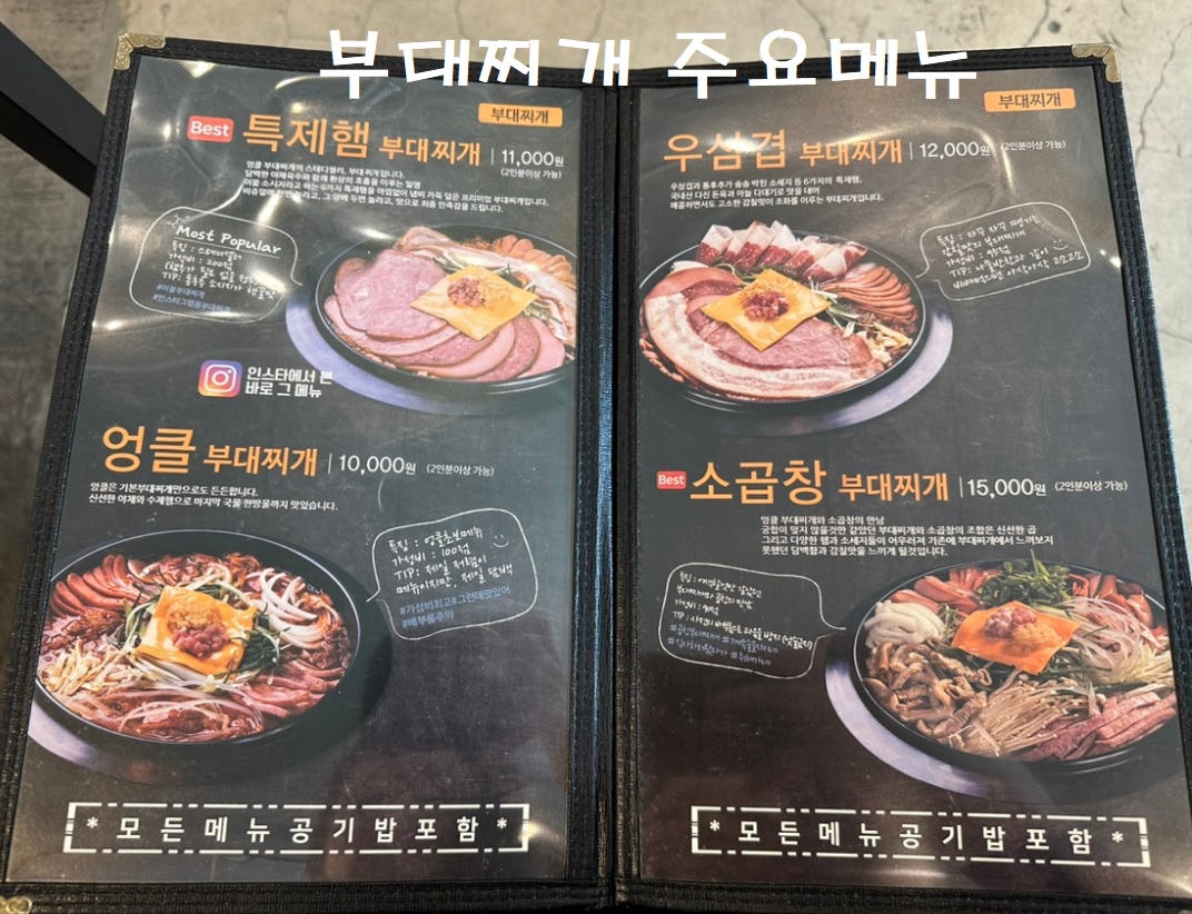 이 메뉴 이외에도 특제햄 부대찌개가 11,000원이며 우삼겹, 소곱창 부대찌개가 각각 12,000원, 15,000원에 주문할 수 있습니다.
