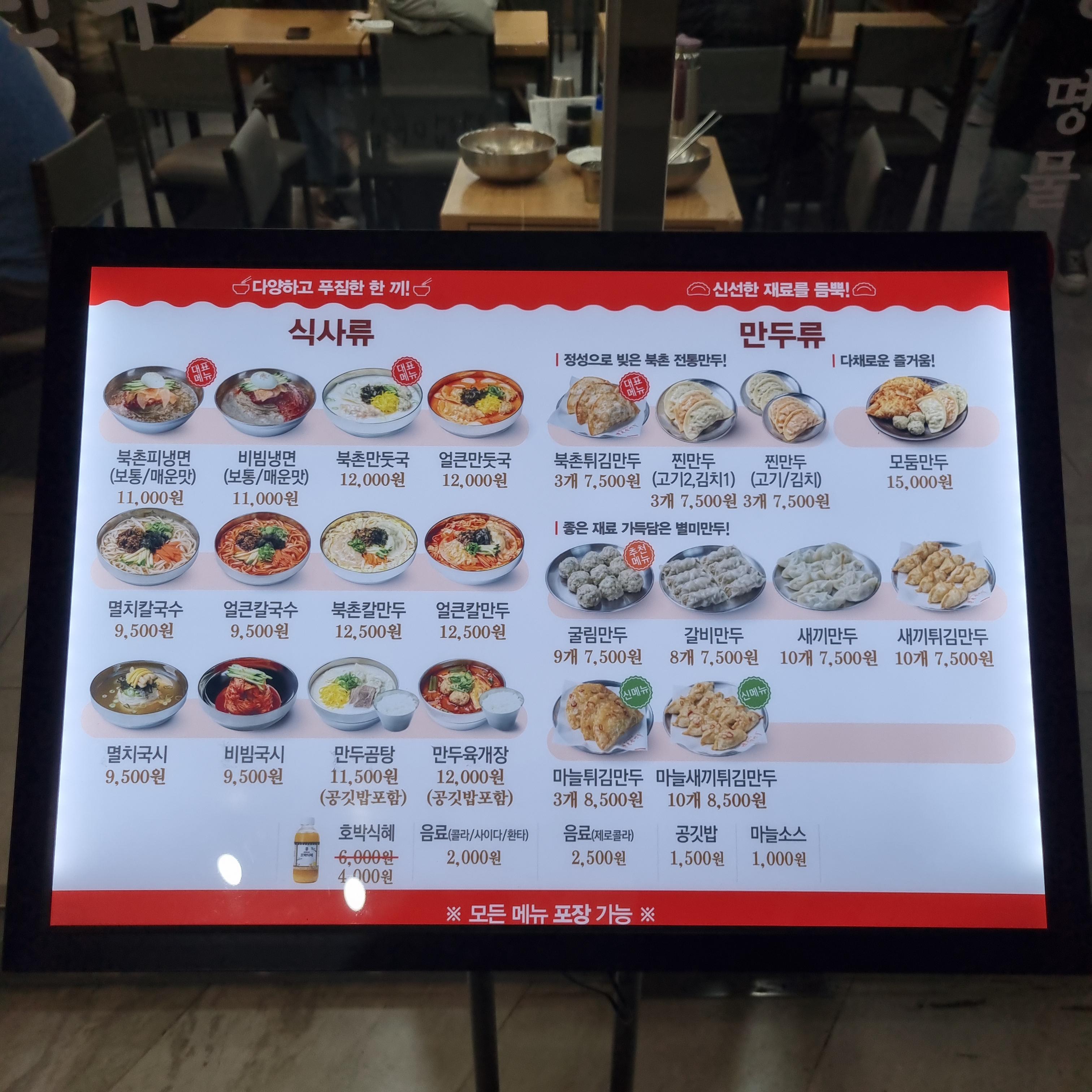 인기 있는 메뉴가 북촌피냉면과 얼큰 만둣국인데 우리는 2인이 방문하여 이 두 가지 메뉴를 주문했는데 가격은 각각 11,000원과 12,000원입니다.