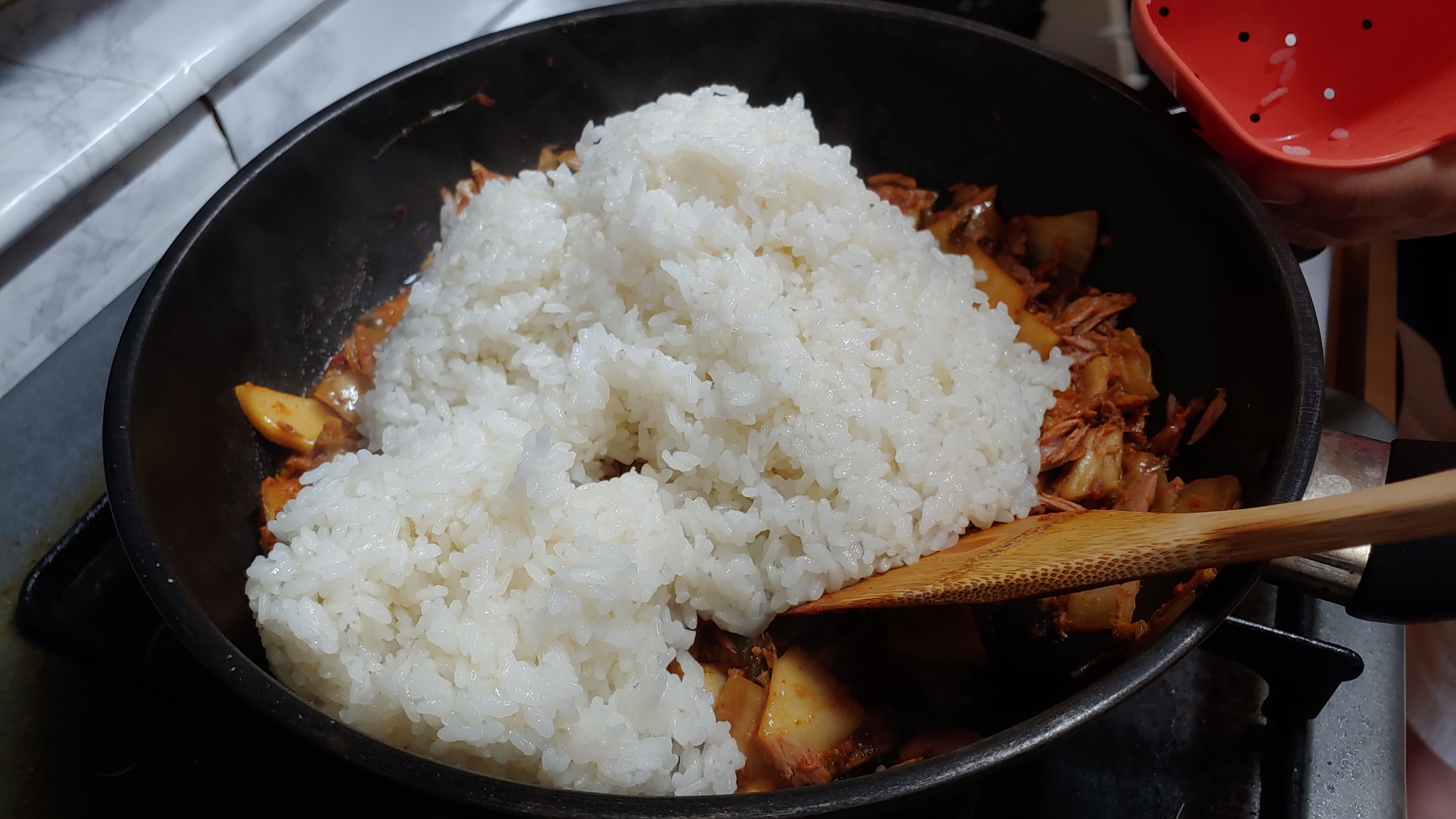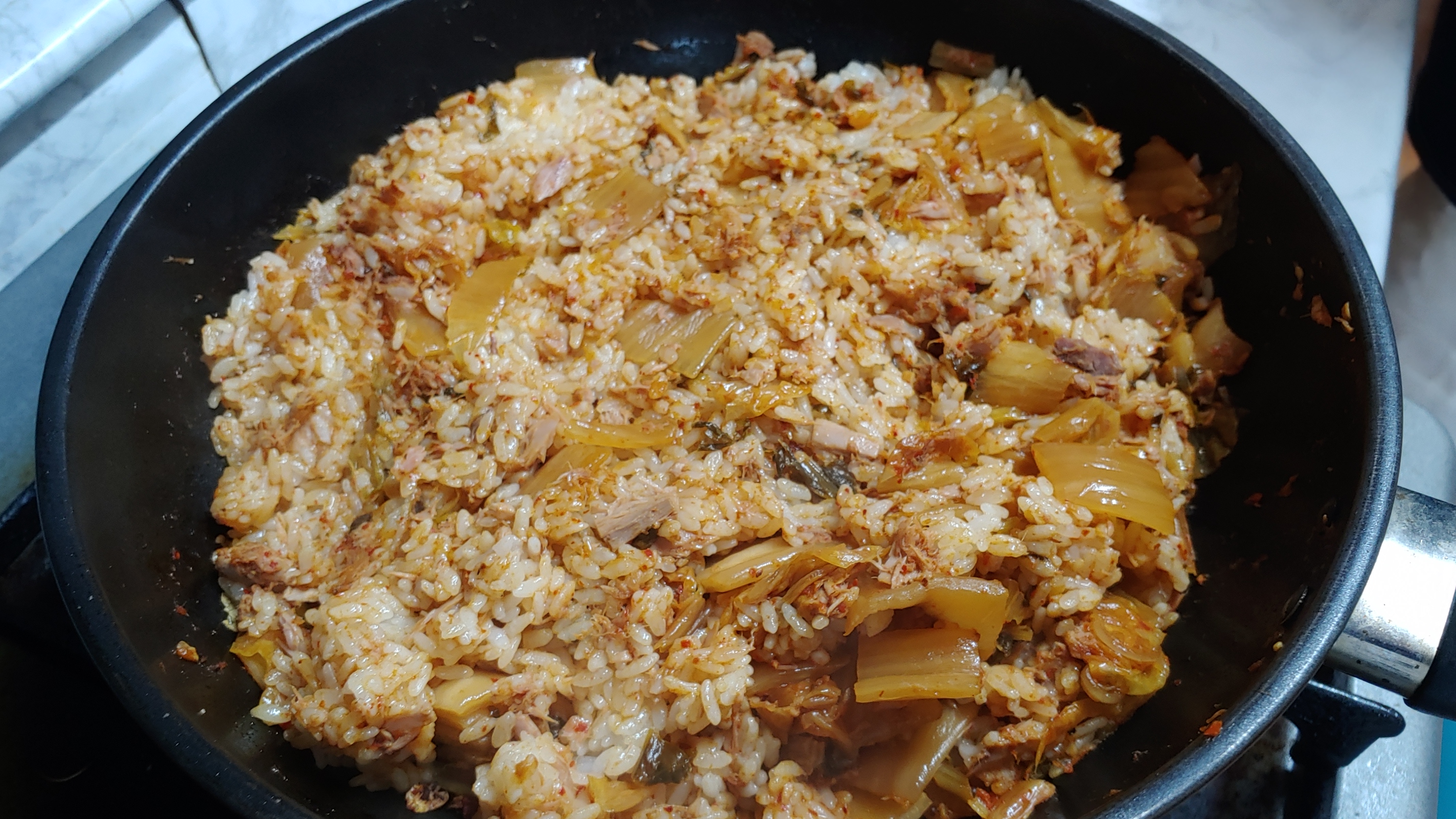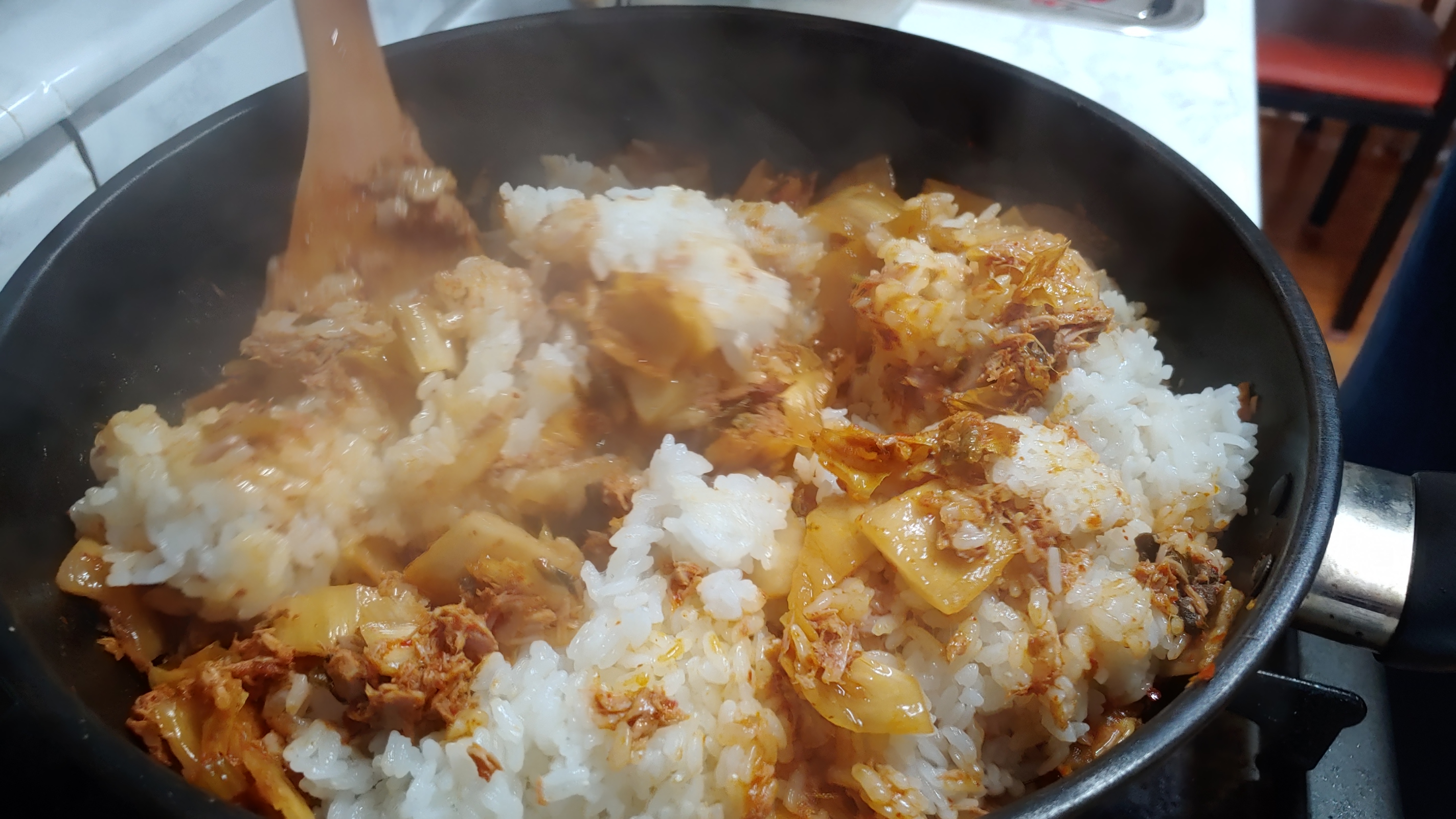 가스렌인지 불은 계속 중간으로 유지하면서 밥과 김치를 잘 혼합하면서