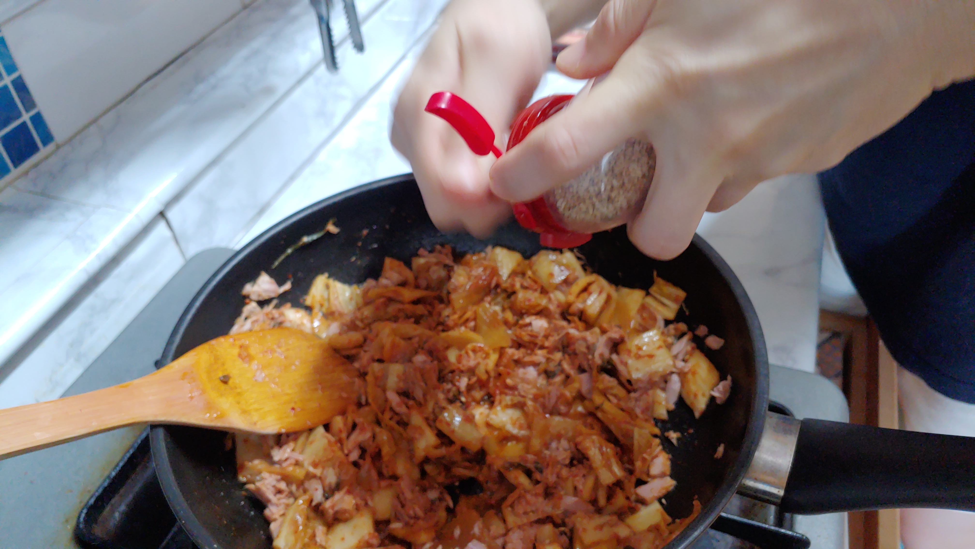 이렇게 해서 1차적으로 참치와 김치를 잘 혼합하여 볶아주었습니다