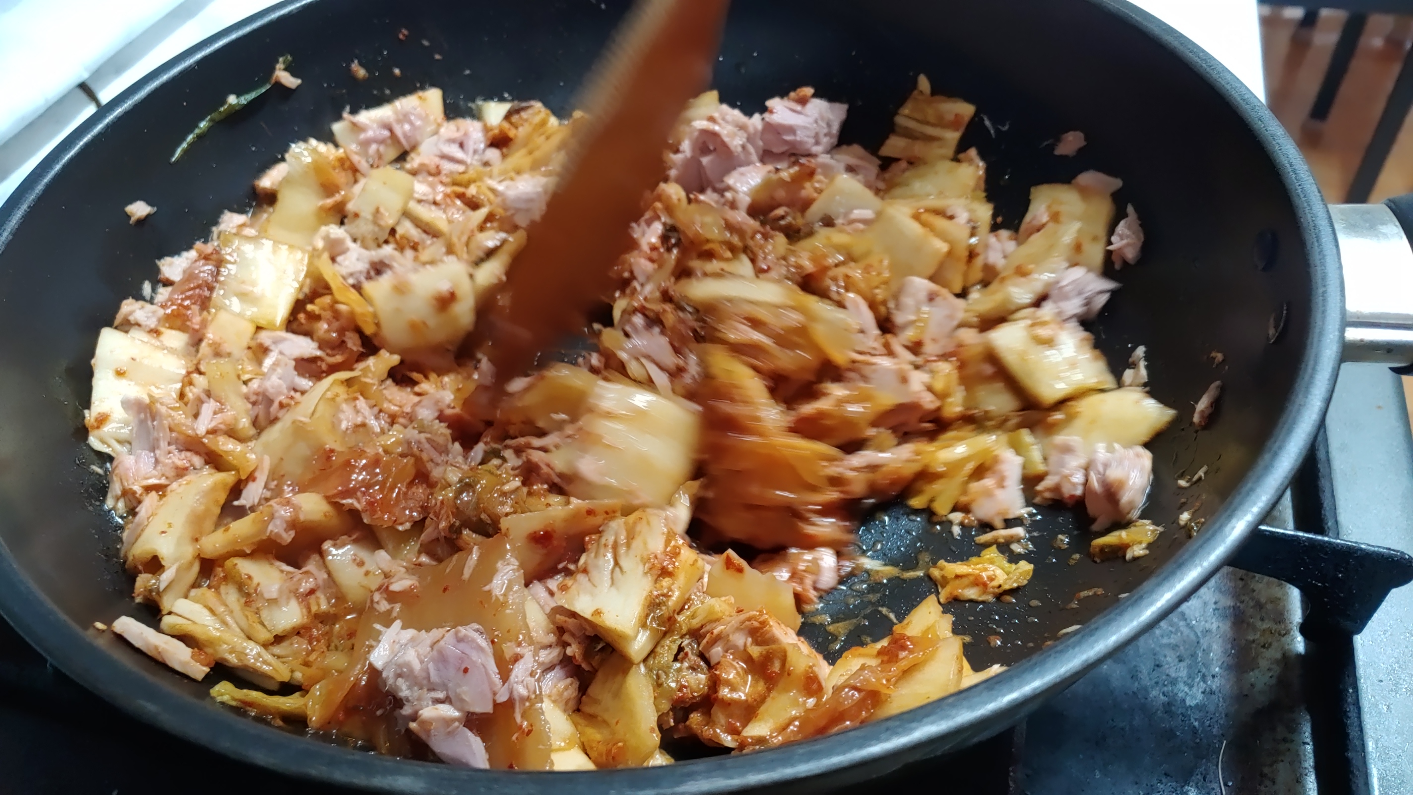 김치와 참치를 잘 섞으면서 볶아주기 시작합니다