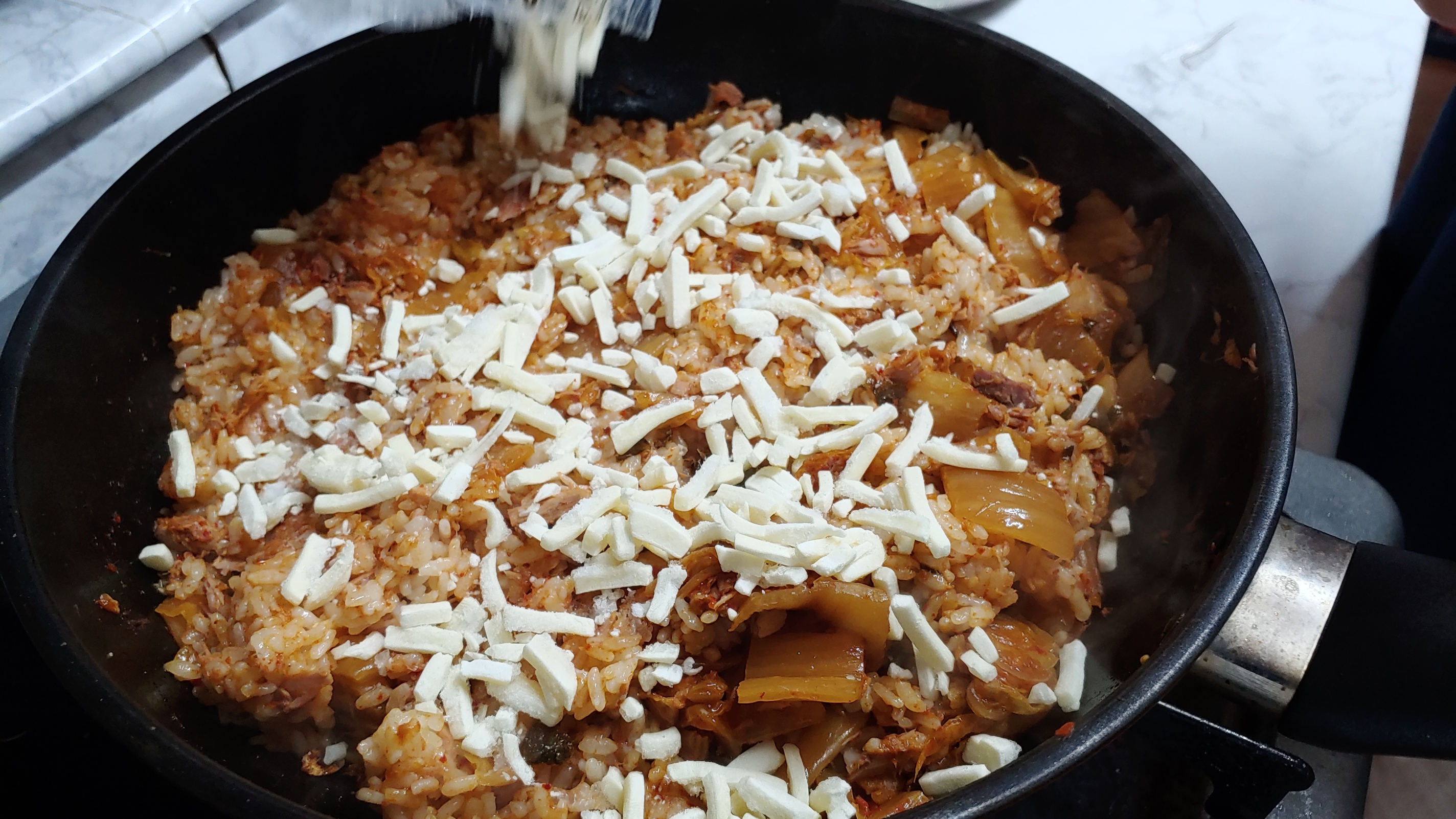 이후 치즈를 이렇게 골고루 볶음밥 위로 뿌려 줍니다