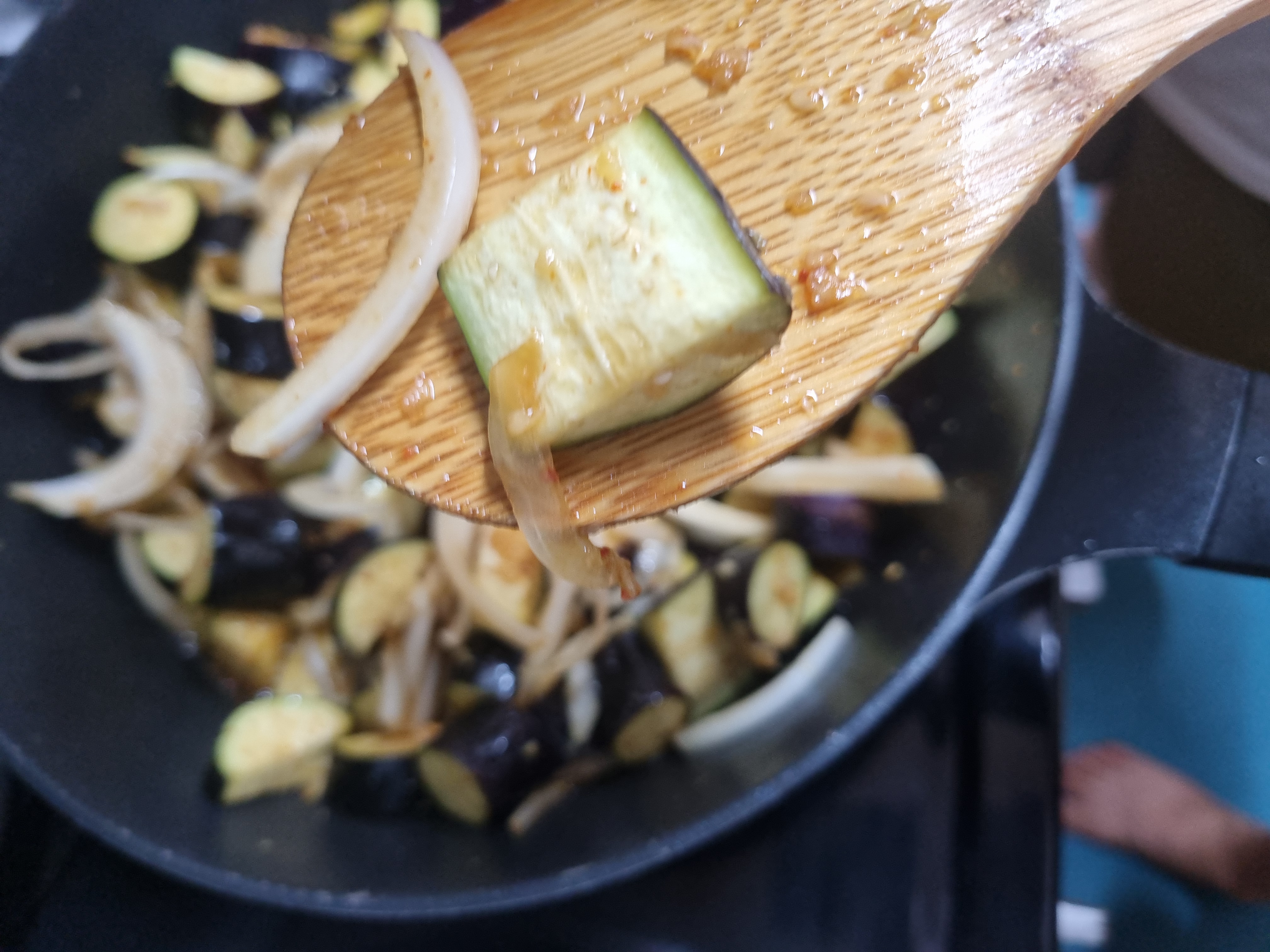 천천히 저으면서 볶아주는데 가지에서도 물이 나오기 때문에 처음에 물끼가 없다고 물을 추가하면 안 됩니다.
