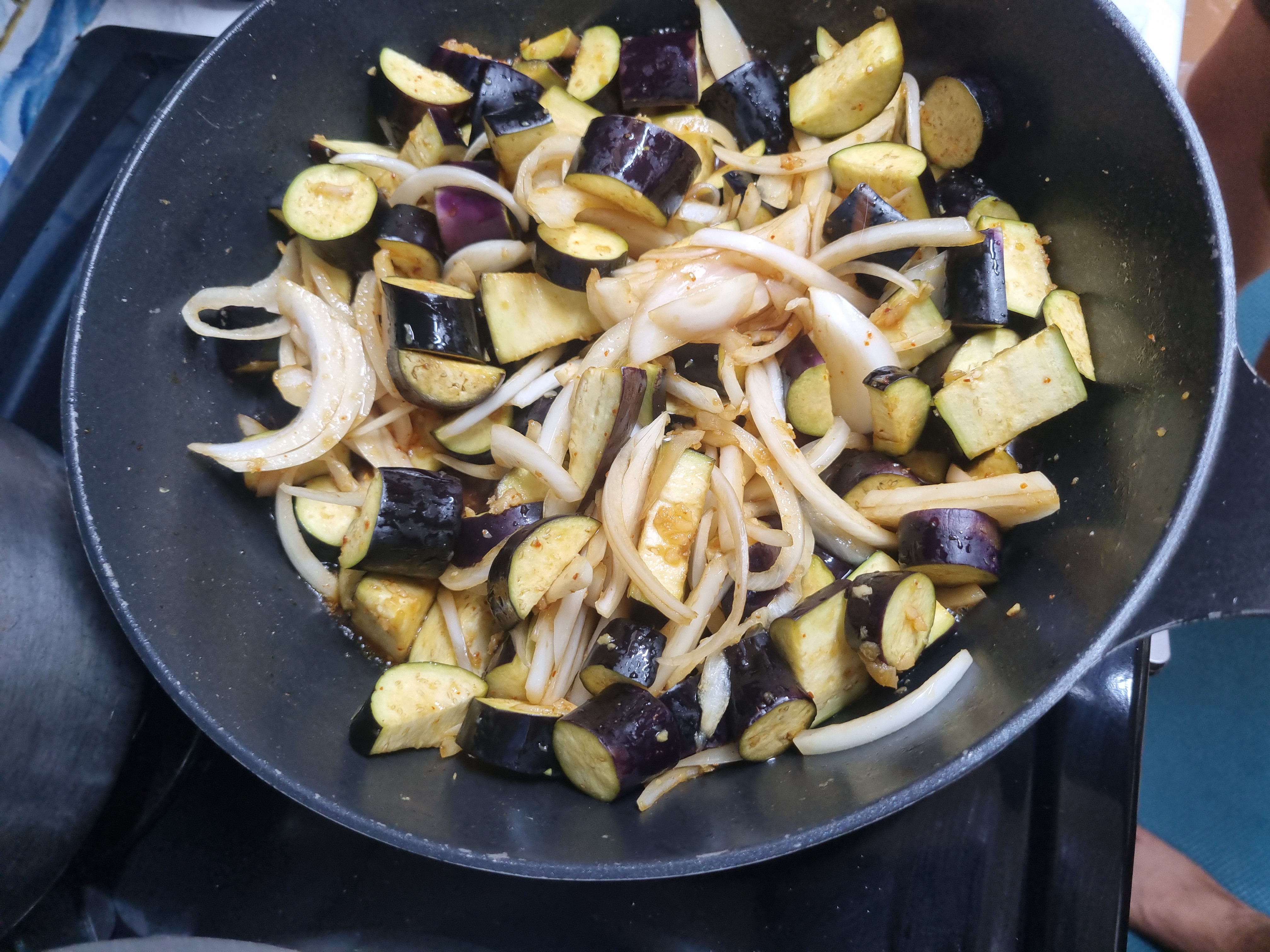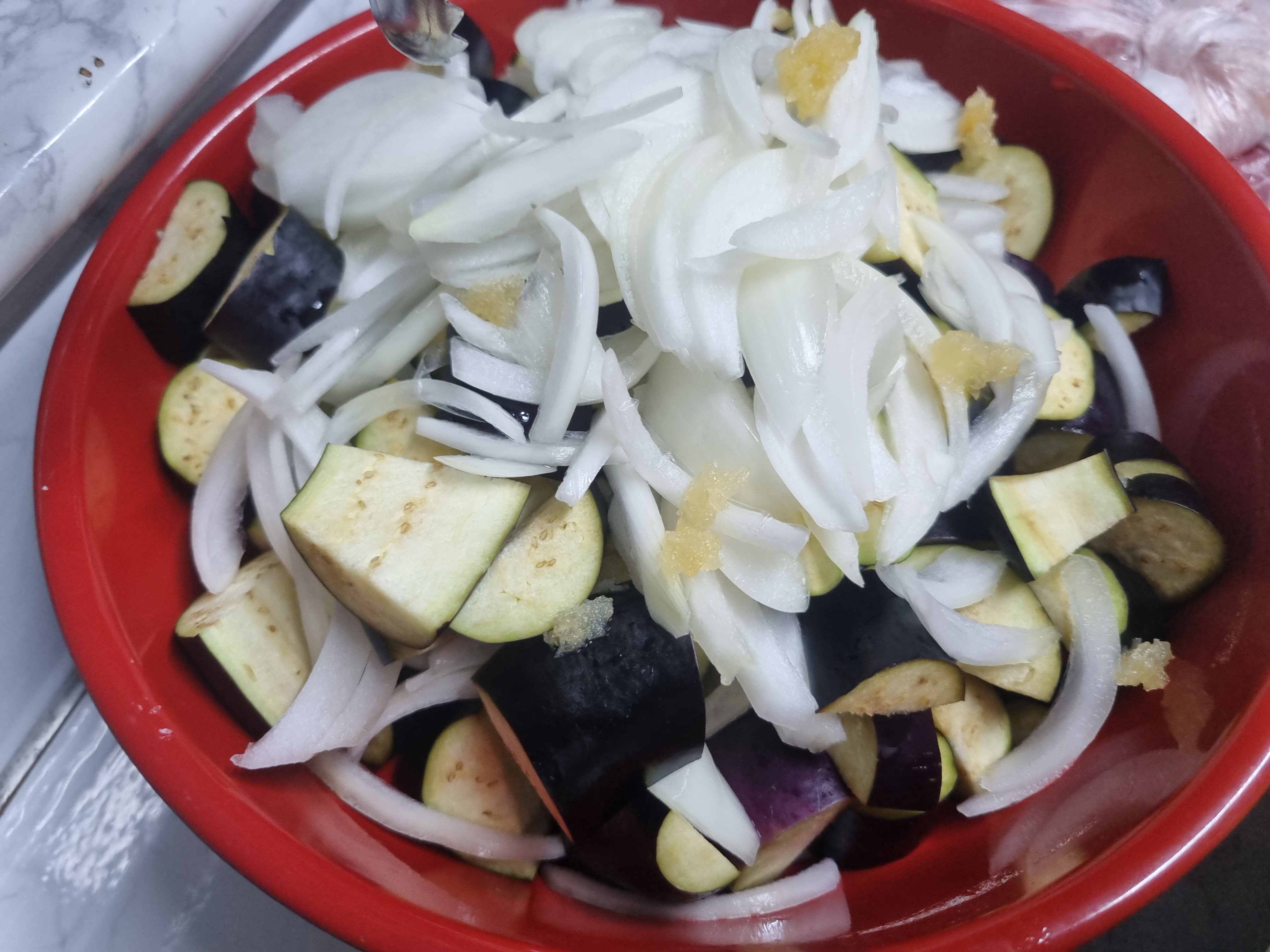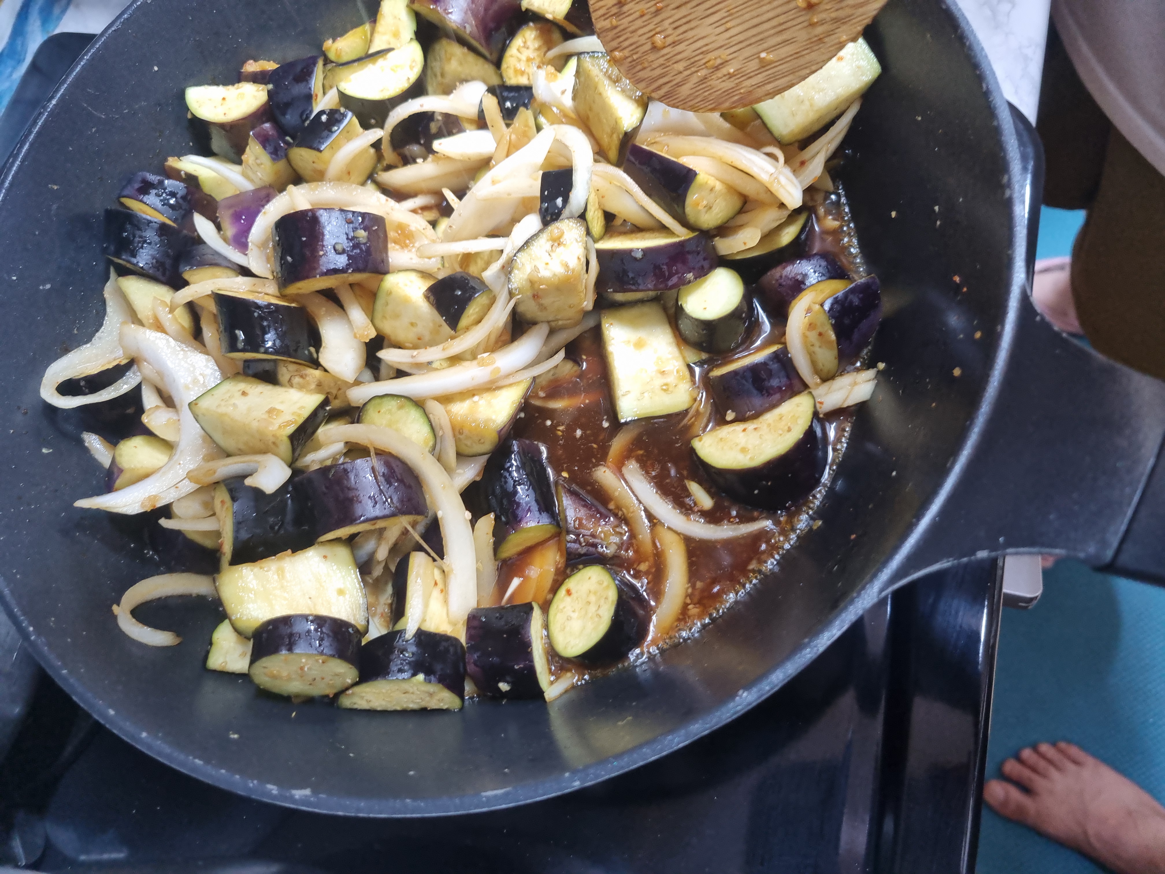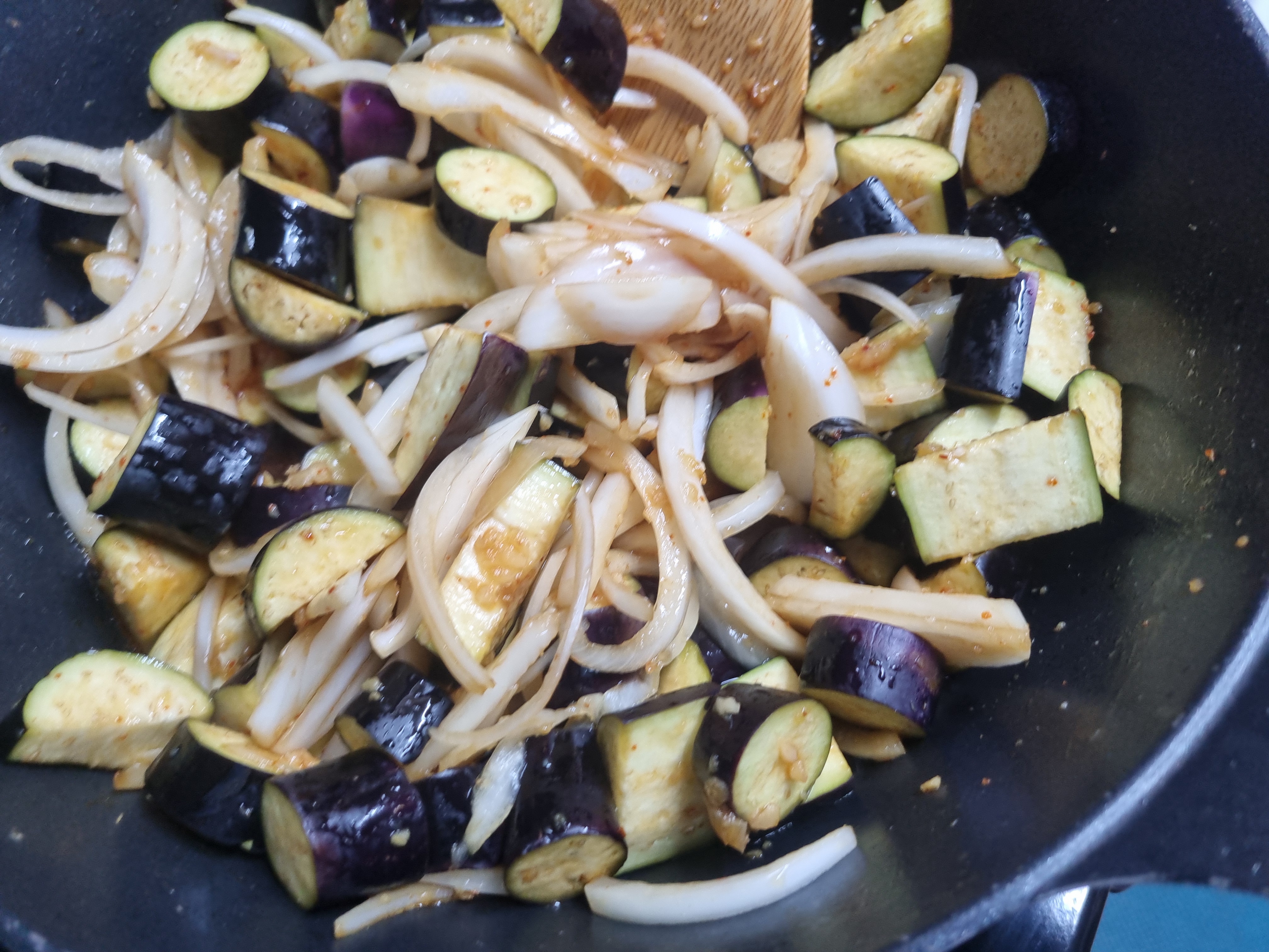 끓기 시작하면 바로 가지와 양파를 넣고 잘 혼합합니다.