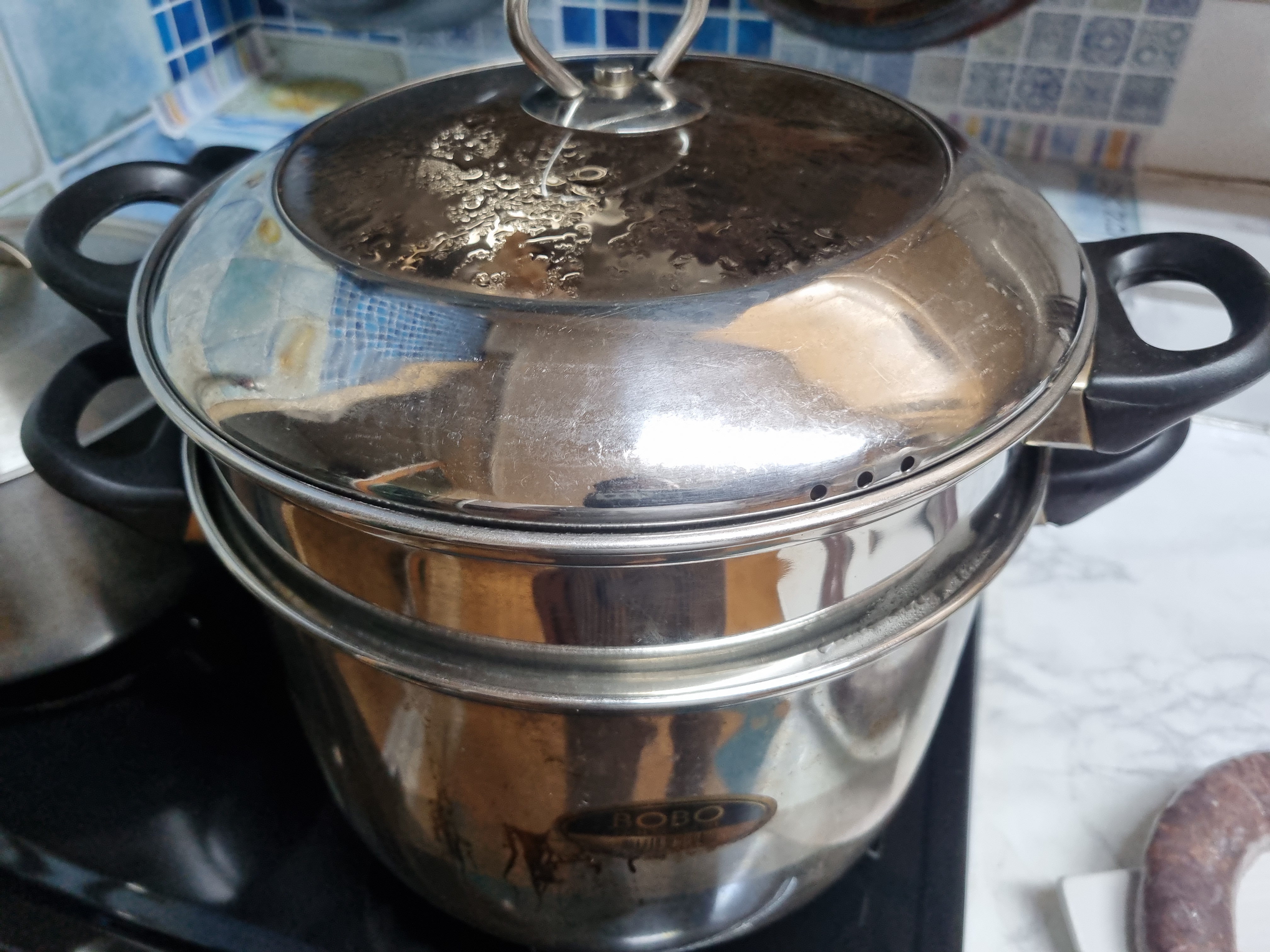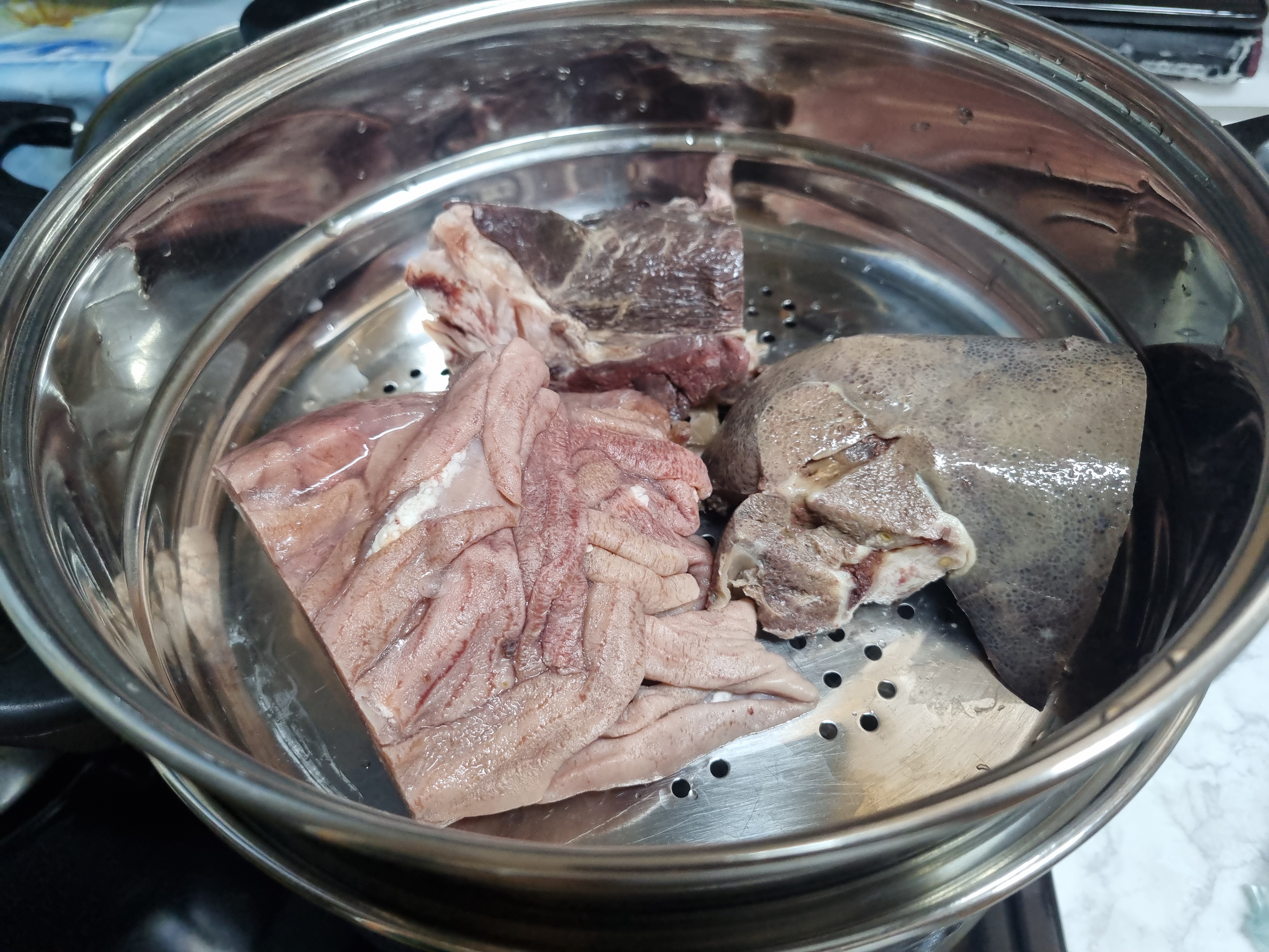 찜기에 데우는데 먼저 내장부터 조리하고 이어서 찰순대를 차례대로 데워 먹을 예정입니다.