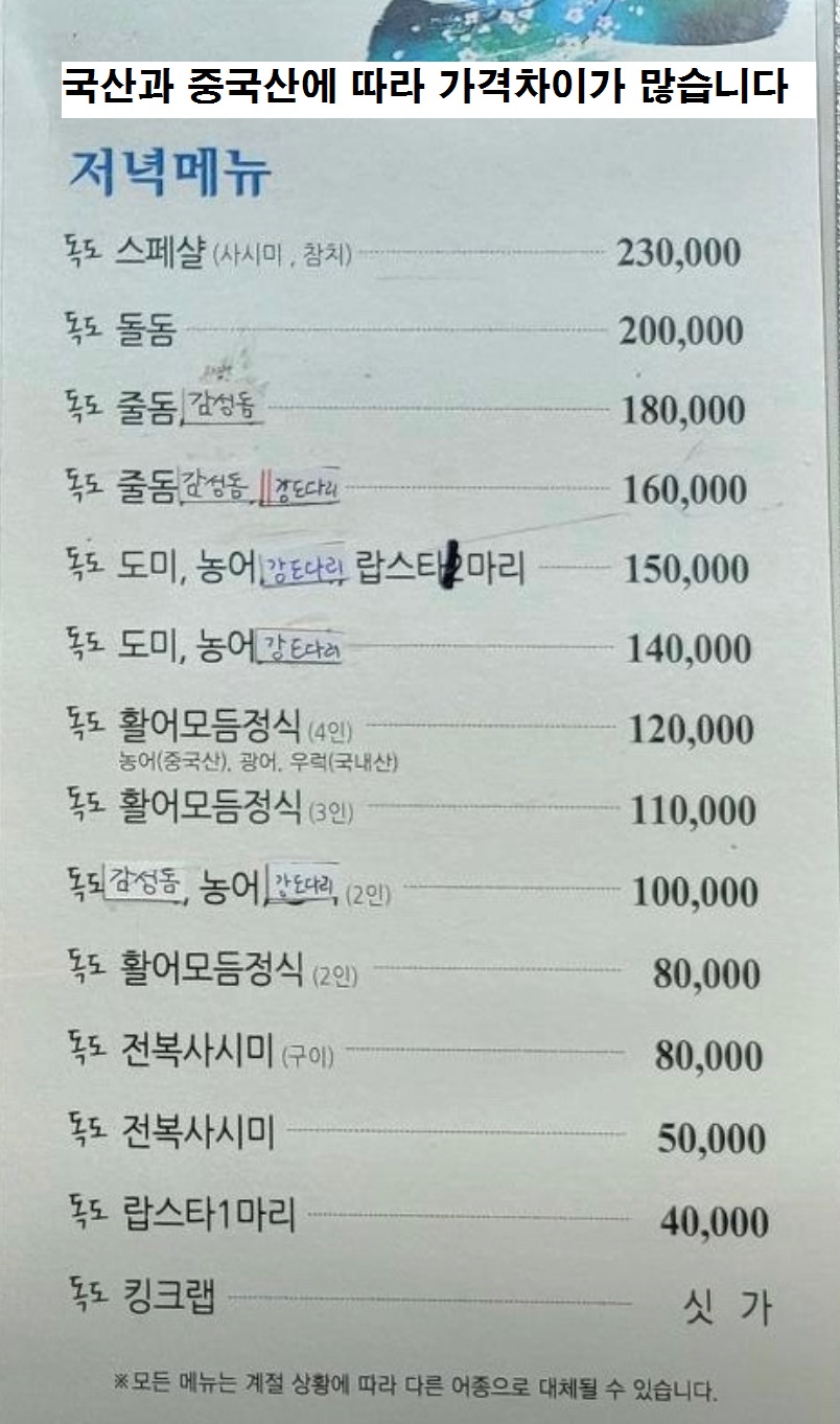 이것은 저녁 메뉴판이라고 하는데 점심때에도 위 메뉴판의 생선회는