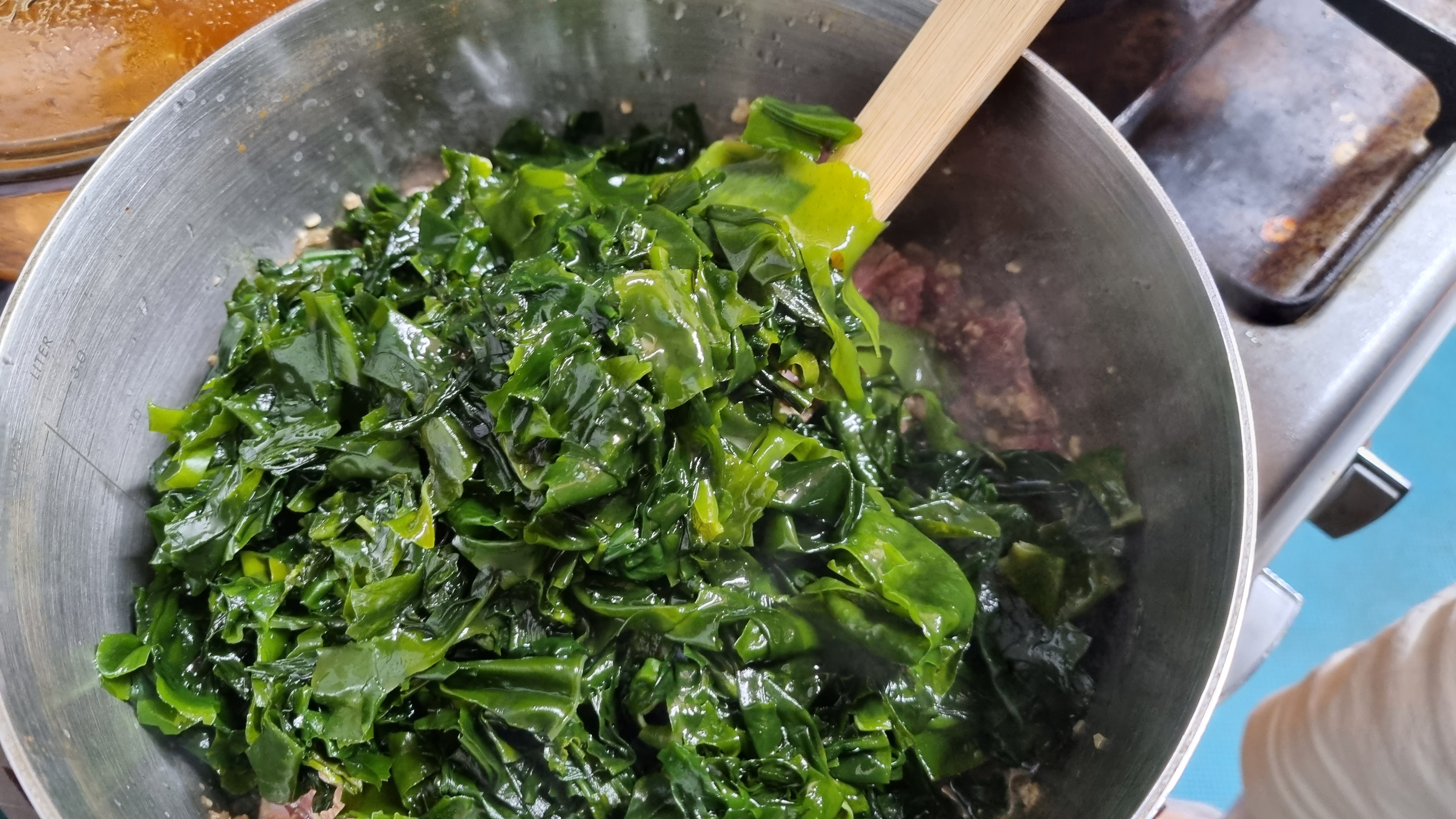 물끼를 최대한 빼준 미역을 소고기가 볶아져 있는 냄비에 그대로 담습니다