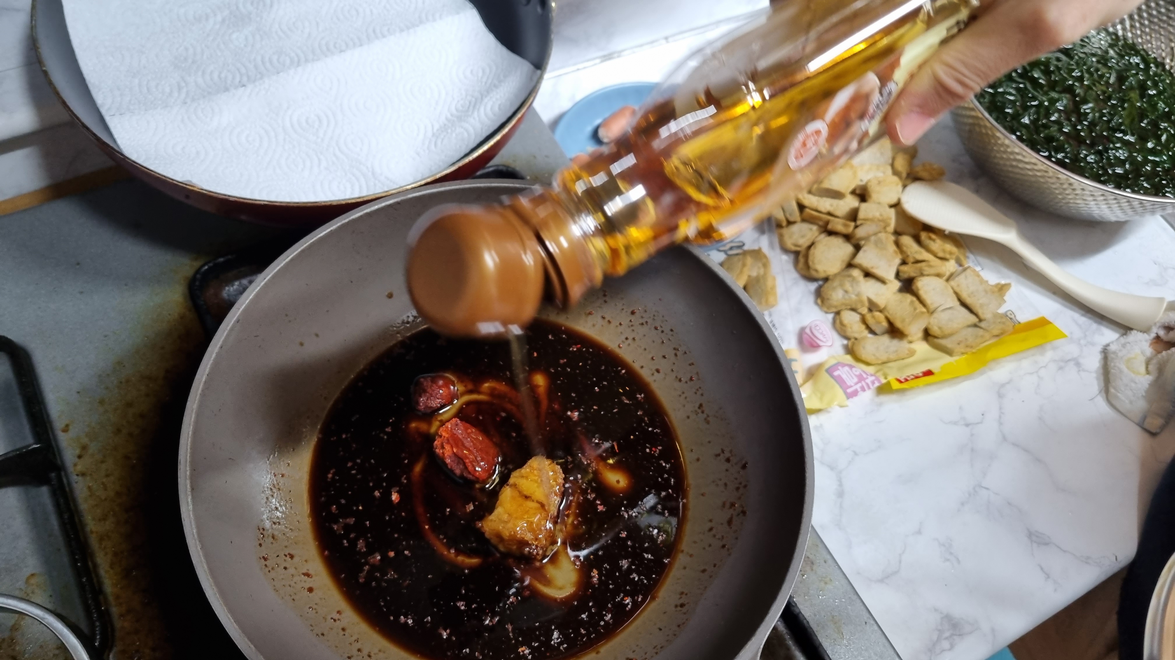 양념소스는 올리고당까지 넣은 후 물을 넣고 이어서 약 3분 정도 끓여줍니다