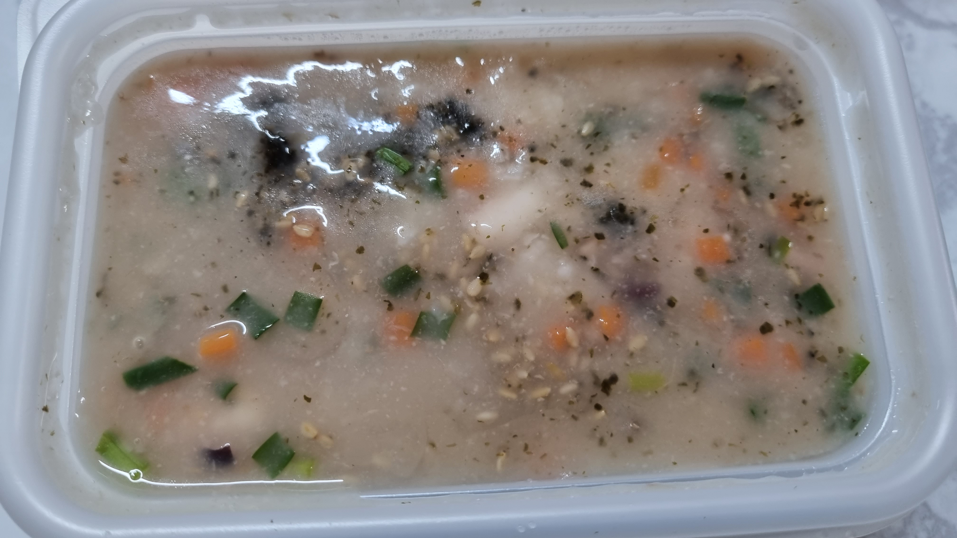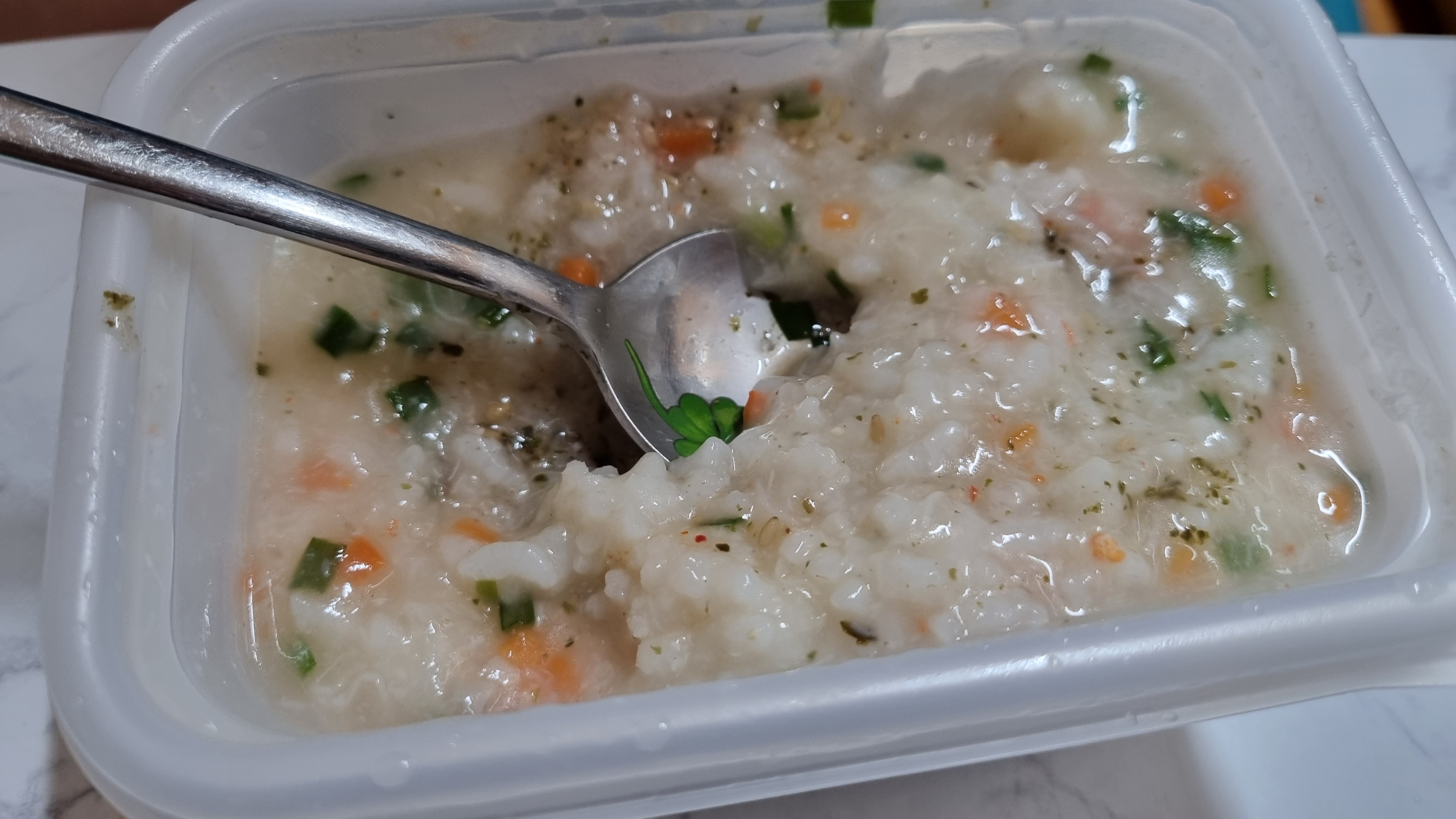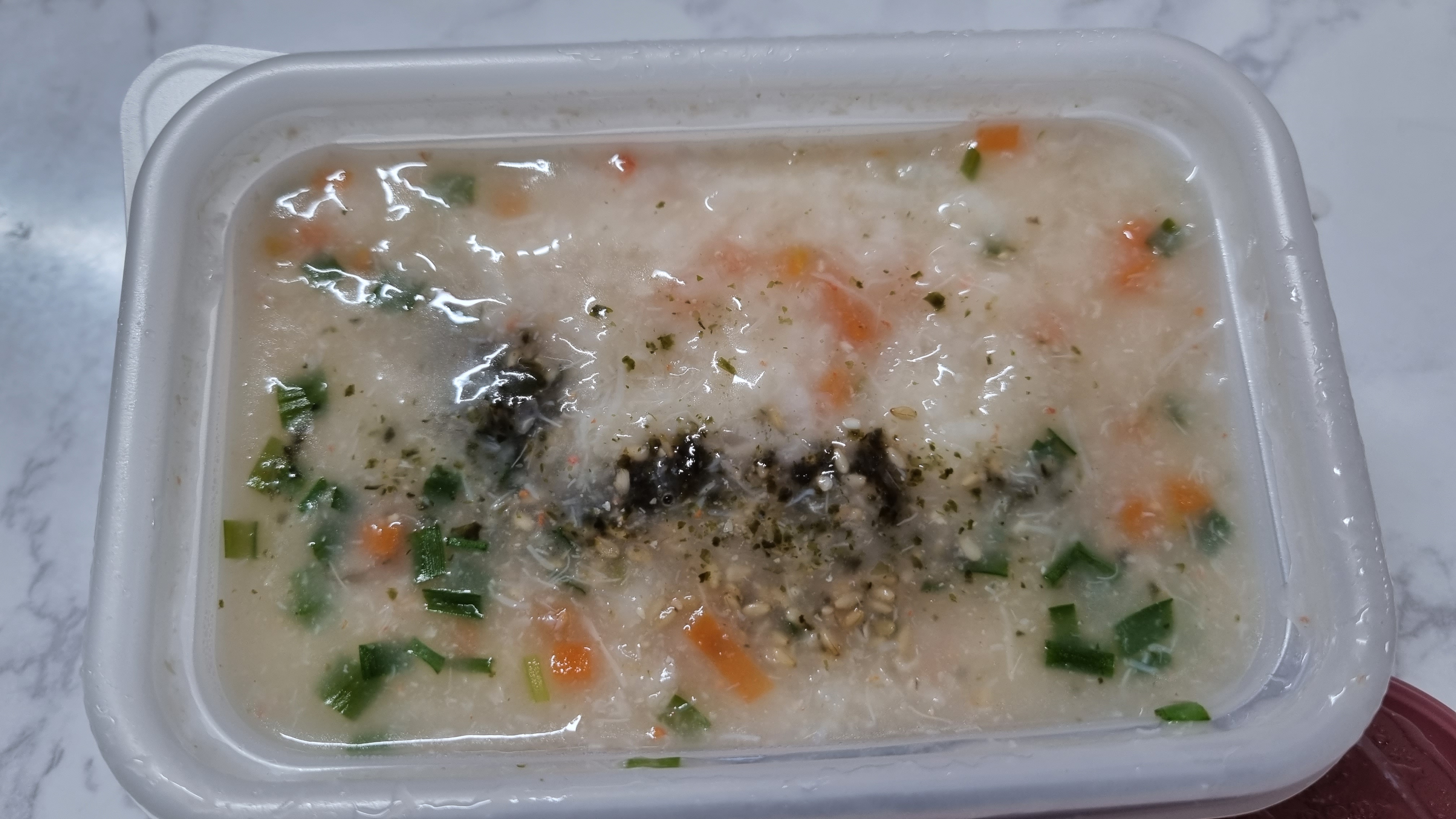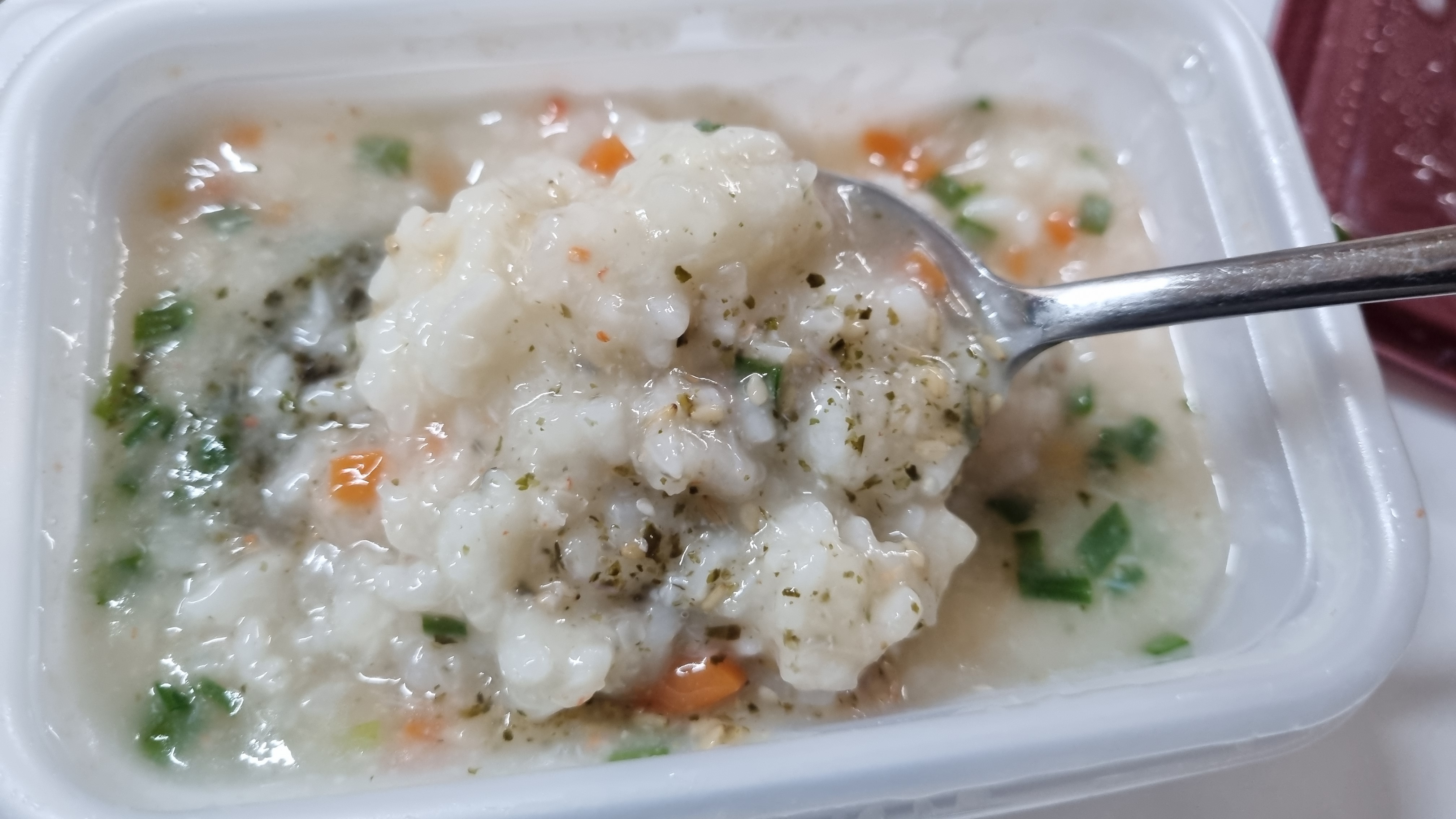 홍게품은 죽은 말 그대로 홍게살이 들어가 있는데 홍게가 많이 들어가 있지는 않지만 맛은 확실히 나고 가끔 씹히는 감촉은 있습니다. 애들 맛있다고 아주 잘 먹네요. 기존에 밥맛 없거나 그럴 때 치킨을 많이 사주는데 가끔씩은 이런 죽을 먹는 것도 좋은 것 같습니다.