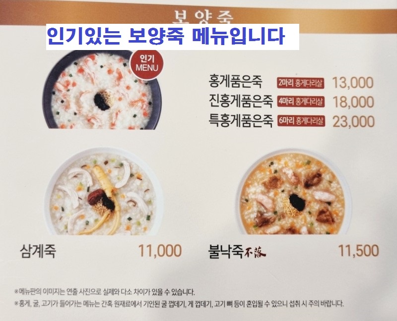 이곳의 메뉴는 9,500원에서 최대 2만 3천 원까지의 가격으로 용도나 좋아하는 것에 따라 골라 먹을 수 있는 메뉴가 정말 많이 있고 보양식으로도 괜찮은 메뉴가 많이 있어 이용하기 괜찮았습니다.