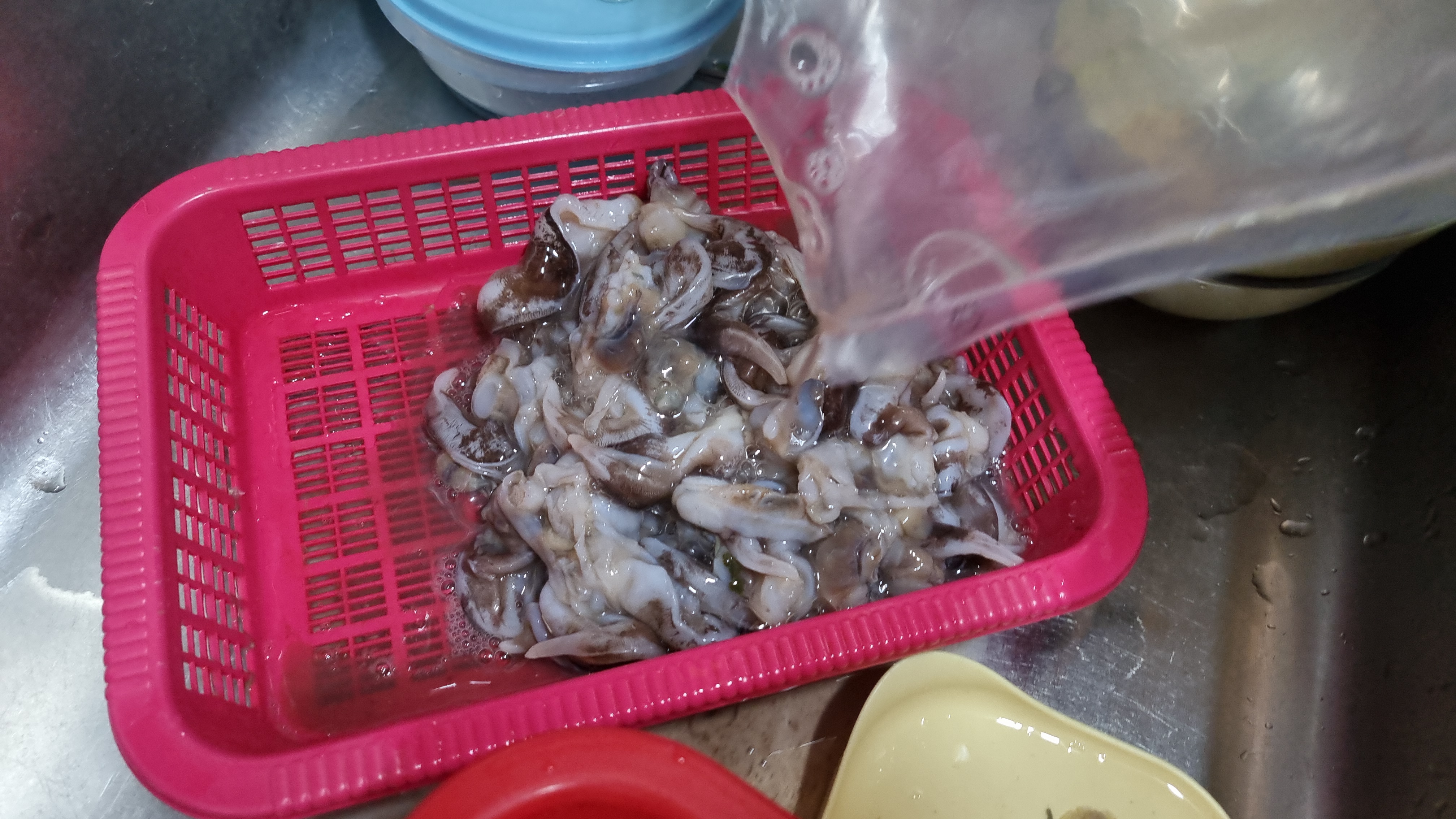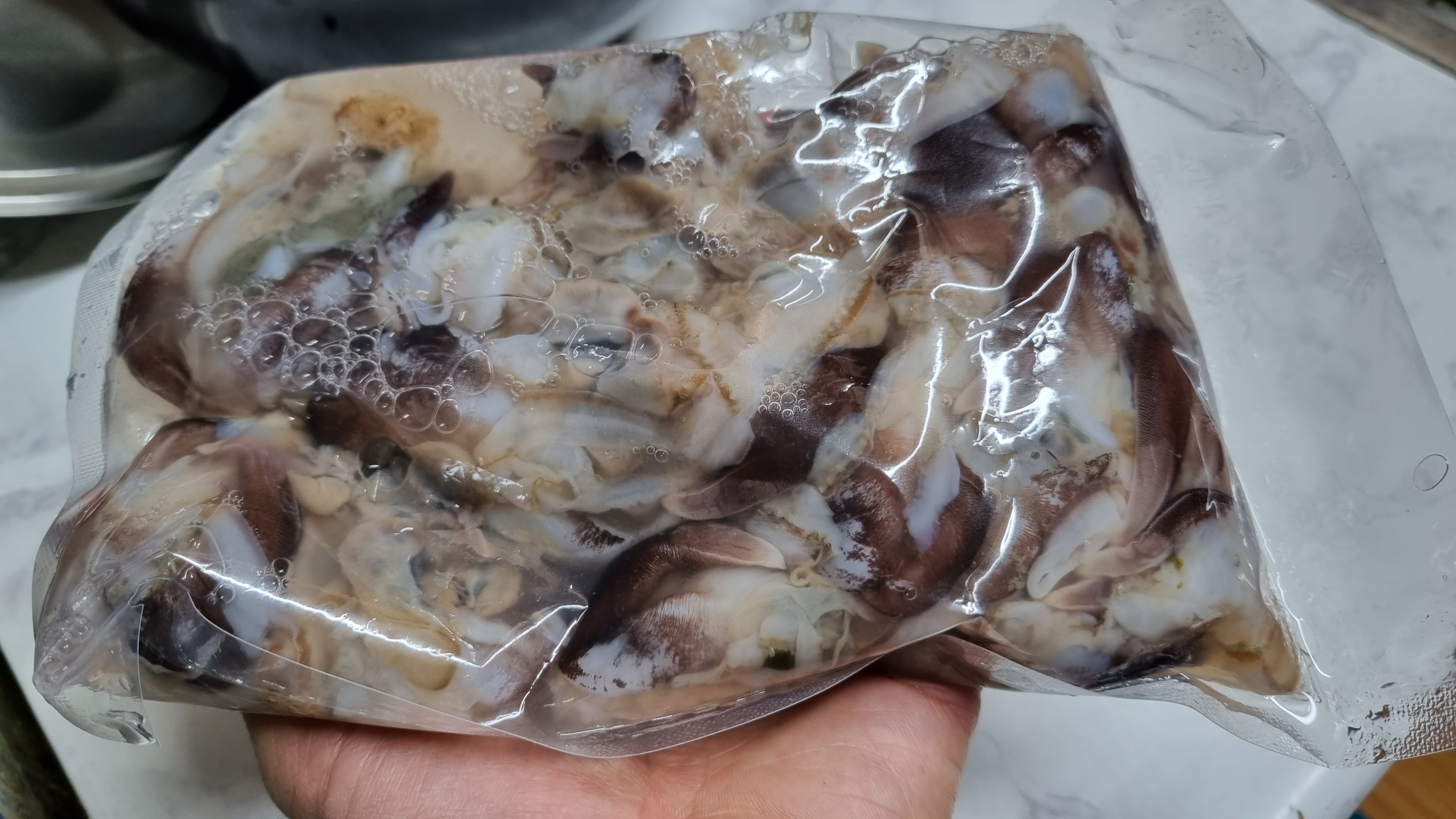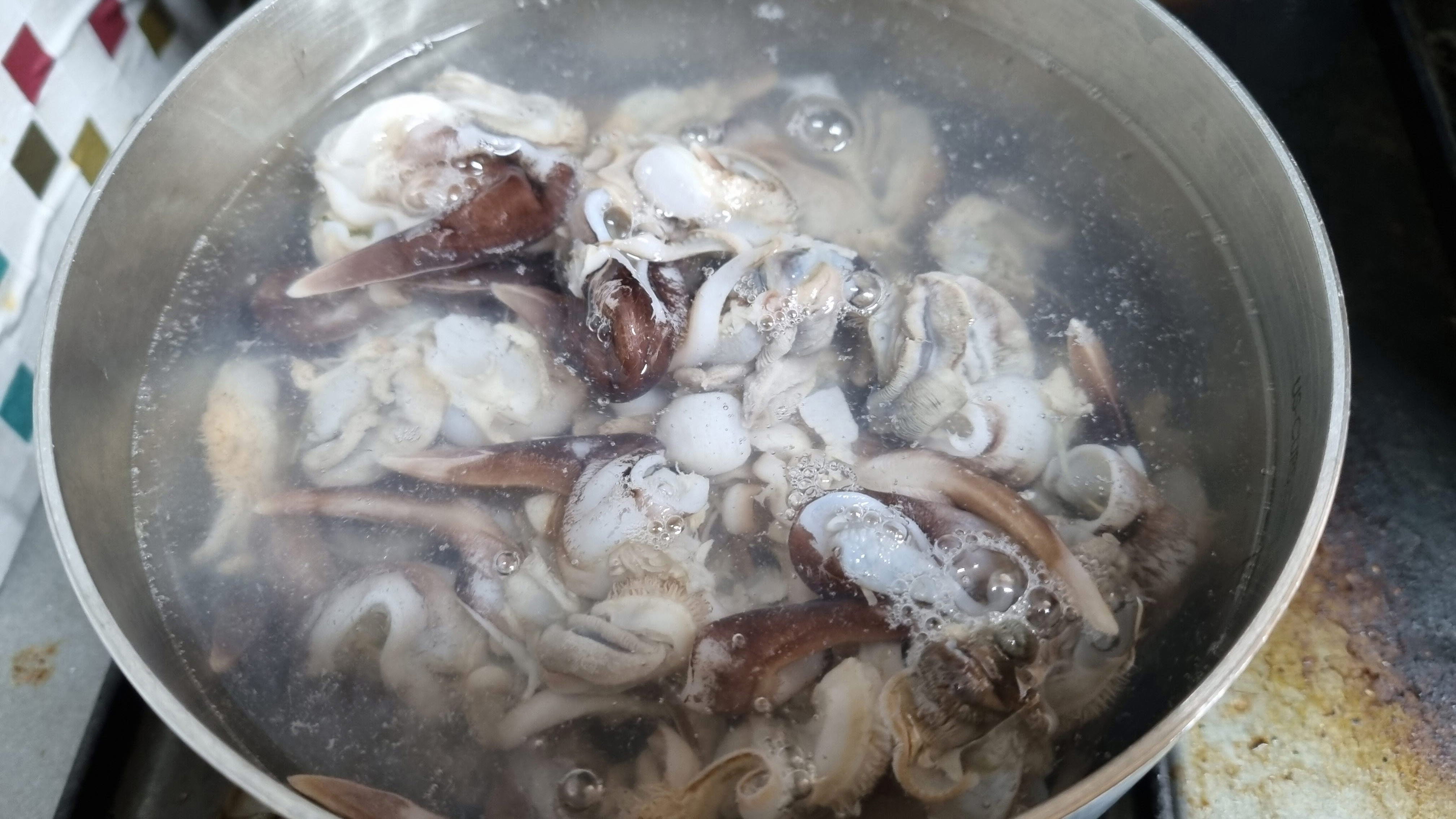 이미 껍질이 벗겨진 상태로 판매되는 경우가 대부분이라 해감은 별도로 필요 없고 손질은 2~3회 수돗물로 씻어주면 충분합니다. 이물질등이 없어 비교적 깨끗한 편이고 또한 데치면서 한 번도 씻어지 효과가 있어 손질은 간단합니다.