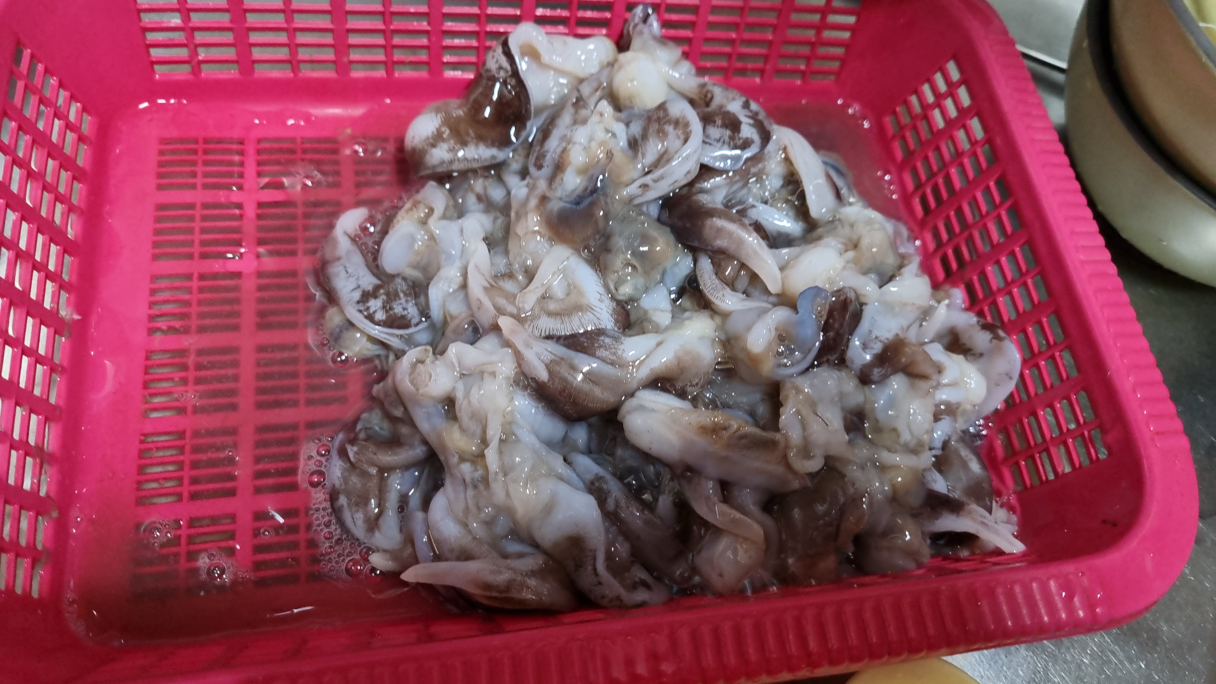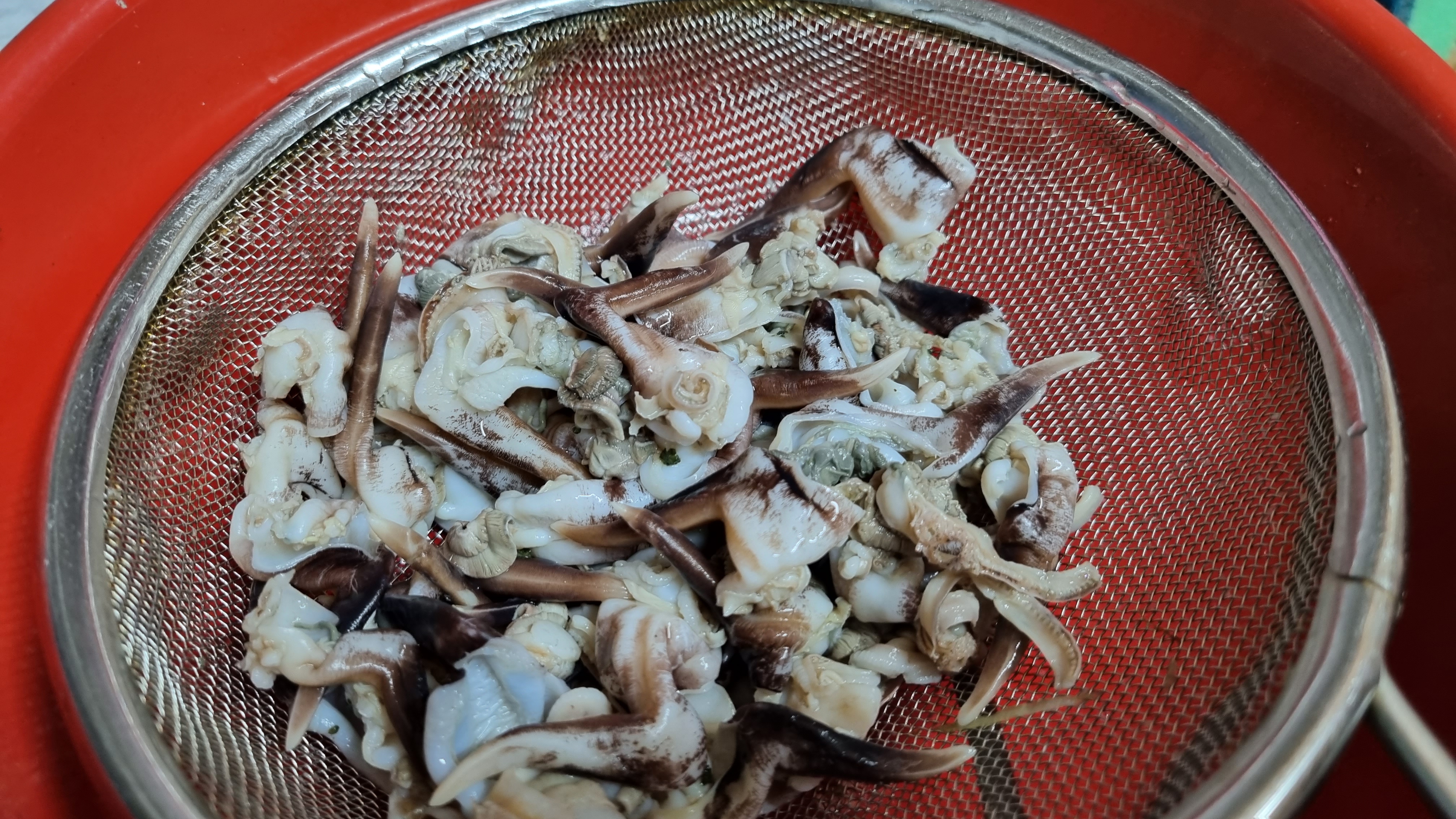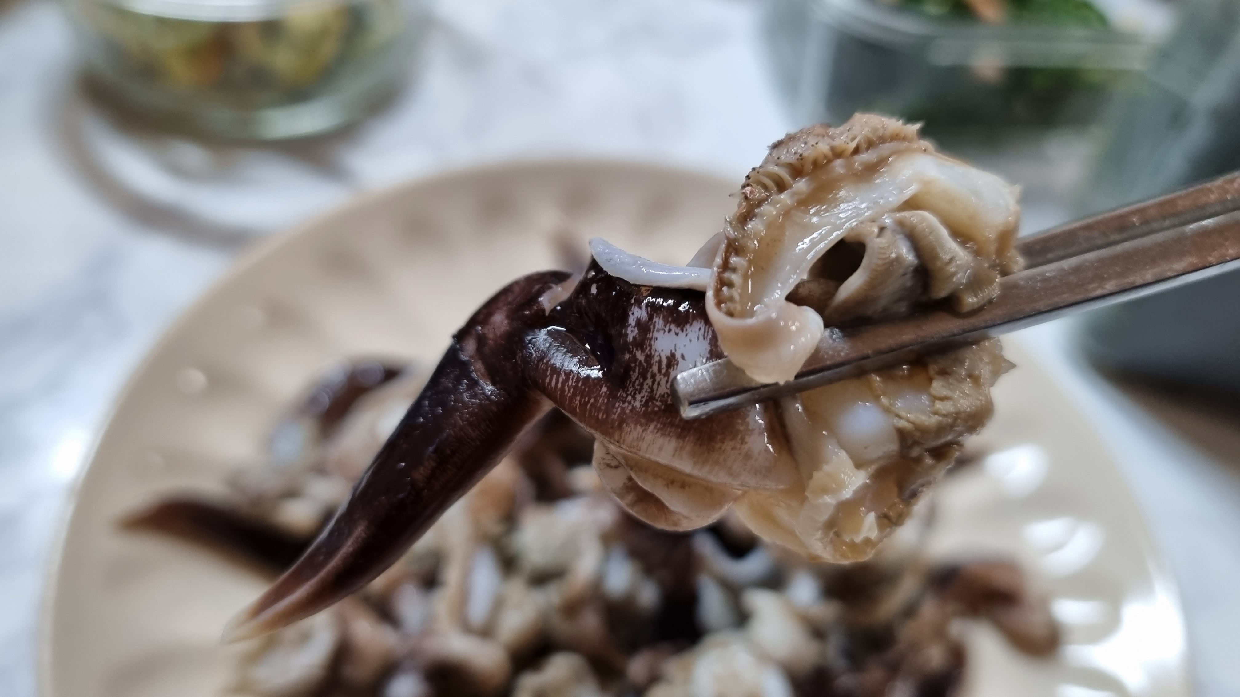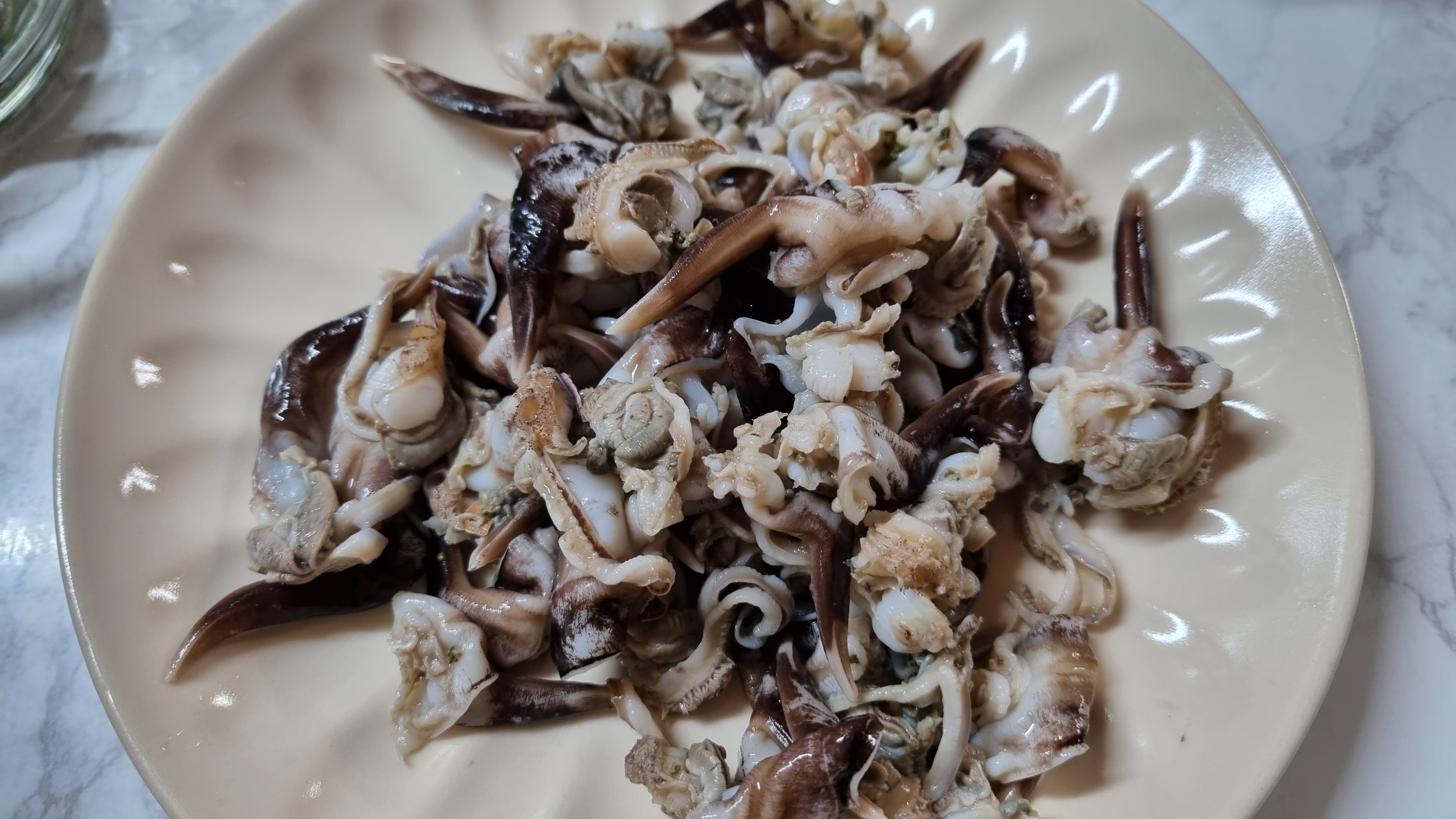 이미 껍질이 벗겨진 상태로 판매되는 경우가 대부분이라 해감은 별도로 필요 없고 손질은 2~3회 수돗물로 씻어주면 충분합니다. 이물질등이 없어 비교적 깨끗한 편이고 또한 데치면서 한 번도 씻어지 효과가 있어 손질은 간단합니다.