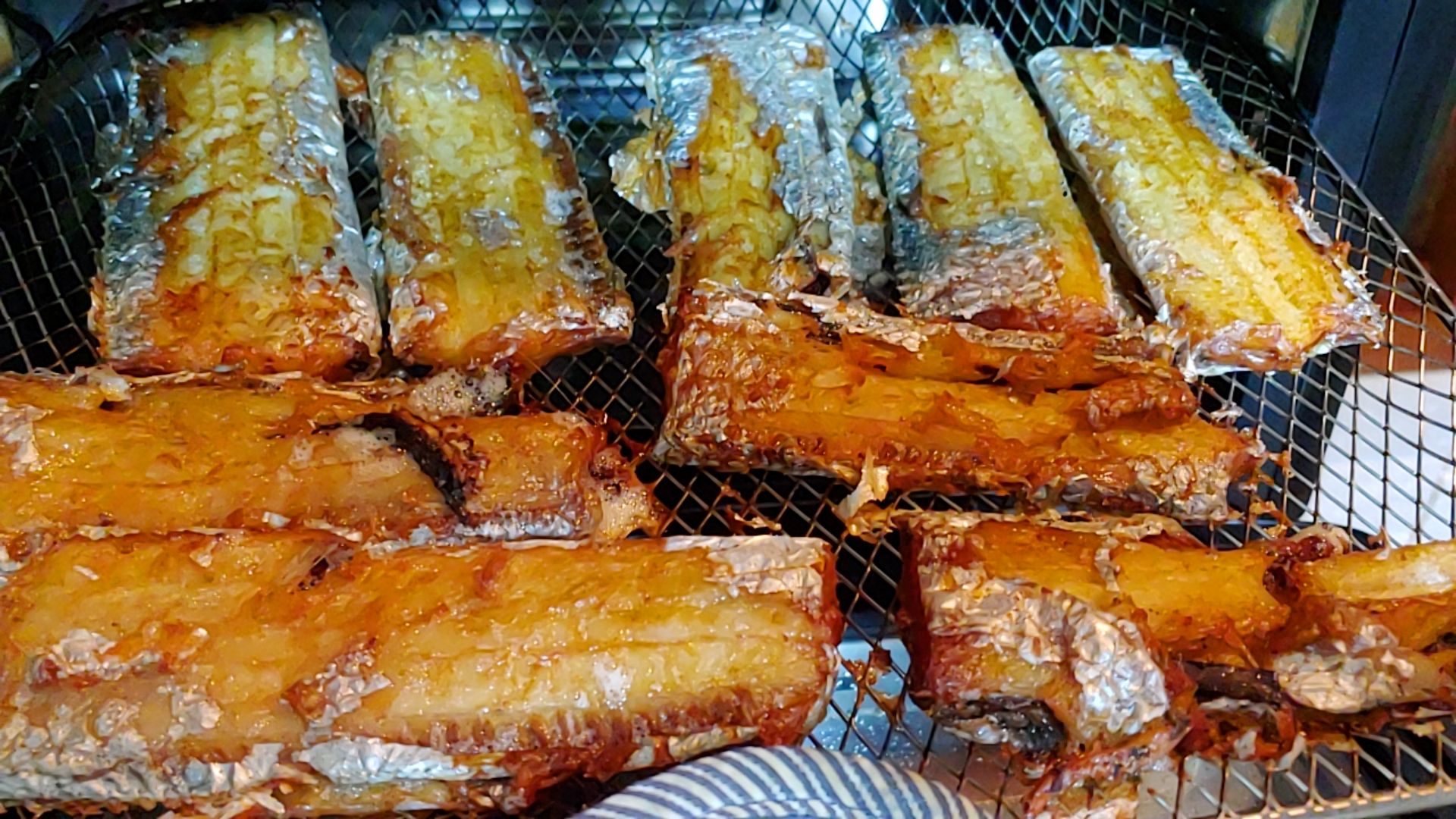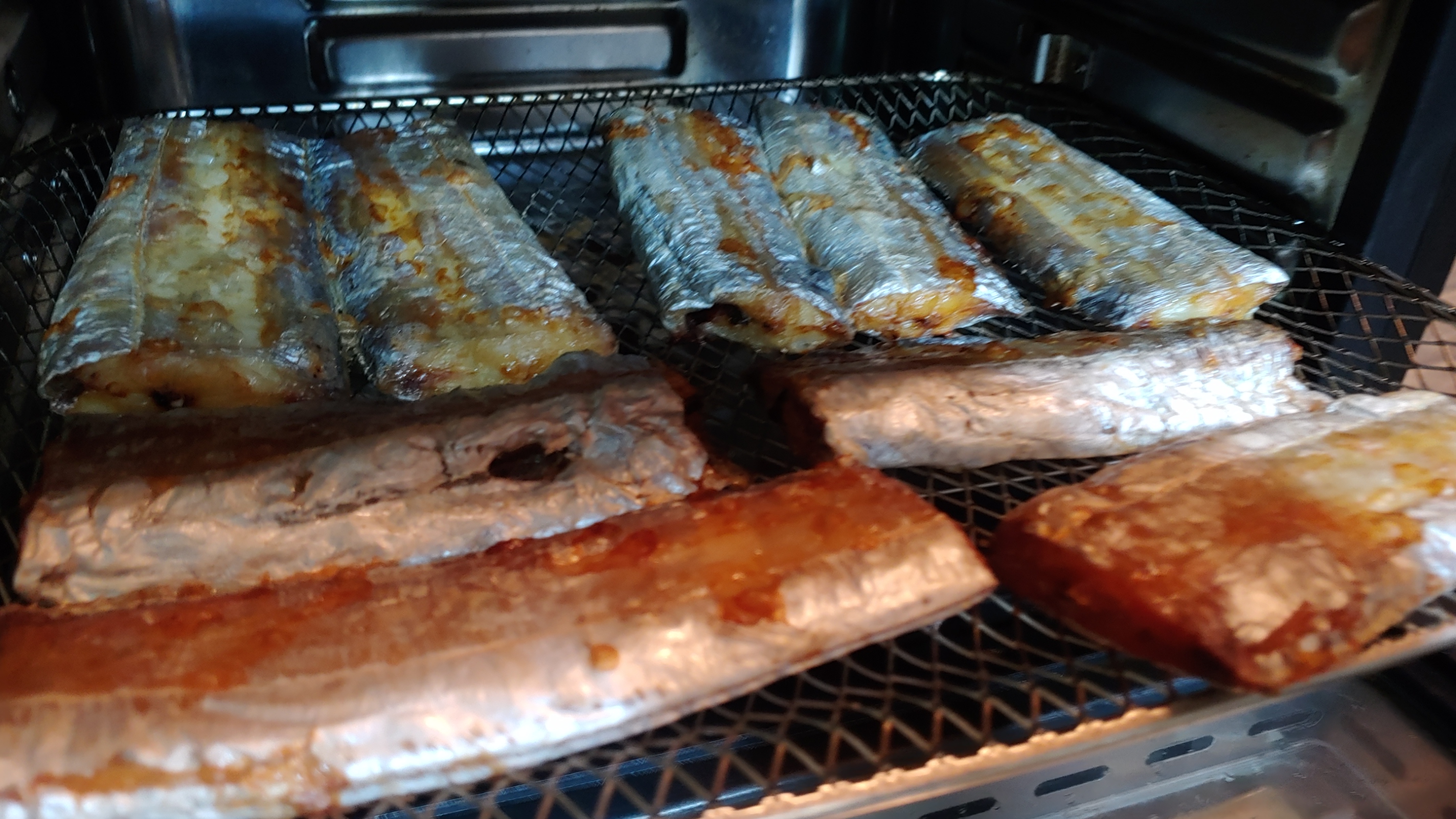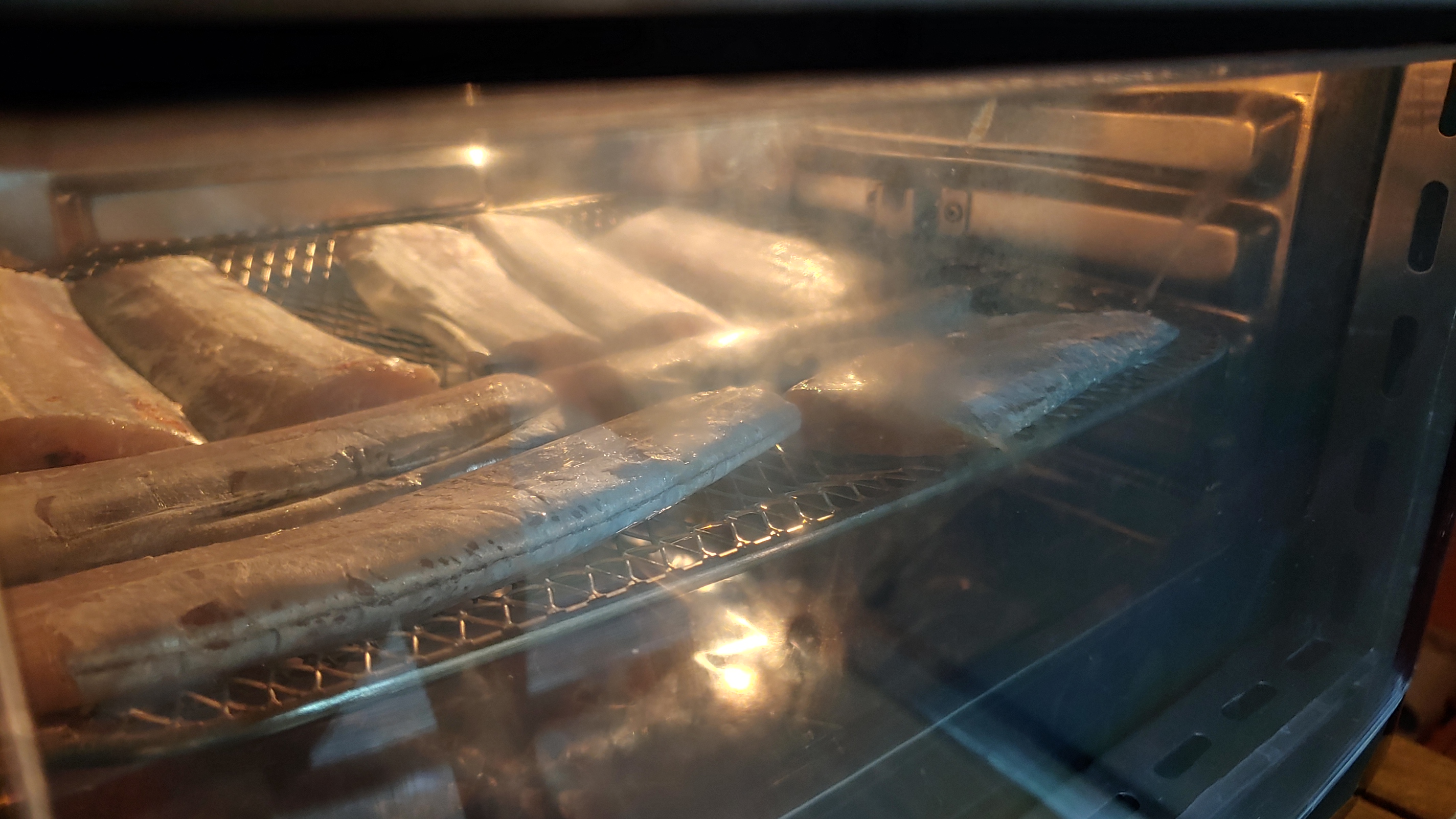 가지런히 그릴에 놓인 갈치를 에어프라이어에 넣습니다