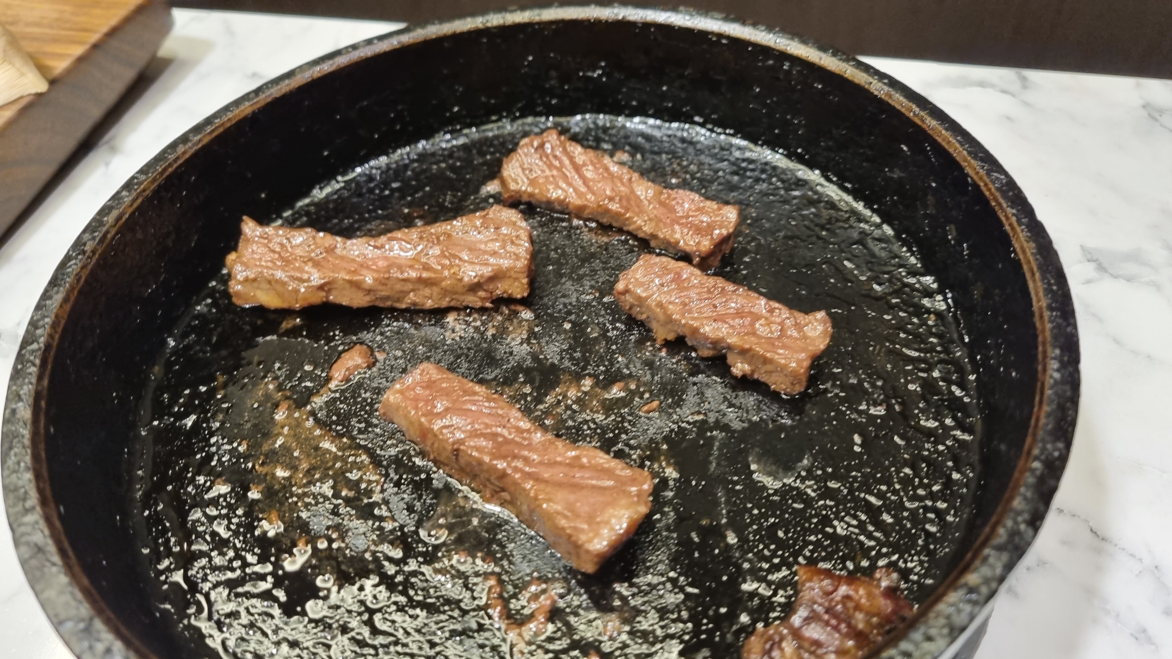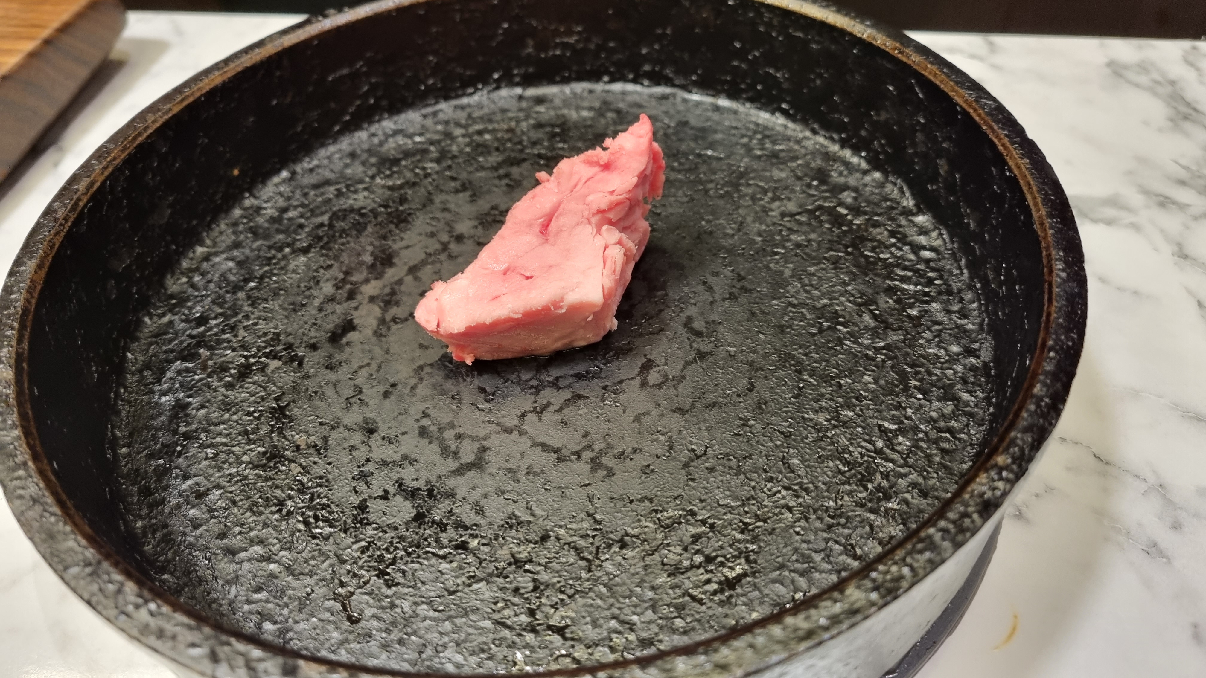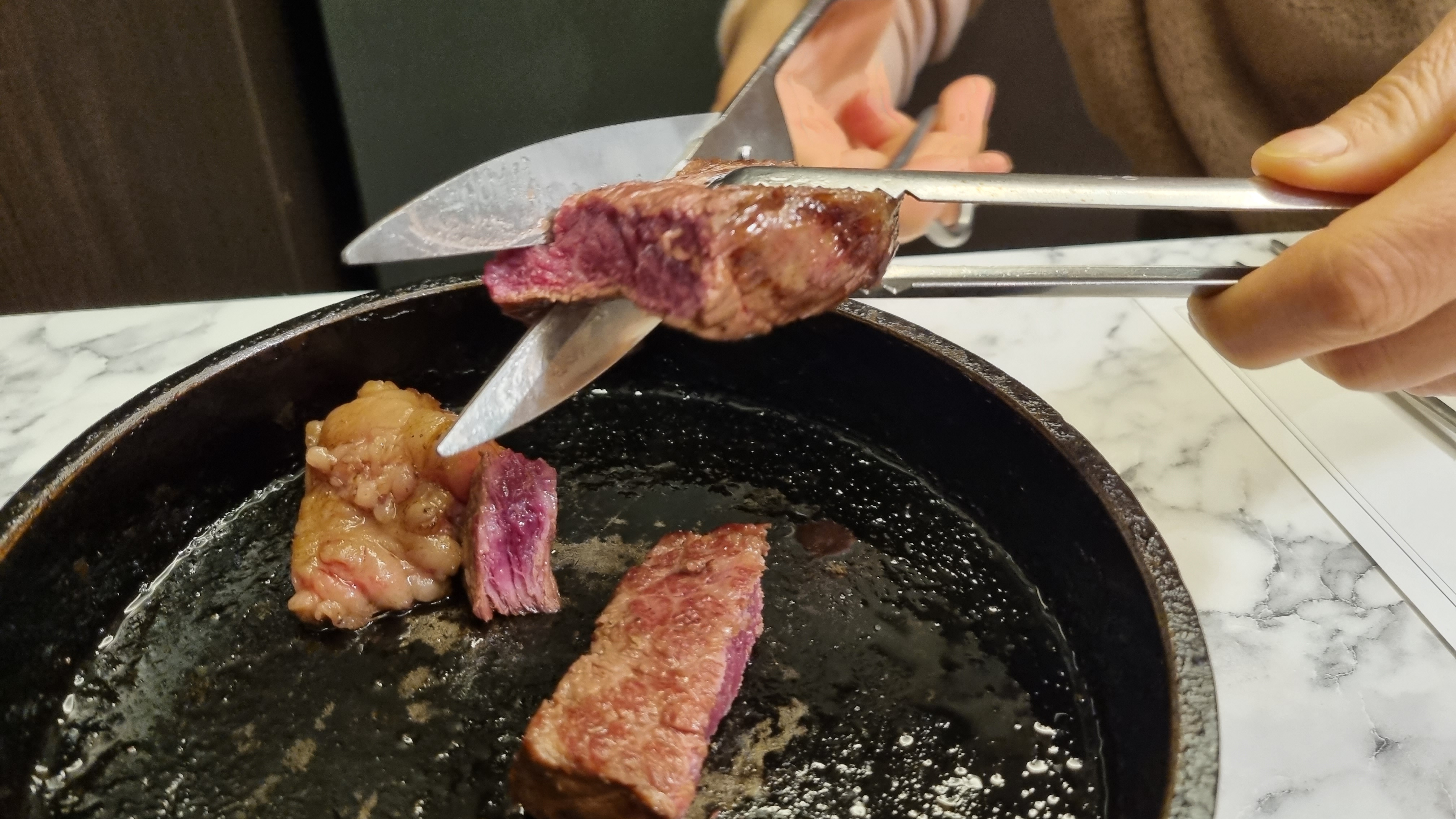 소고기가 이렇게 덩어리로 나옵니다. 주방에서 도마를 가지고 직접 나와 썰어주는데 고기는 초벌구이가 되어있습니다. 요리사가 큼직하게 기본으로 썰어주고 인덕션에 굽는 방법과 먹는 법을 가르쳐주고 나갑니다.