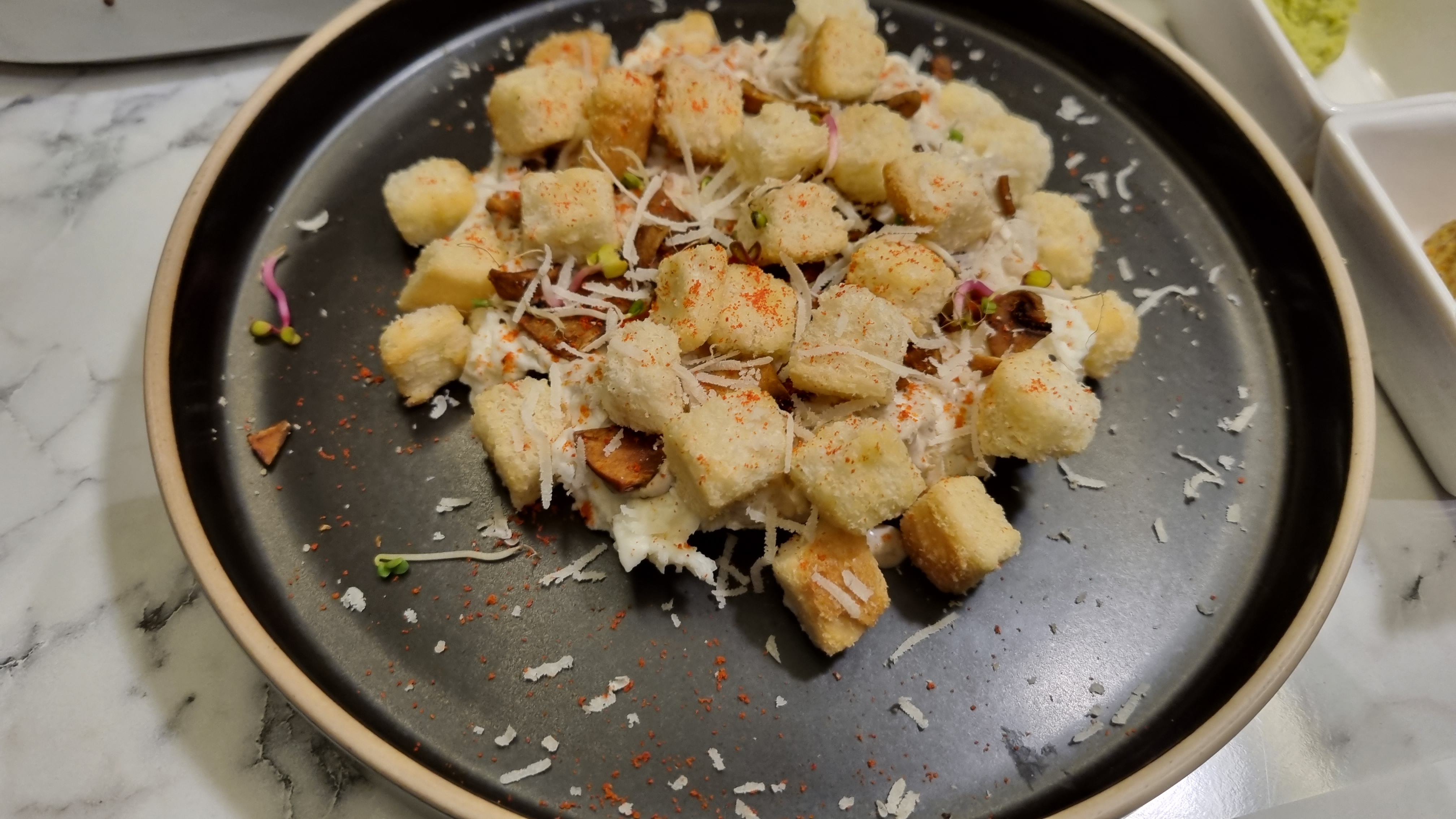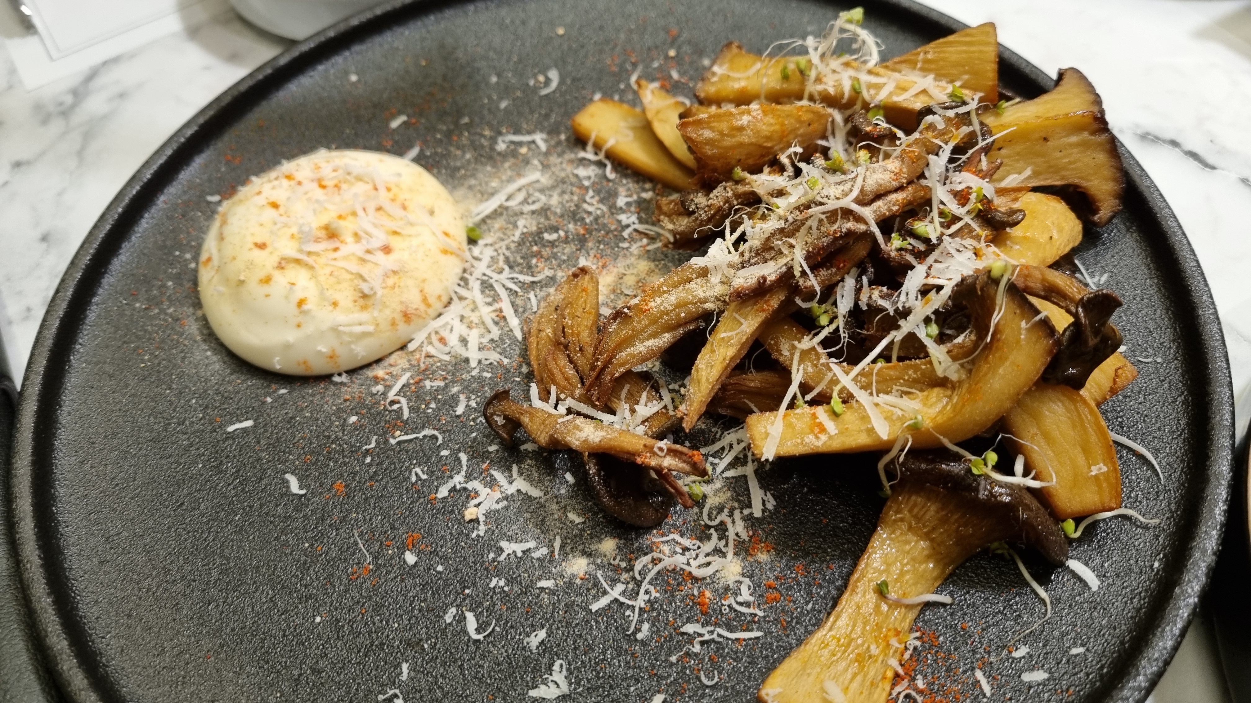 마지막으로 나온 기본 요리로 버섯샐러드인데. 육회 다음을 맛있게 먹었습니다. 말 그대로 소고기 씹는 맛이며 양념이나 간이 적절히 들어가 먹기에 부담 없이 좋았습니다.