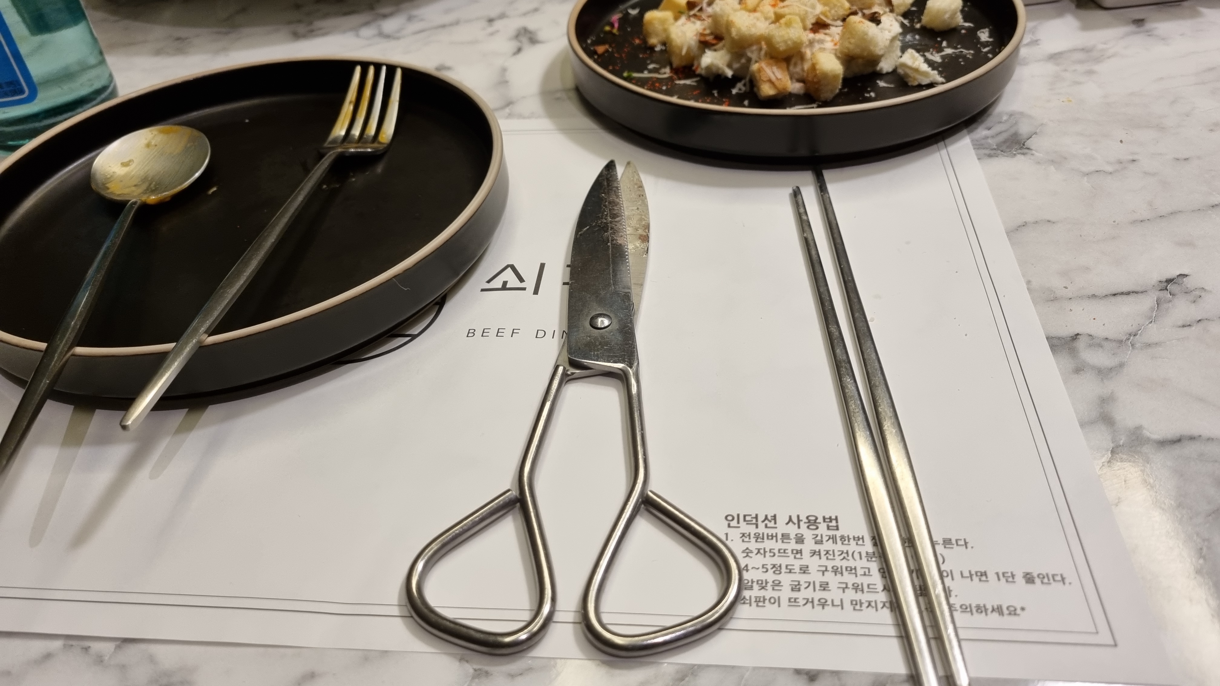 개인별로 이렇게 집게와 가위가 나와 고기를 추가로 먹기 좋게 잘라 더 굽습니다. 먹는 방법이 다른 곳과 비교 특이하기는 하고 재미도 있습니다.