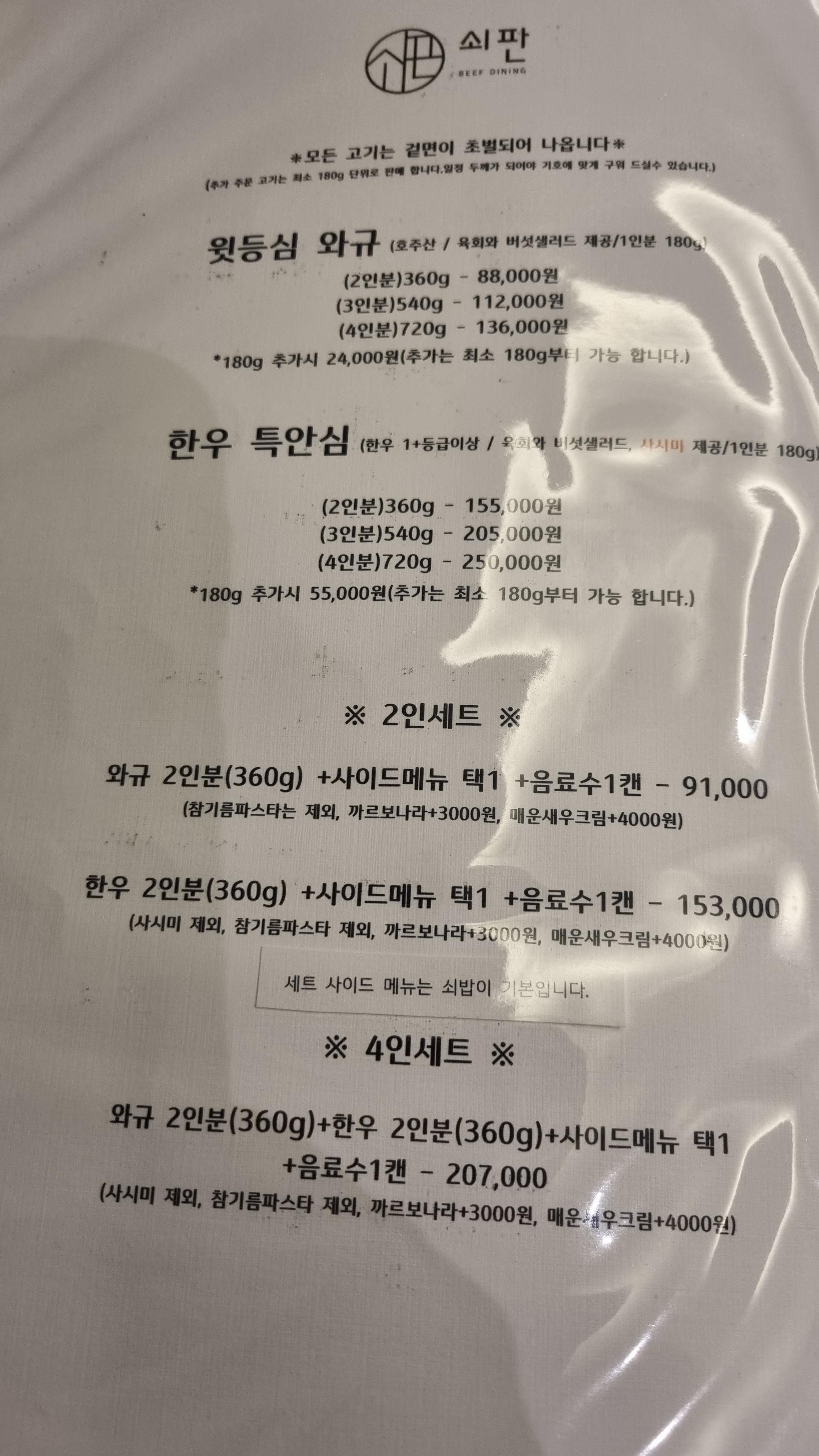 이렇게 판매되며 180g 추가시 24,000원입니다. 또한 위의 메뉴에 세트가 있는데 사이드메뉴를 까르보나라 또는 매운 새우크림을 선택 하여 2인 기준 91,000원인데 우리는 2인이 가서 91,000원 메뉴로 주문하였습니다.