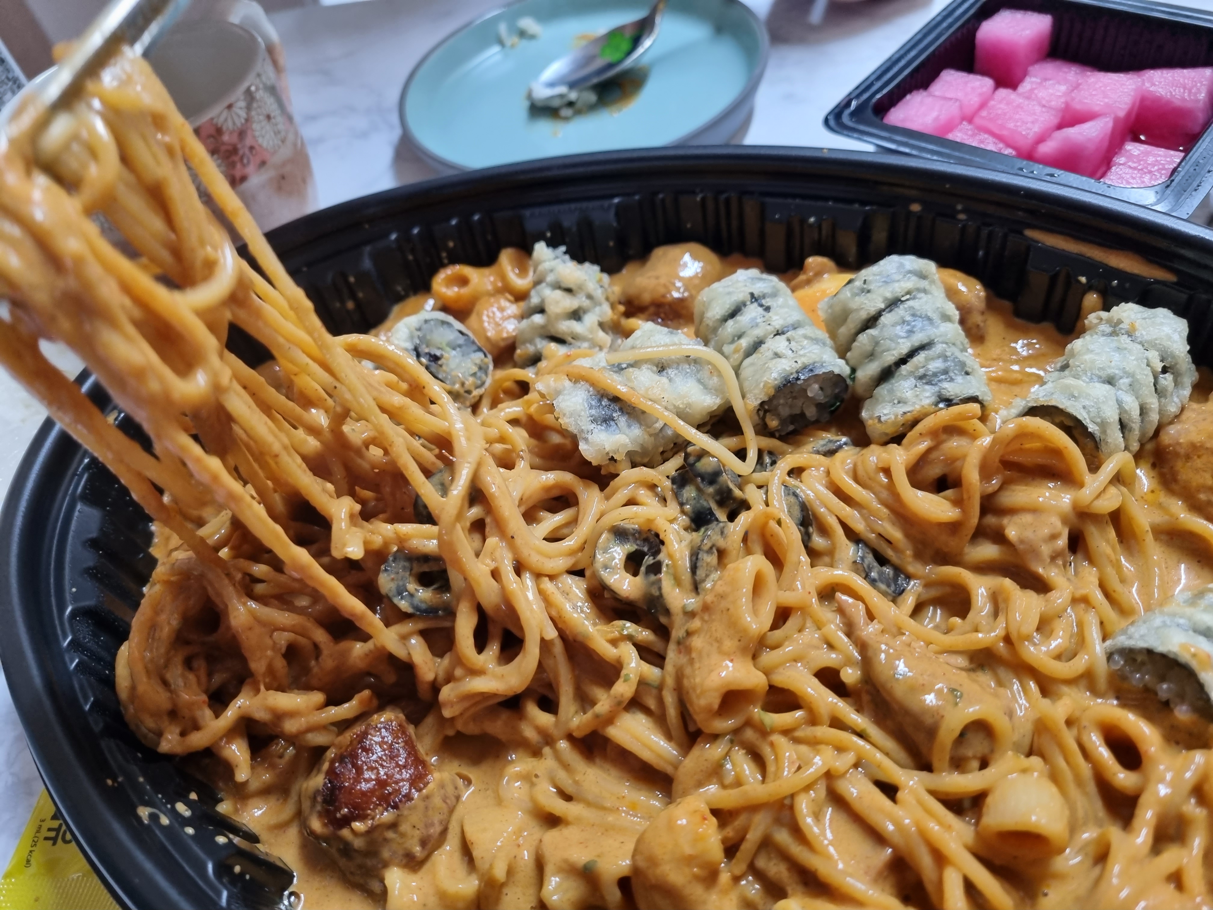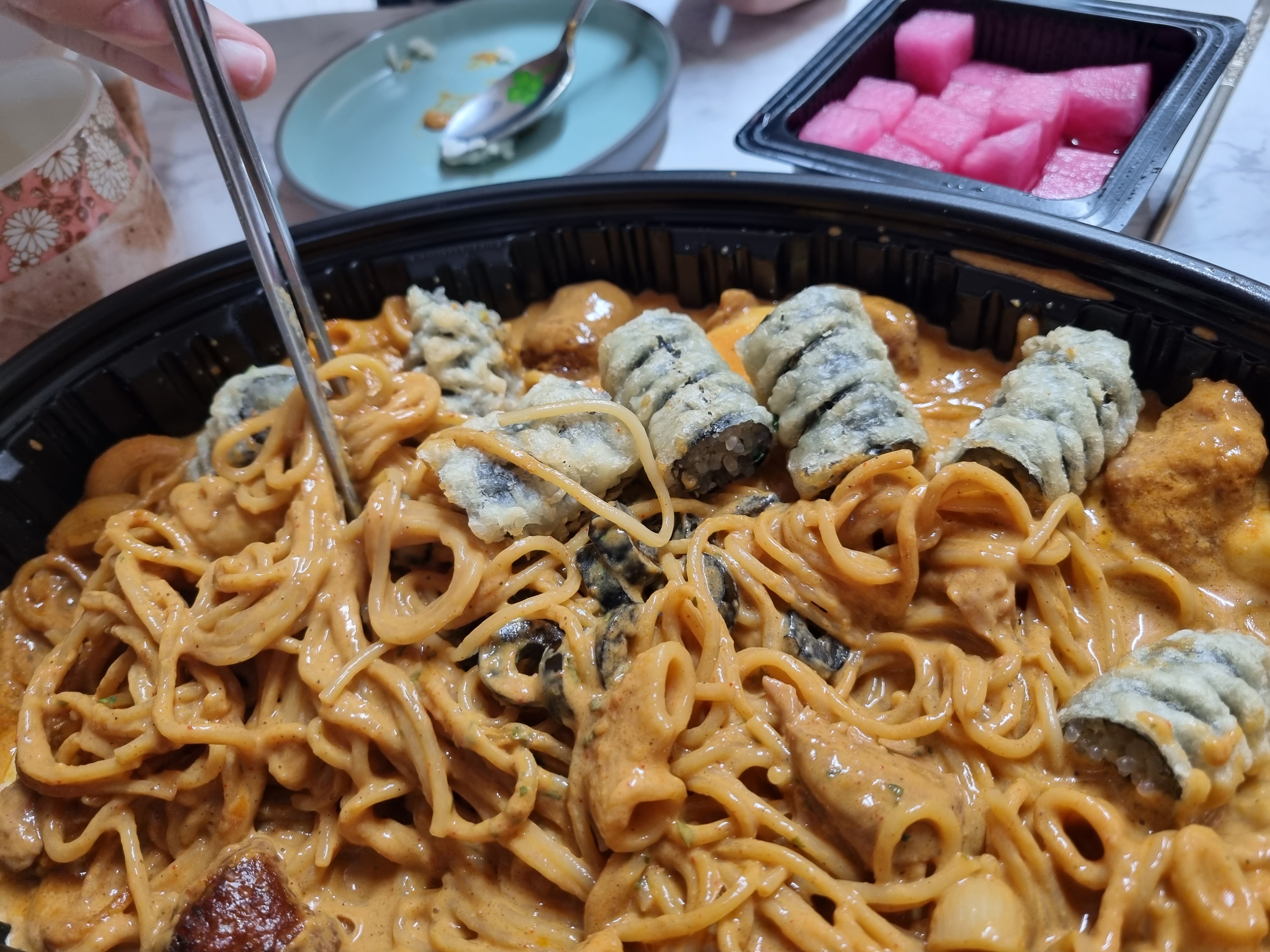 롱긴말이는 그냥 먹어도 맛있는데 매콤한 로제소스와 먹기 위해 찜닭에 잘게 썰어서 넣었습니다. 분식집에서 튀김을 떡볶이에 섞어먹는 것과 동일합니다.