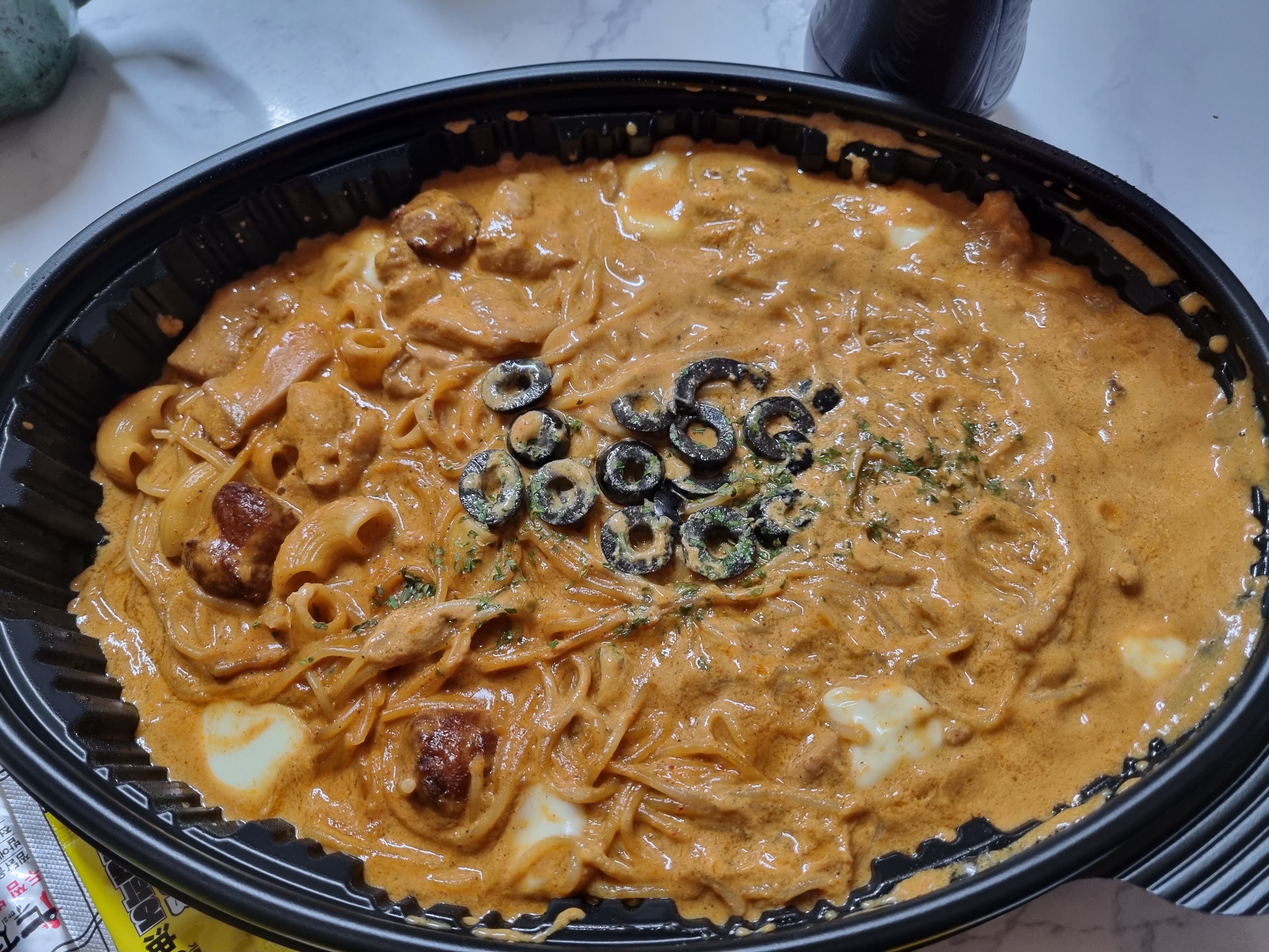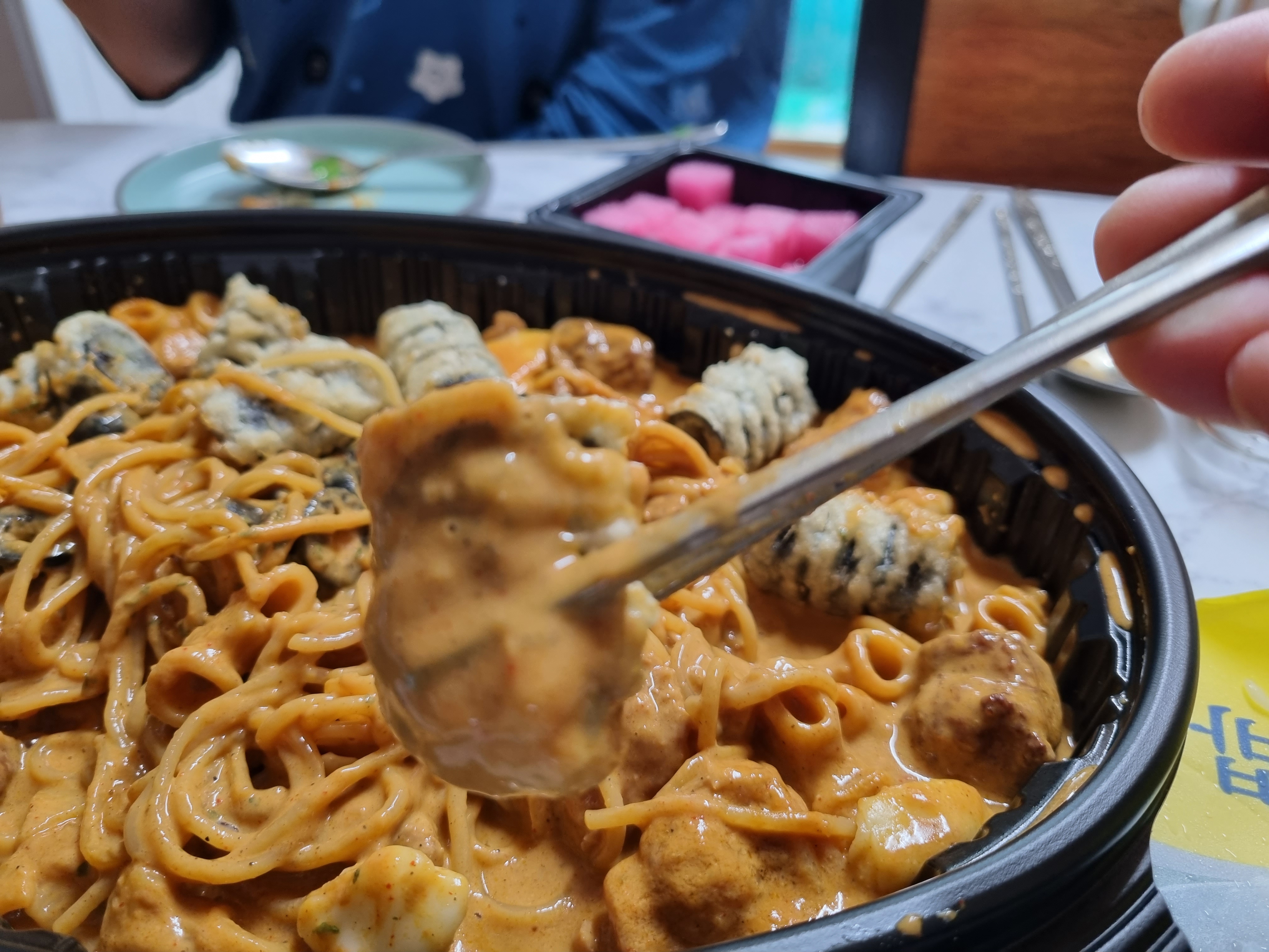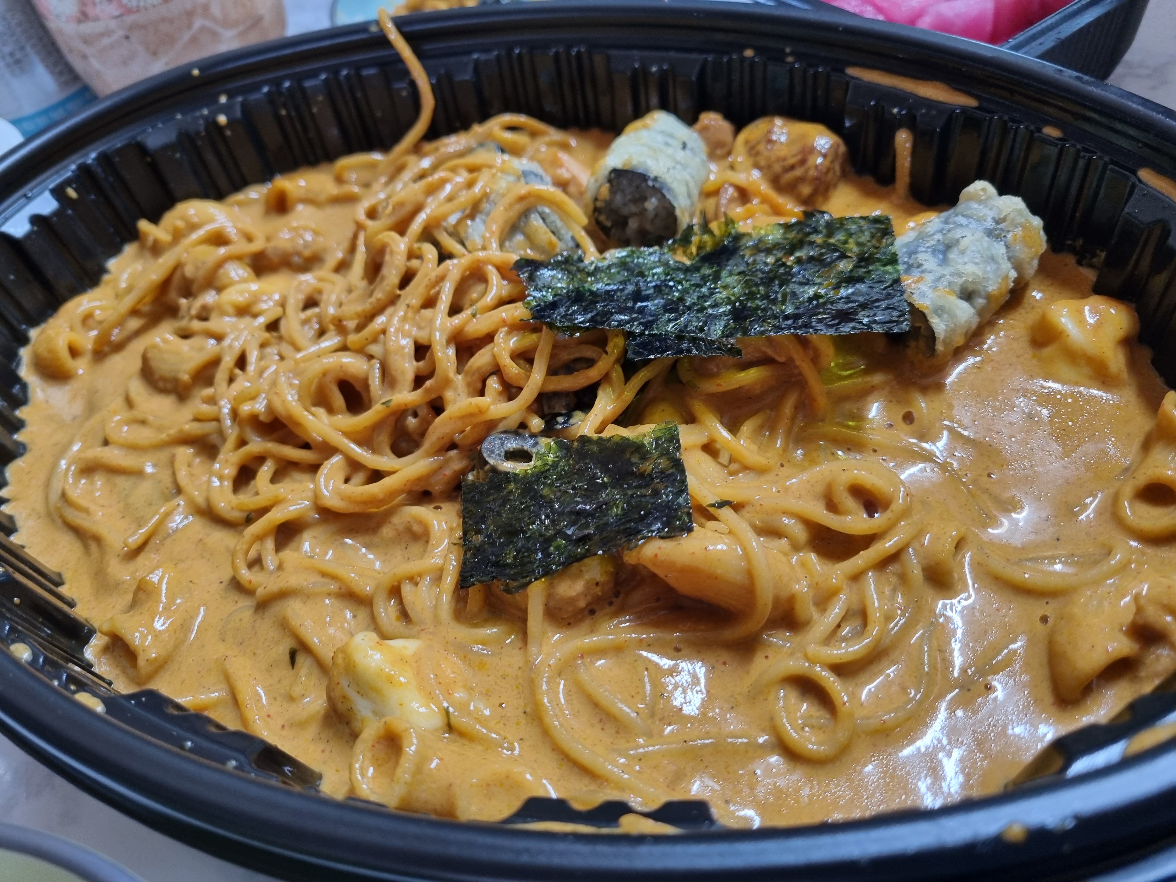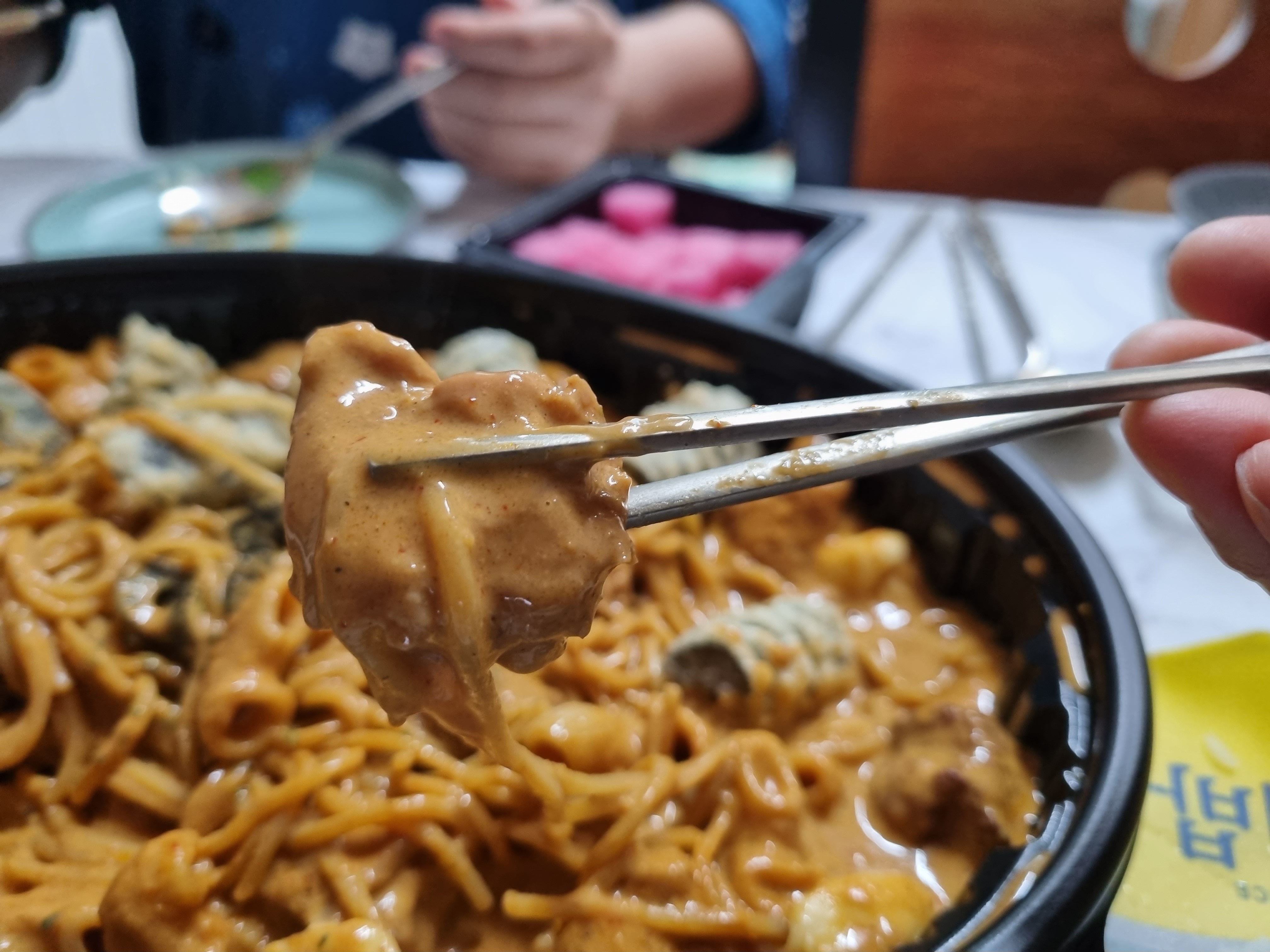 면이 파스타와 똑같은 맛이었으며 살짝 매콤해 애들이 아니라면 이것이 좋은 것 같습니다. 닭고기는 순살이고 부드러워 먹기 편하고 식감도 좋아 어린이들이 좋아하겠습니다.
