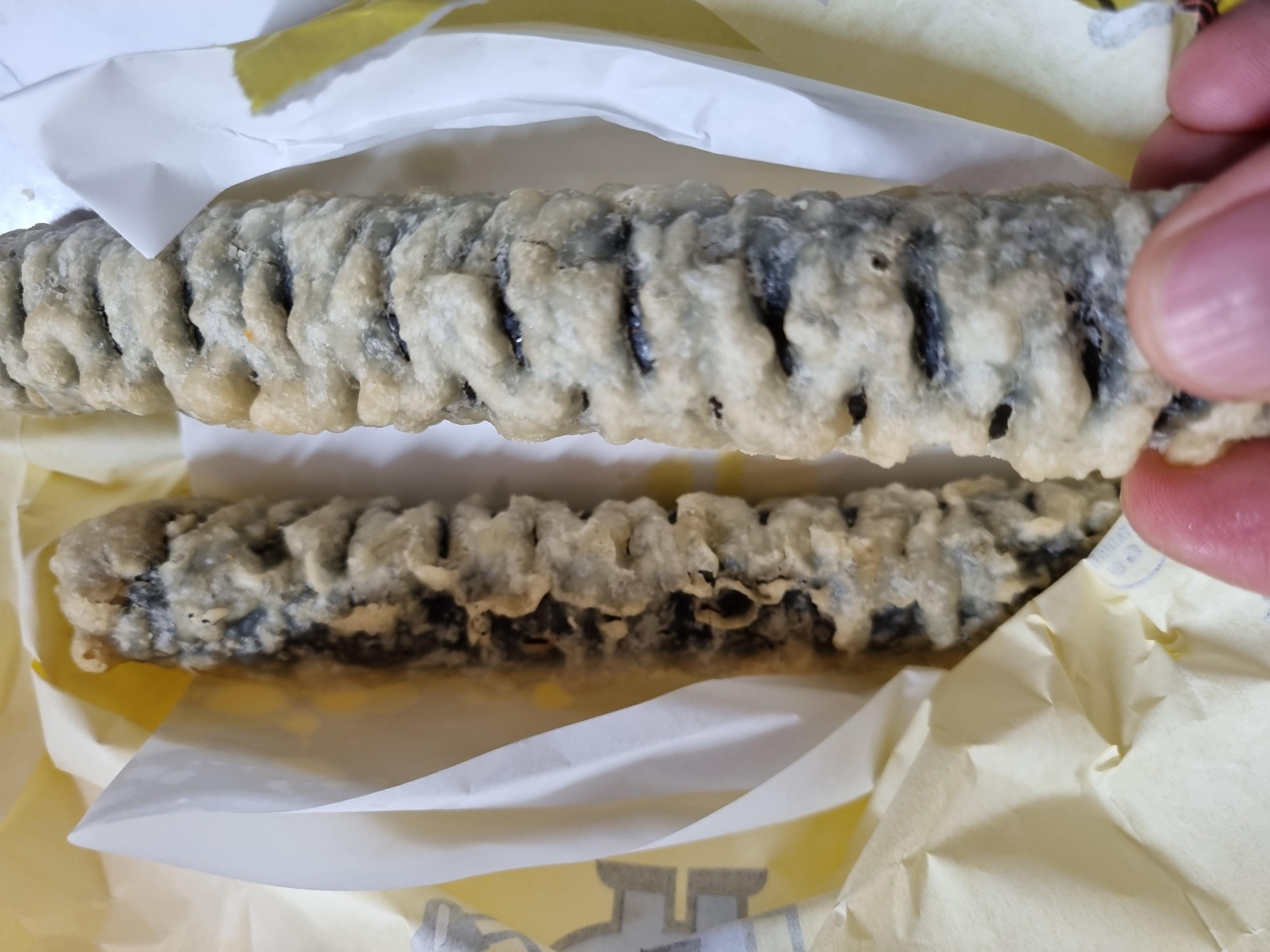 롱긴말이 사이드메뉴인데 잡채를 김에 싸서 튀기는 음식으로 분식집이나 포장마차에서 판매하는 잡채튀김과 거의 비슷하다고 생각하면 되는데 말 그대로 조금 길이가 길어 롱긴말이입니다. 180mm로 두 개로 구성되어 있으며 가격은 2,500원입니다.