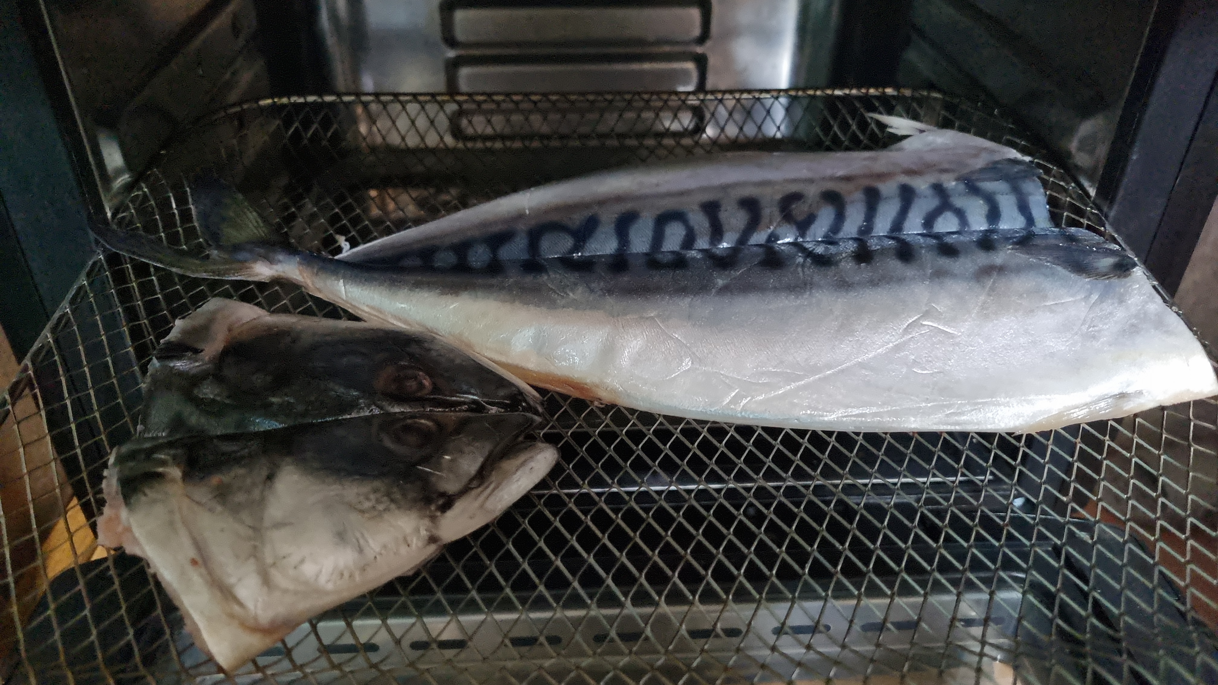 고등어 한마리를 에어프라이어 그릴에 올려놓았는데 너무 커서 머리 부분을 잘라 옆에 놓았습니다. 작은 것은 2마리까지 굽는 것이 가능한데 상당히 큰 것입니다.