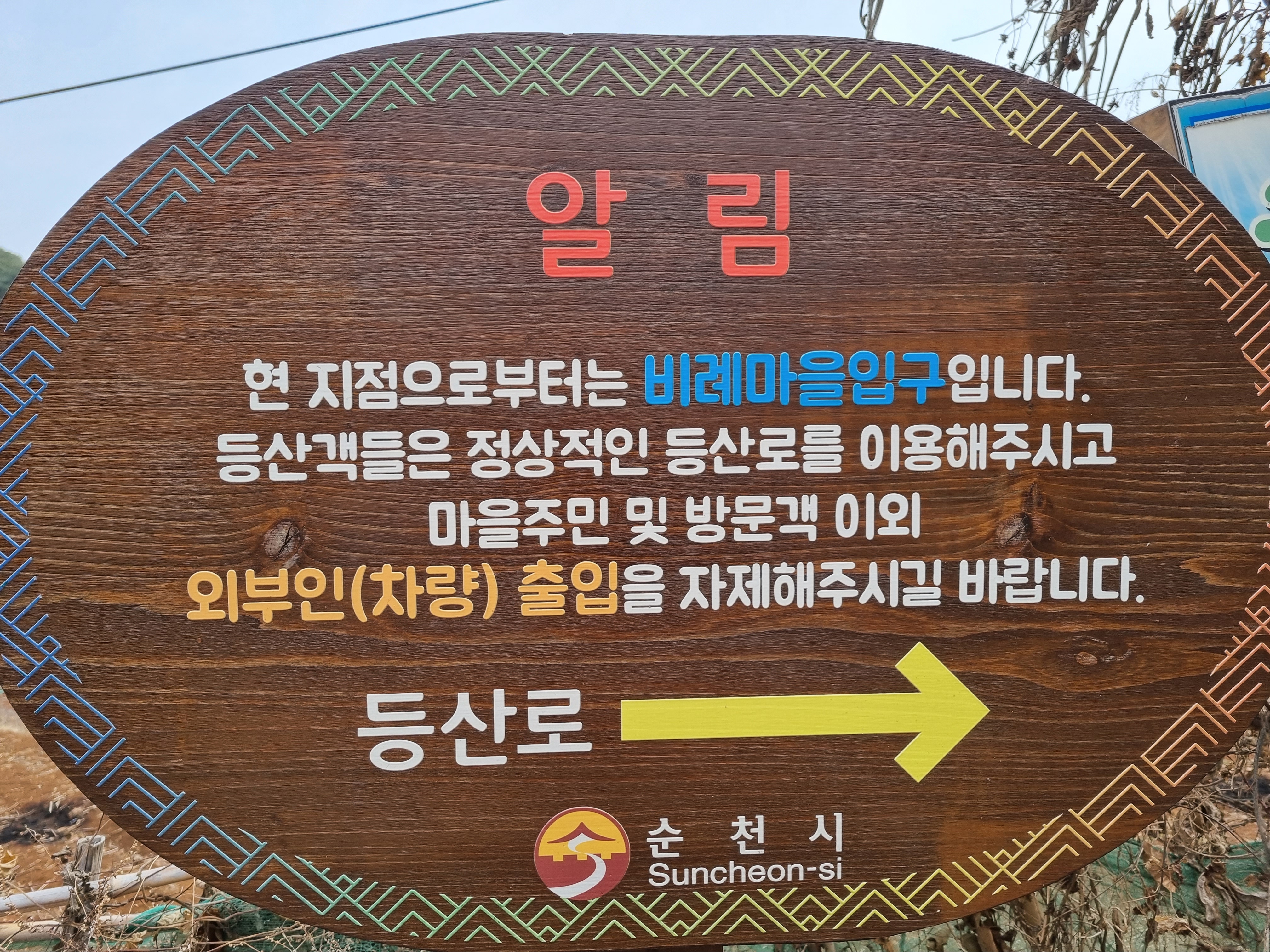 사람들의 출입이 많아져 마을입구로 등산은 자제해 주라고 하네요. 여기서 천극산 쪽으로 가야 둘레길을 한 바퀴 돌 수 있고 편백숲도 갈 수 있습니다.