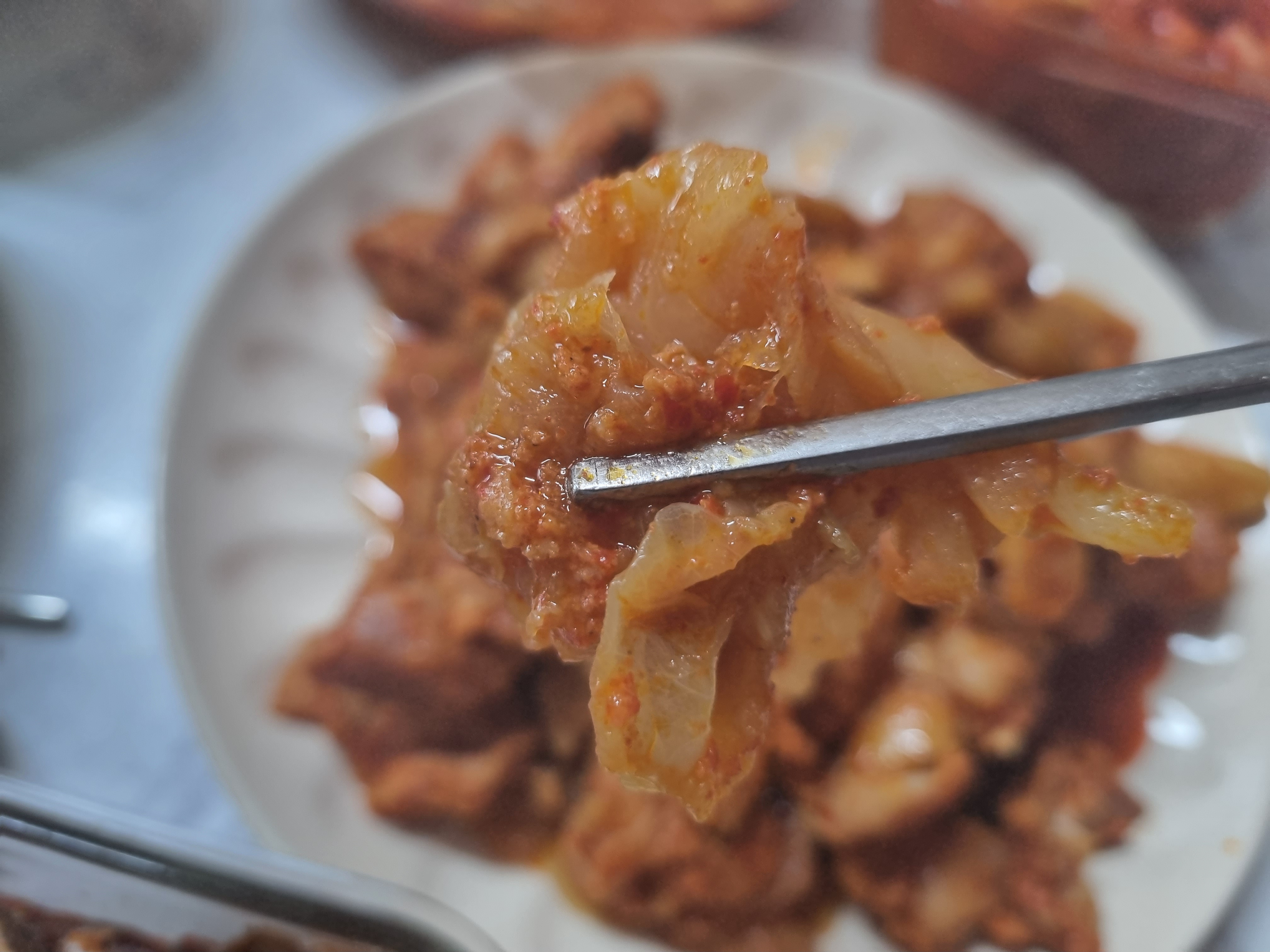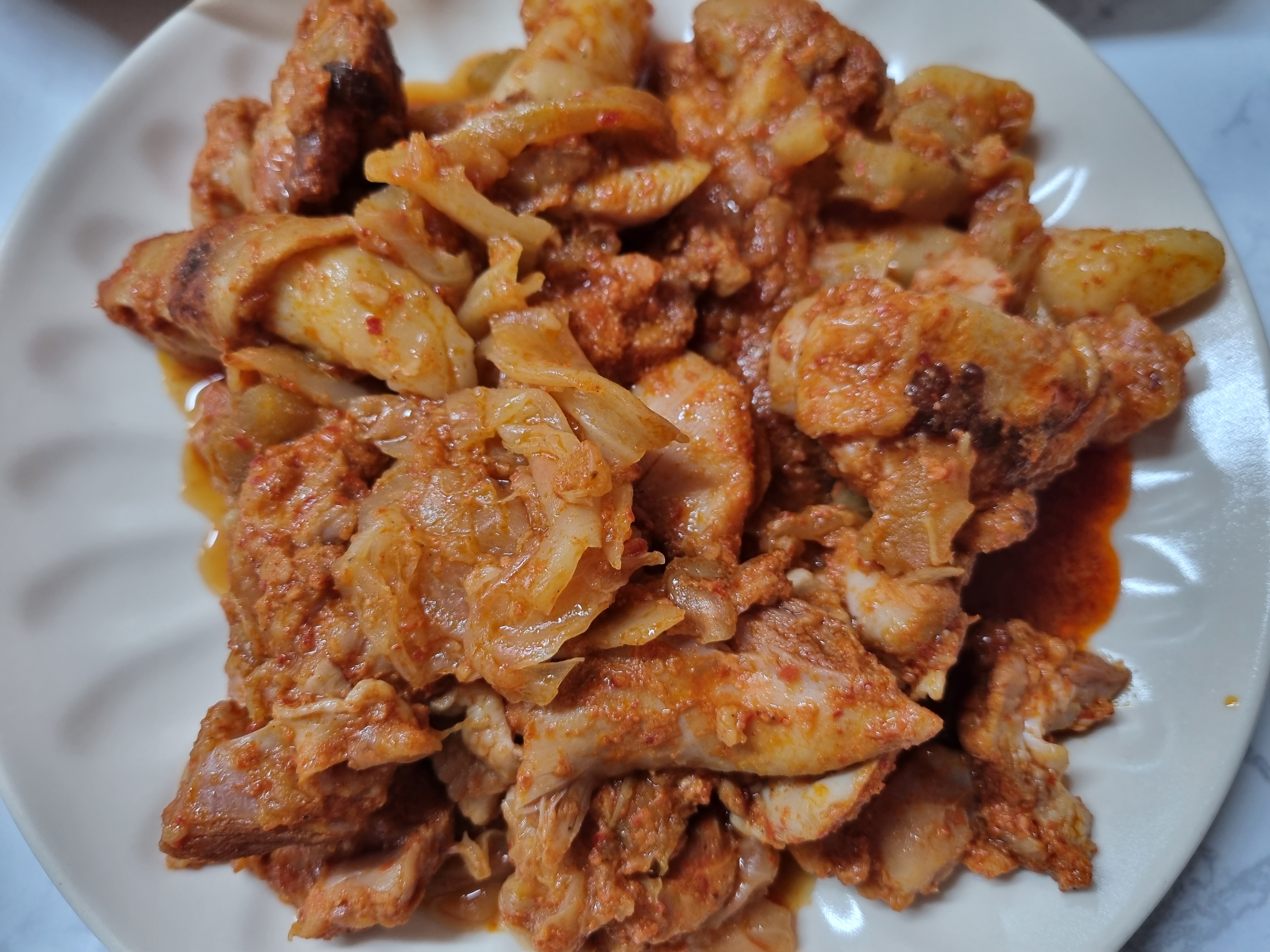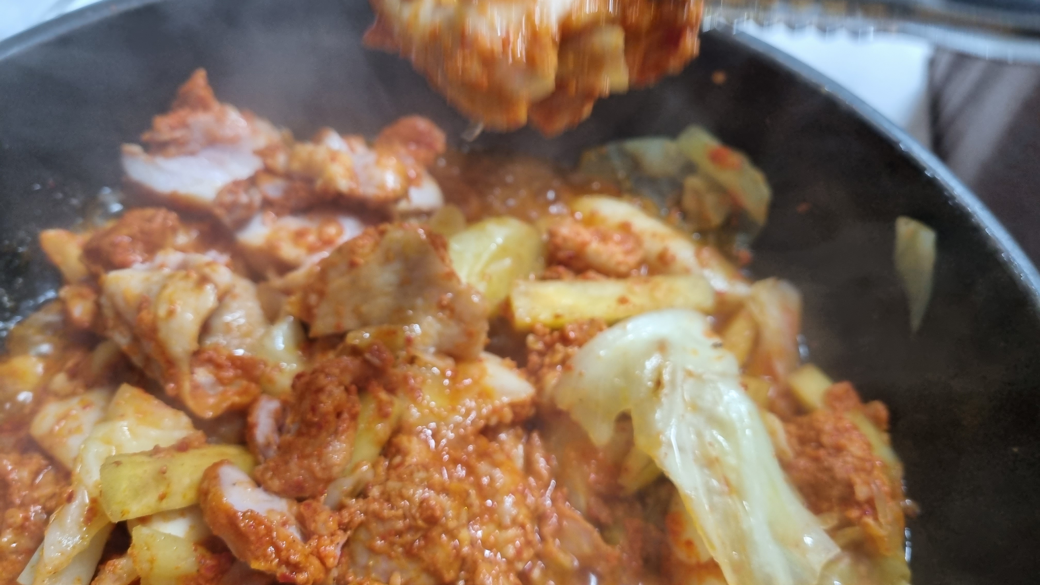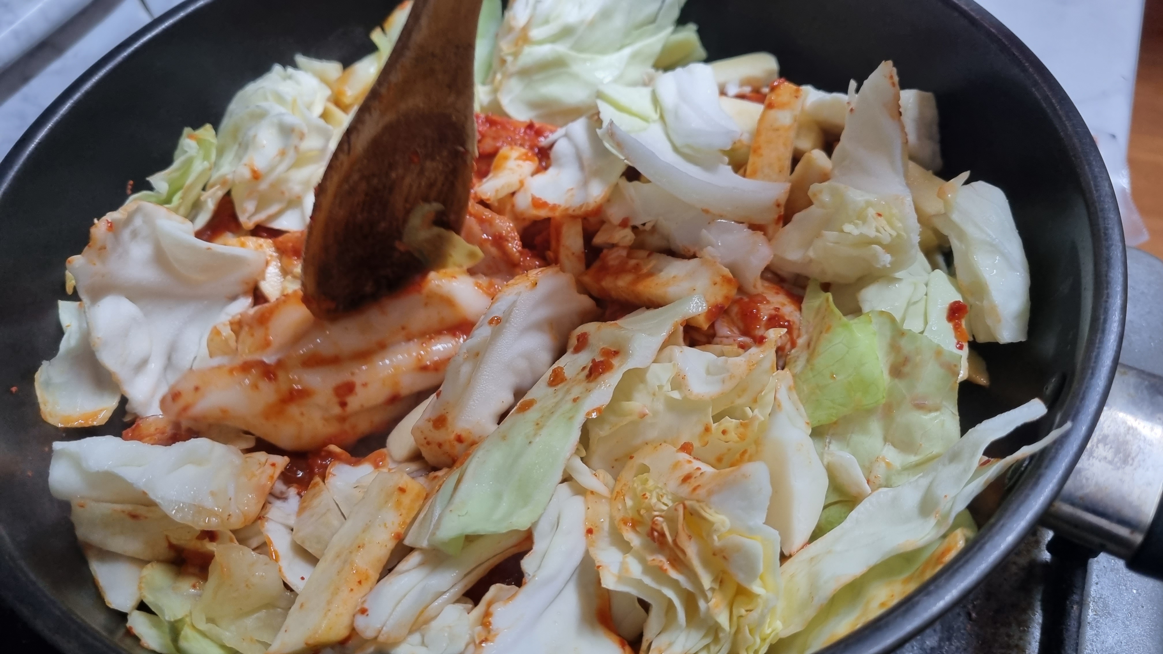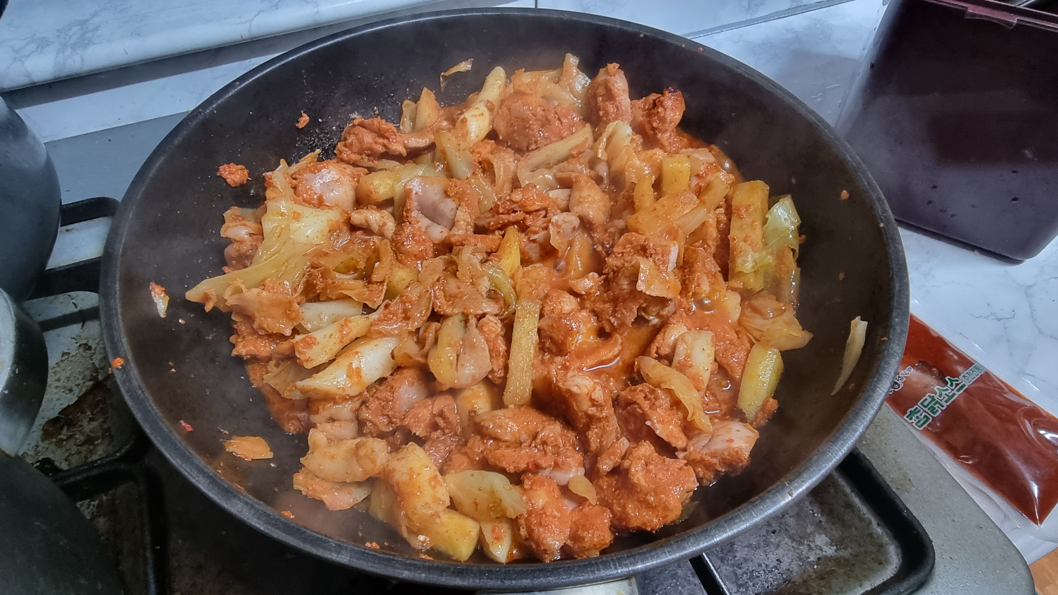 일단 닭갈비와 양배추, 고구마, 떡을 잘 섞어줍니다. 아직까지 다른 양념은 추가하지 않을 예정인데 마지막에 맛을 보고 최종 결정예정입니다.