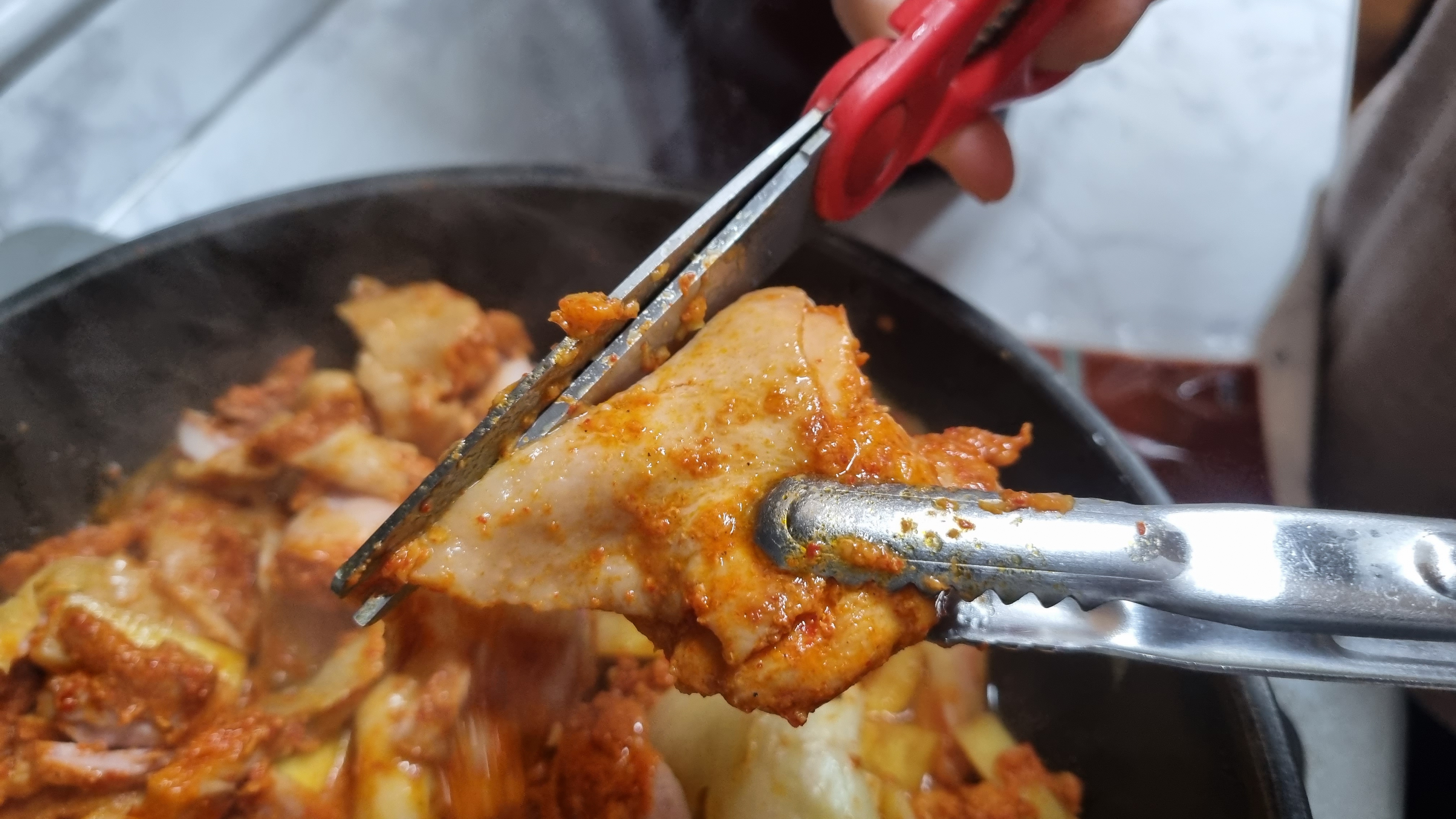 닭갈비 고기 크기는 처음에 덩어리로 나와 중간에 이렇게 반드시 잘라줘야 합니다. 고기의 크기는 애들과 함께 먹을 시 조금 더 작게 잘라주면 되는데 맵지 않기 때문에 초등생이나 더 어려도 먹을 수 있는 정도입니다.