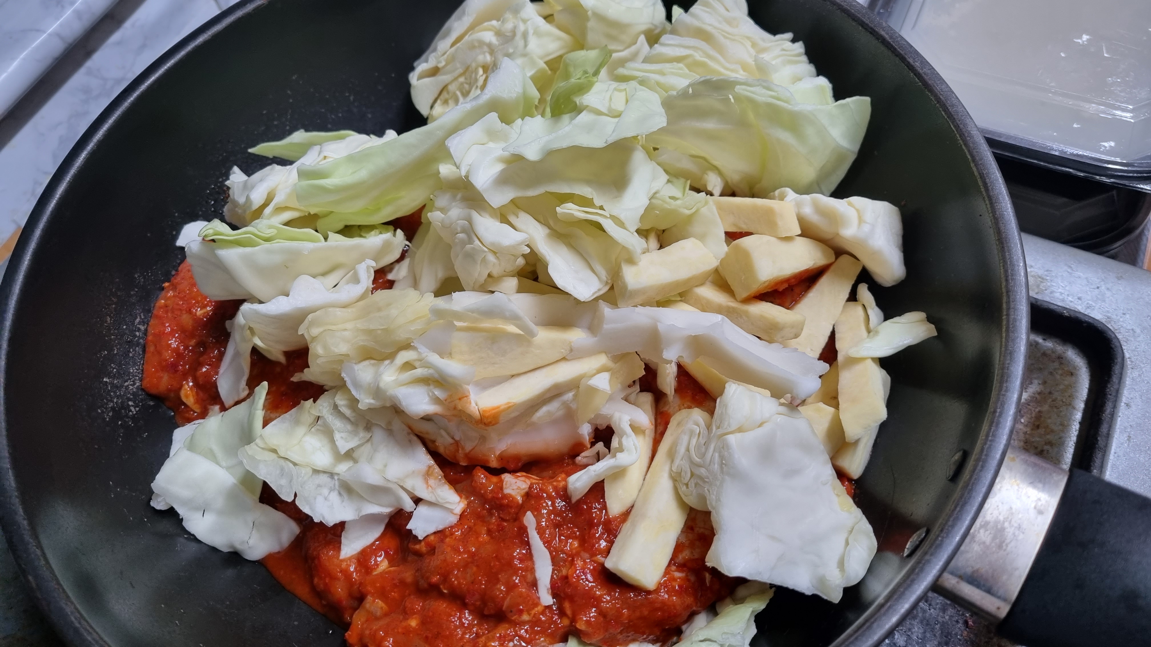재료의 양은 양배추는 보통크기에서 반정도 썰어 넣었고 고구마는 주먹만 한 크기 한 개 넣었습니다. 크기는 특별한 규격은 없고 입에 넣어도 부담 없을 정도의 크기면 되는데 고구마는 잘 익어야 하므로 더 작게 위 사진 크기로 자르면 되겠습니다.
