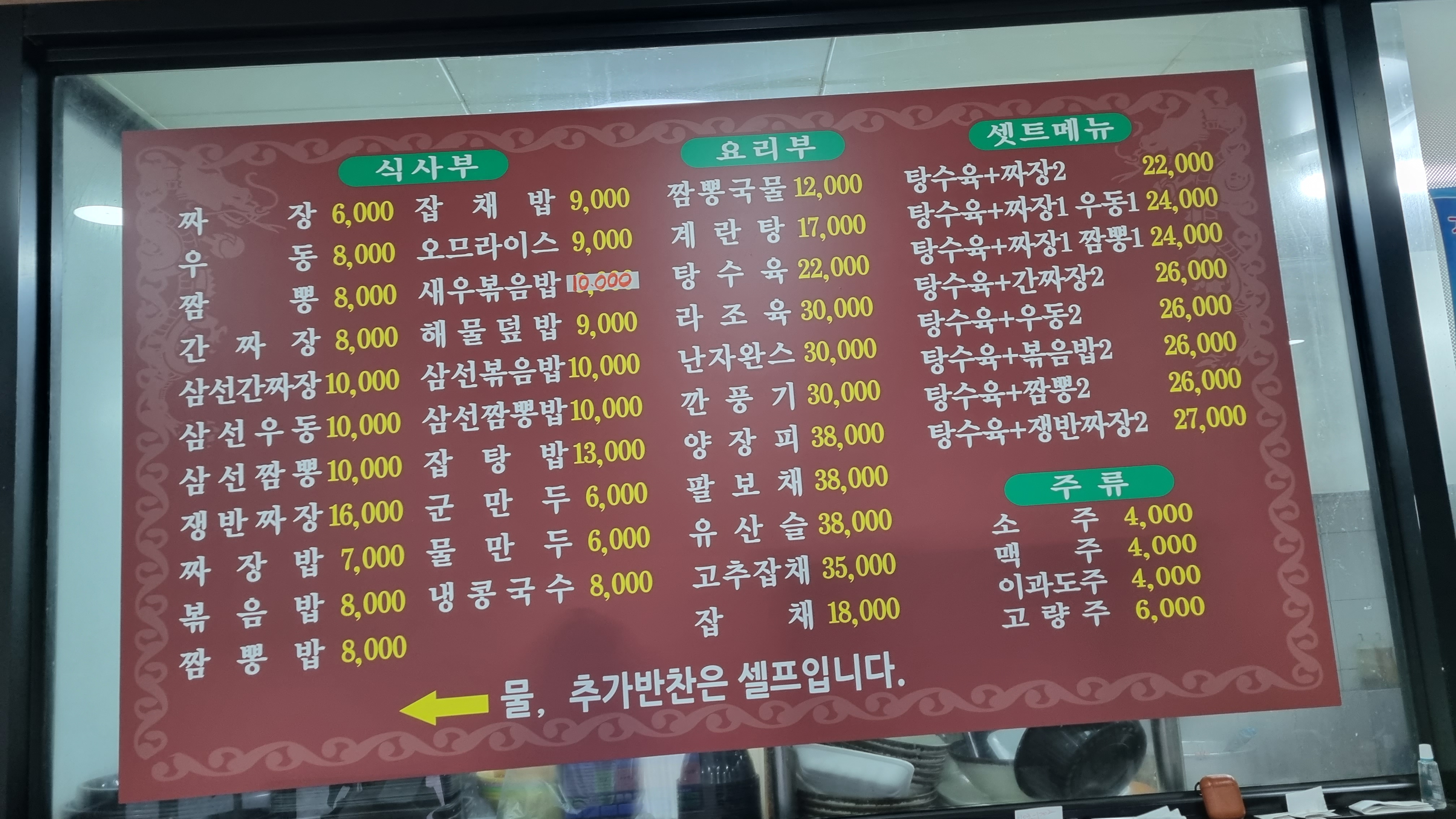 가격은 세트메뉴가 22,000원이며 간짜장은 8,000원입니다. 가격이 많이 올랐지만 요즘엔 돼지국밥도 9천 원에 판매되는 경우가 많아 다른 음식에 비해 많이 오르지 않은 것인데 짜장면이 국가 물가를 관리하는 음식에 들어가 가격을 쉽게 올리기 힘들다고 합니다.