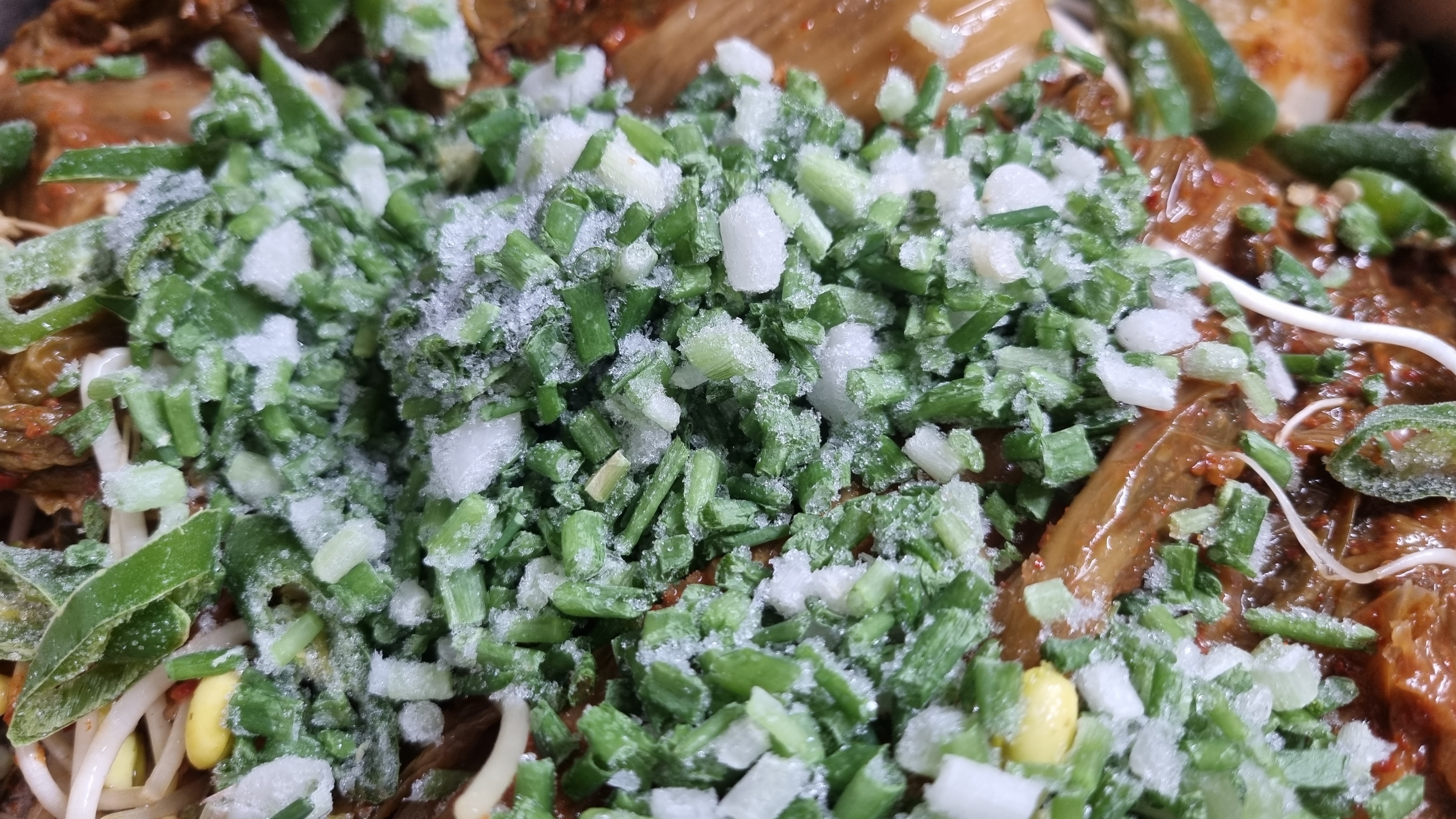 냉동된 청양고추와 다짐마늘, 대파를 조금씩 넣었습니다. 물은 모든 재료가 살짝 잠길 정도로 넣으면 딱 좋습니다.