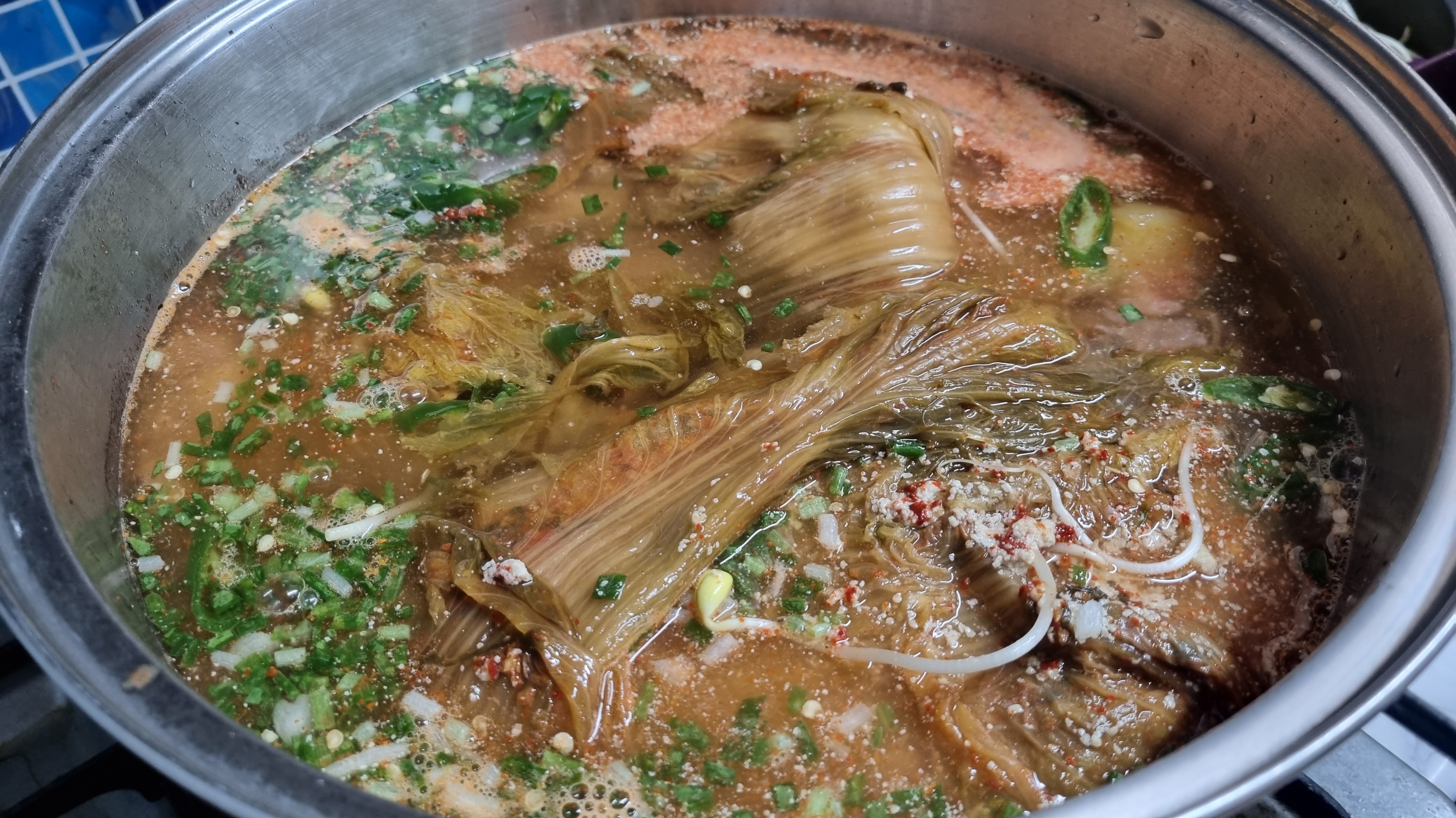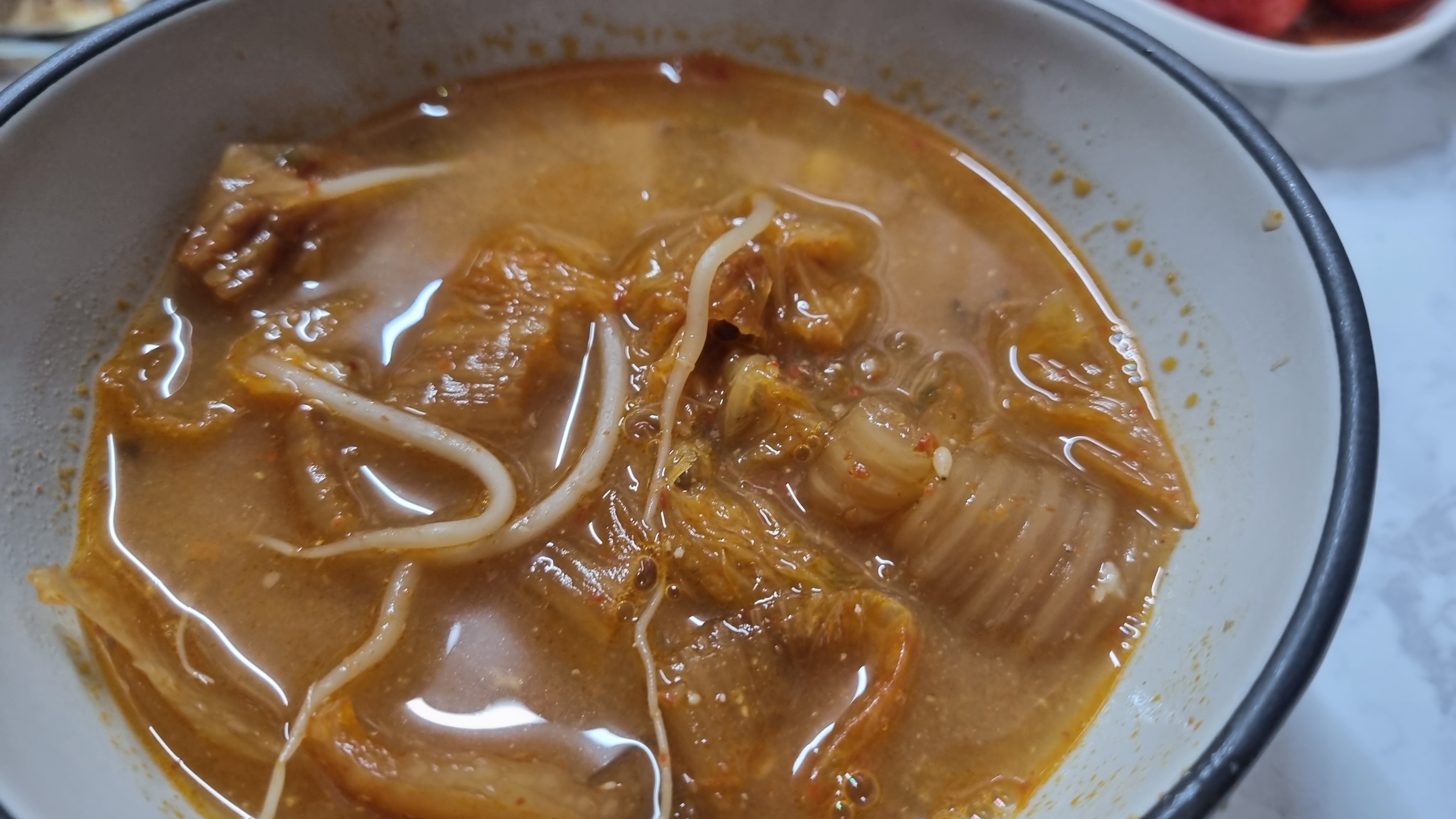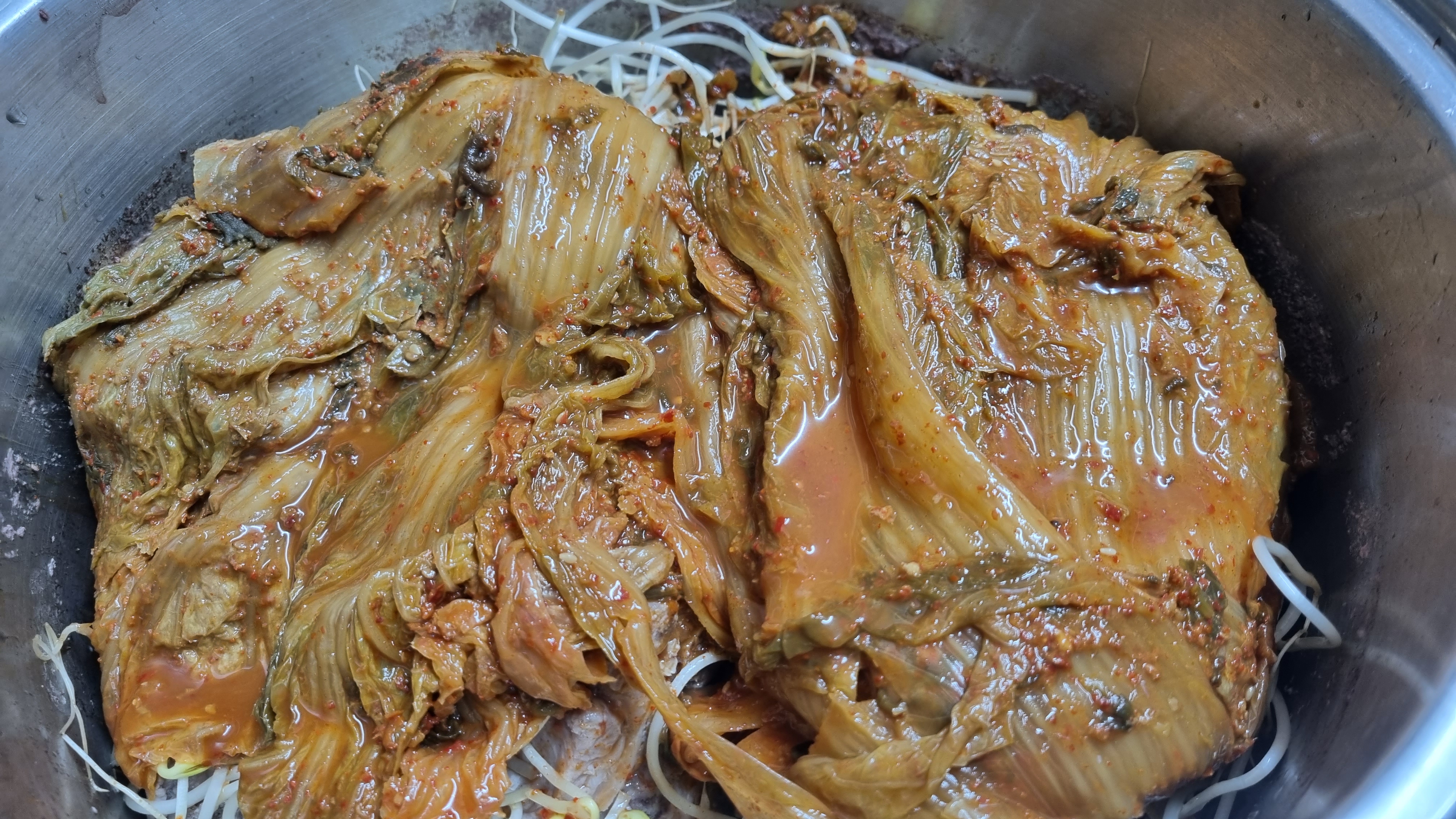 김치는 포기채 넣었고 시원함과 해장국의 기능을 높이기 위해 콩나물도 조금 넣었습니다. 김치는 색깔이 더 빨간색에 가까운데 카메라고 좋지 못한 것 같습니다.