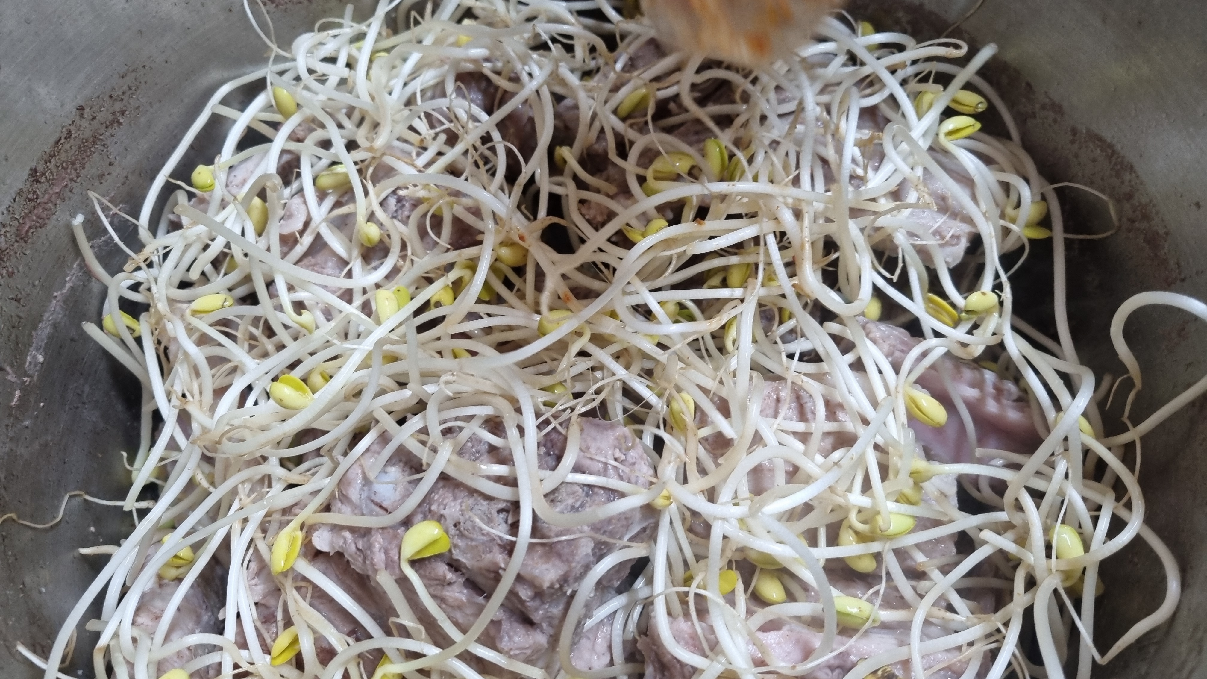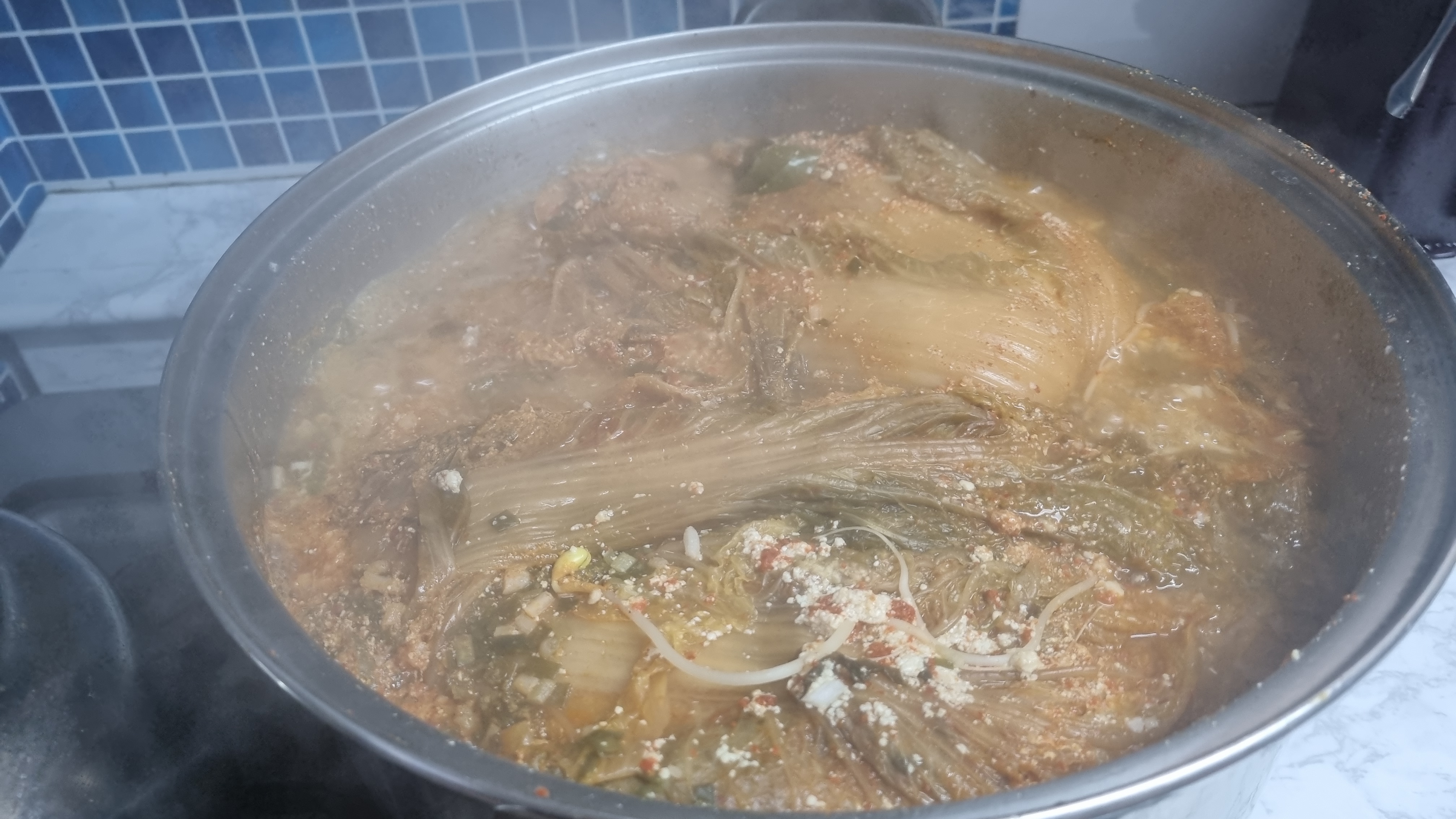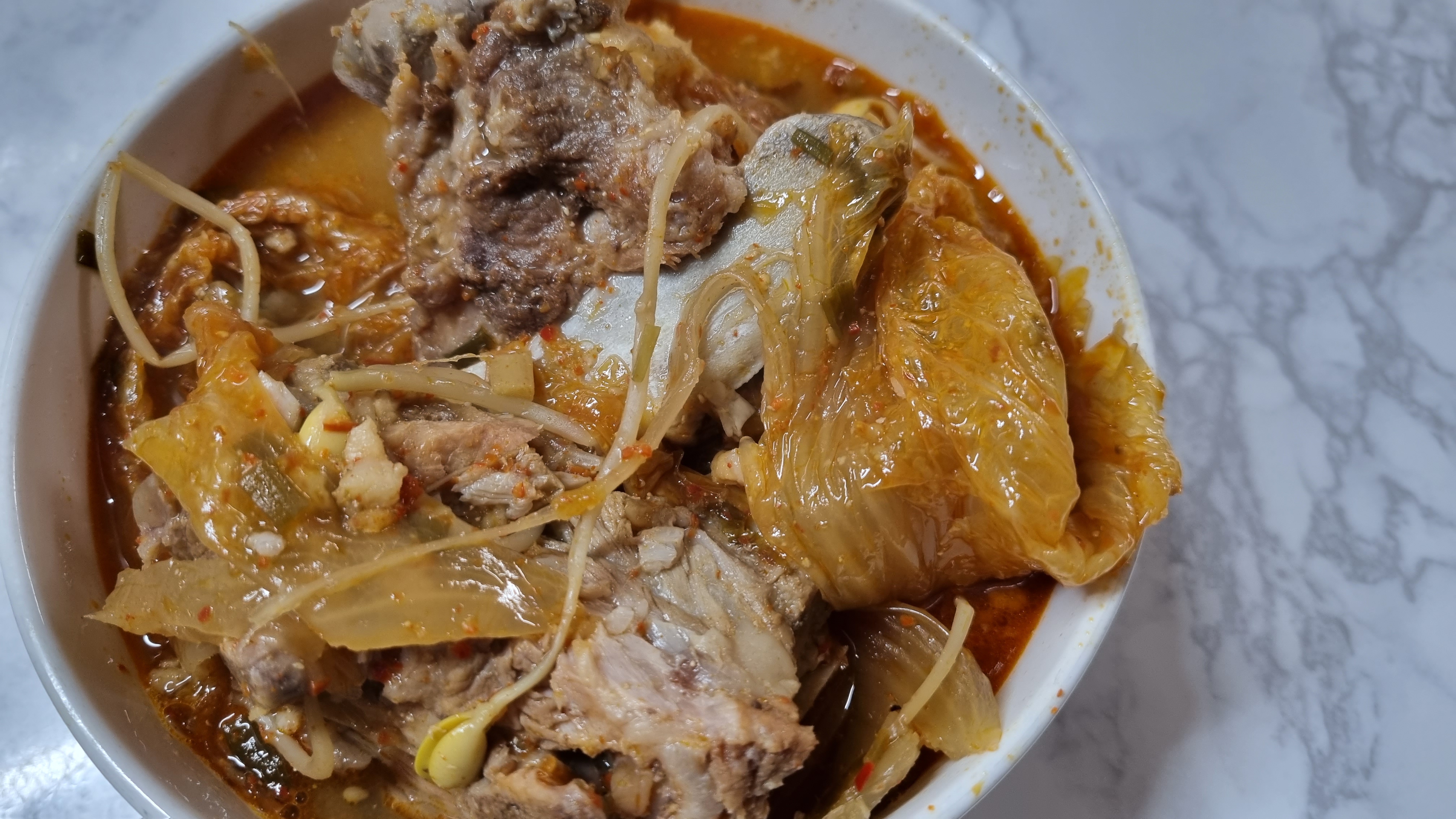 김치는 포기채 넣었고 시원함과 해장국의 기능을 높이기 위해 콩나물도 조금 넣었습니다. 김치는 색깔이 더 빨간색에 가까운데 카메라고 좋지 못한 것 같습니다.