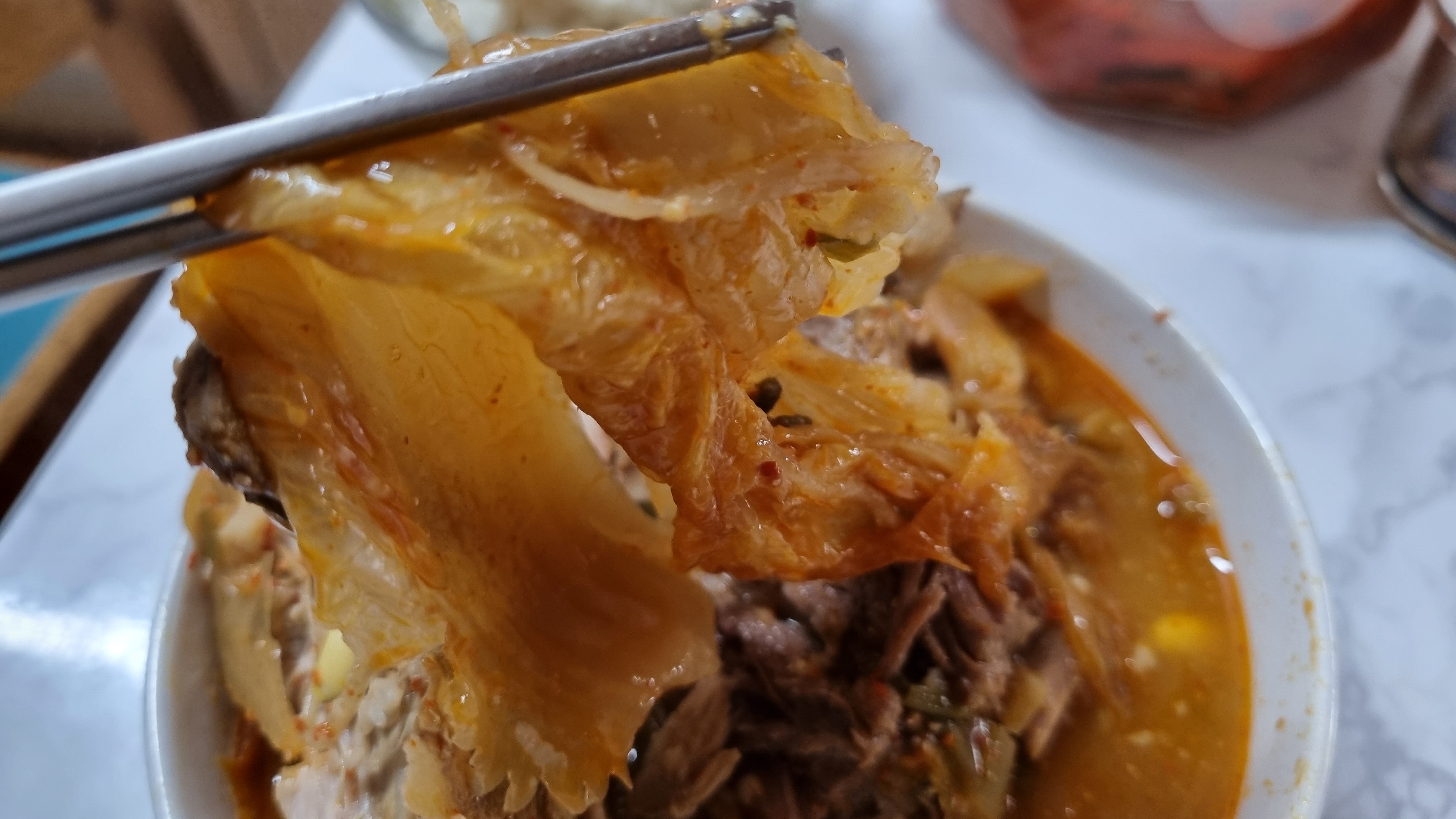 기본적인 김치와 김치국물이 들어가 국물맛은 간이 맞고 딱 좋습니다. 감자탕 뼈도 고기도 많고 또한 고기가 잘 분리되어 먹기도 편합니다.