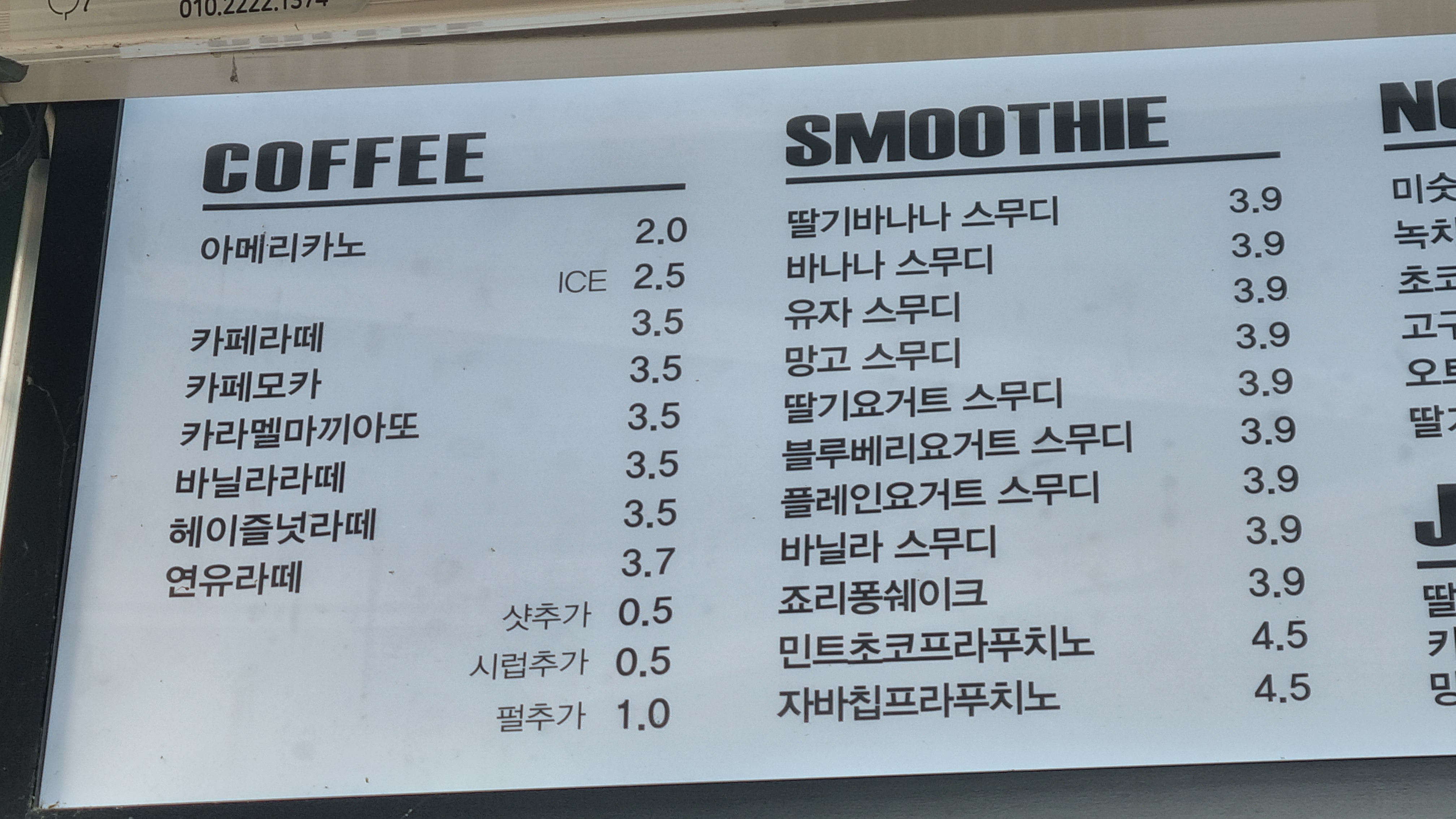 커피는 종류별로 모두 있는데 가격은 저렴합니다. 아메리카노가 2천 원이며 아이스는 2천5백 원으로 비교적 저렴하게 이용할 수 있습니다.