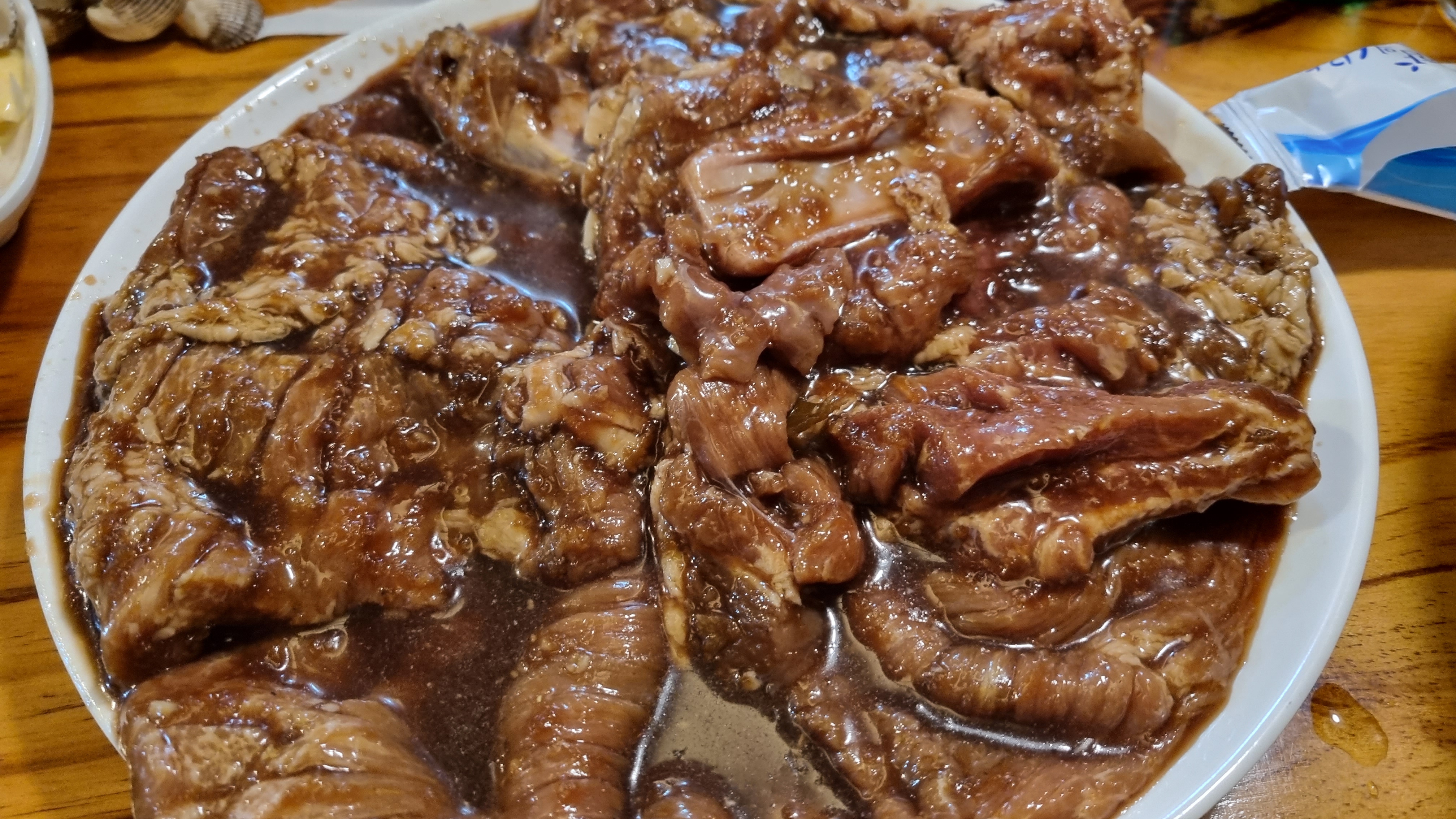 이어서 추가로 갈비를 주문했습니다. 갈비의 불판은 그물망식으로 되어 있는데 1회용을 사용하고 있네요. 갈비는 비계덩어리 부위가 없고 양념도 잘 되어 있었습니다.