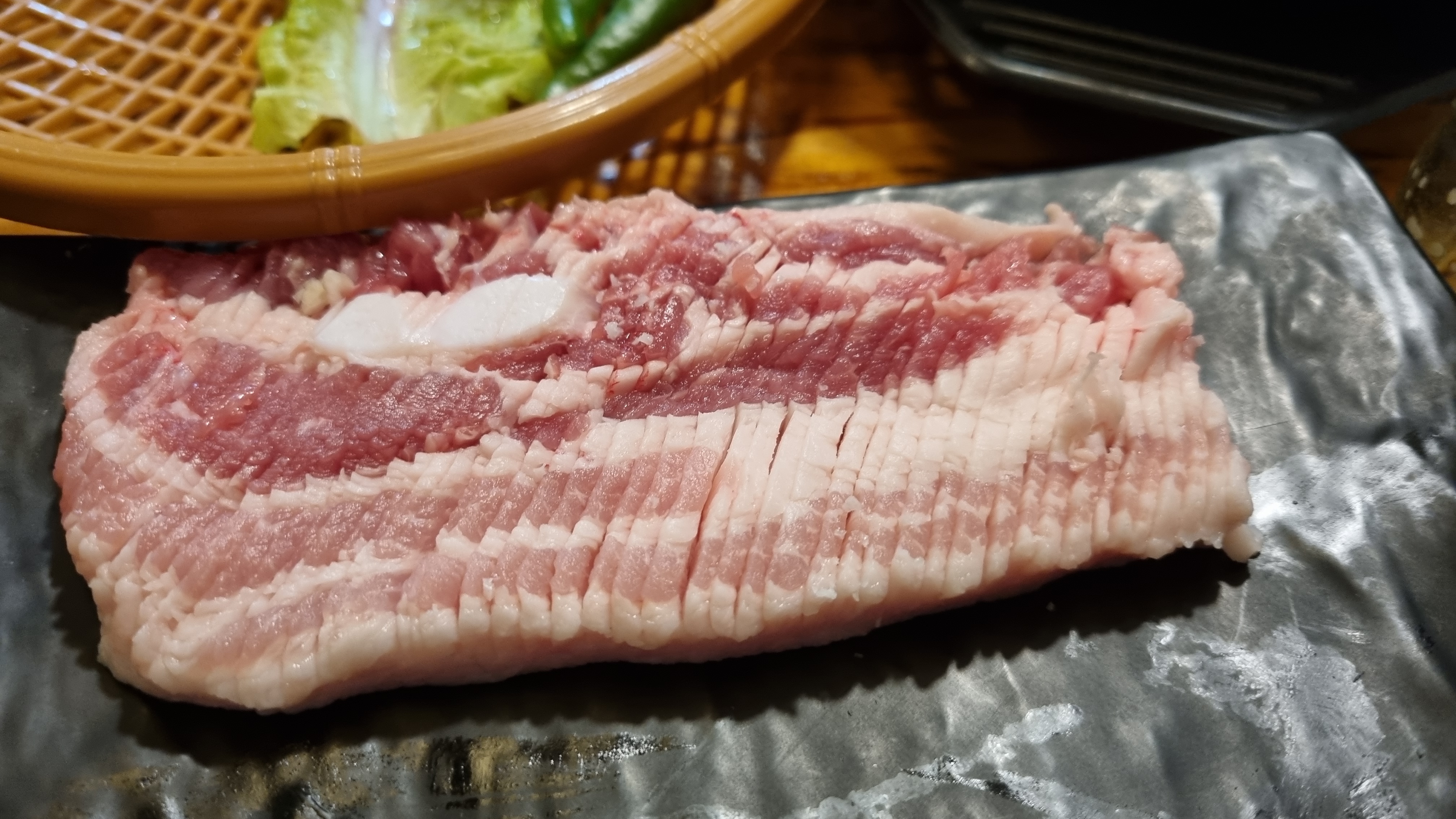 삼겹살은 이렇게 칼집이 촘촘히 되어 있어 맛이 확실히 더 좋았습니다. 고기가 칼집 때문인지 맛이 확실히 괜찮았고 잘 구워지고 부드러워 애들도 많이 좋아했습니다.
