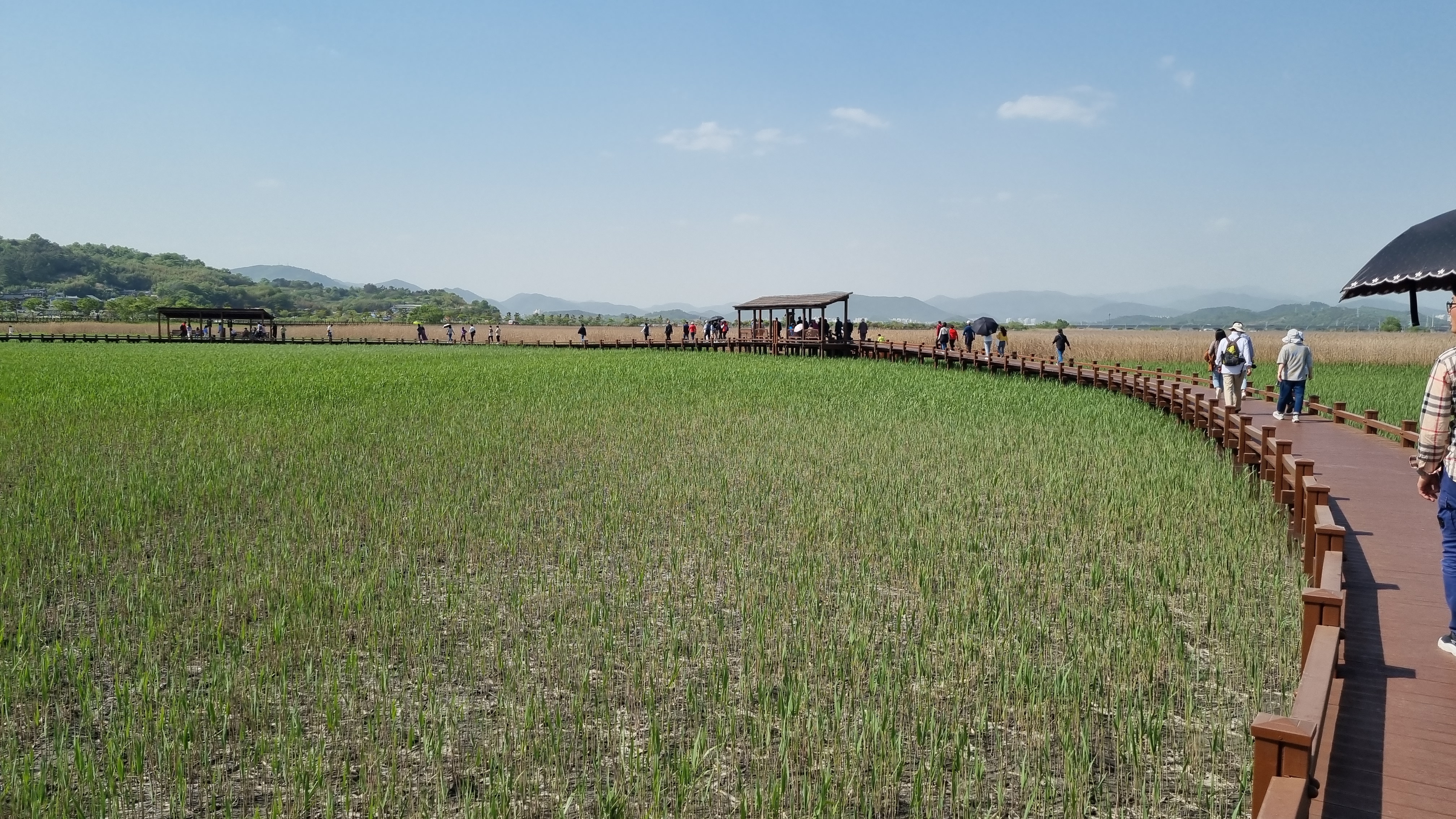 건너기 전과 건너편의 갈대 색깔이 다르는데 이것은 갈대를 이쁘게 자라기 위해 미리 베어서 색싹처럼 자라 파릇파릇하고 건너편은 기존의 갈대라 누렇습니다.