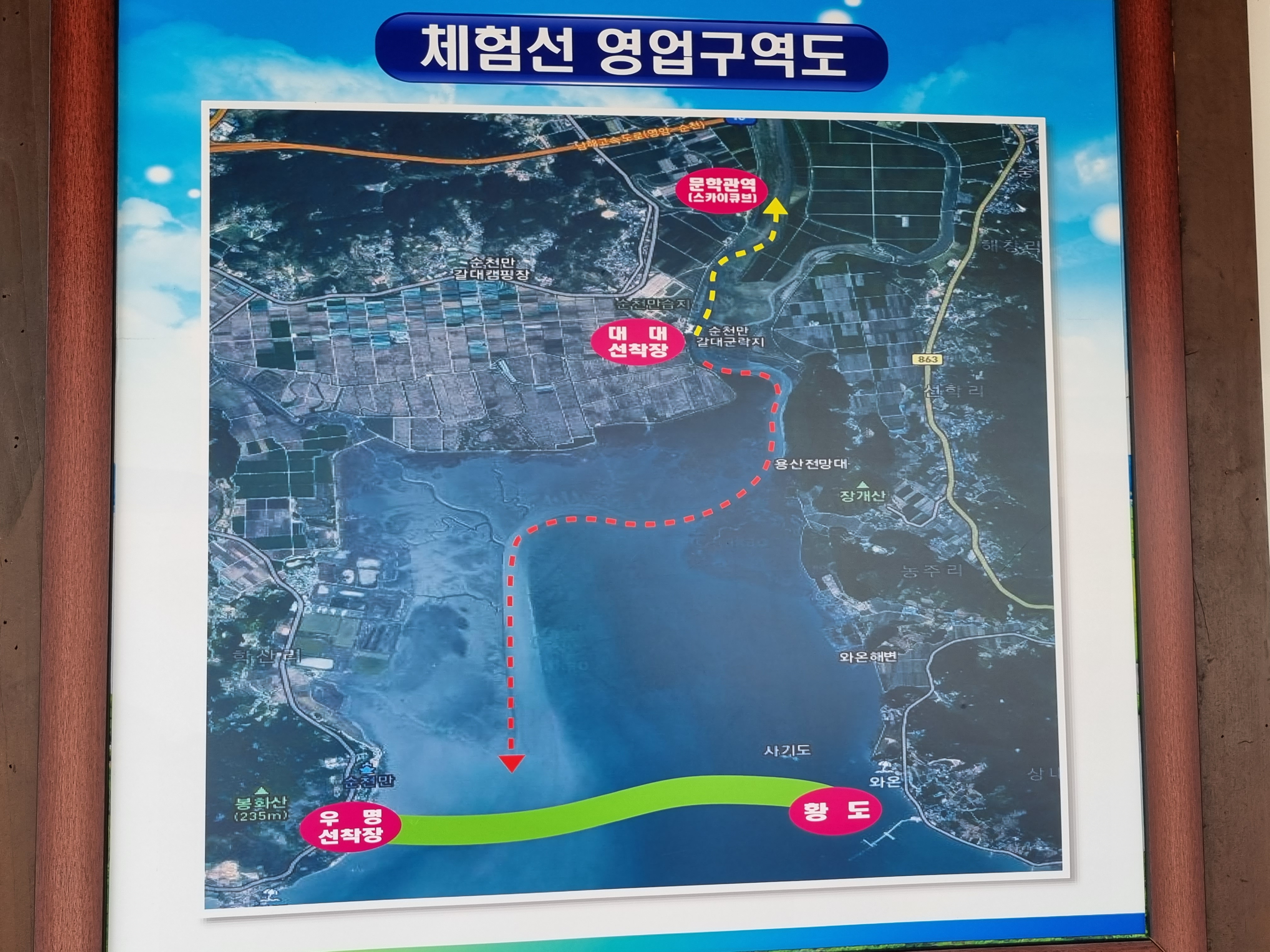애들이랑 가면 특히 아주 좋아할 것이고 저기 보이는 산이 용산인데 40분 정도의 등산코스인데 거의 산책로 수준으로 길도 잘 정비되어 있고 정상에 전망대도 있는데 저곳에서 최고이 순천만 경치를 볼 수 있는데 동화 속의 그림을 보는 듯합니다.