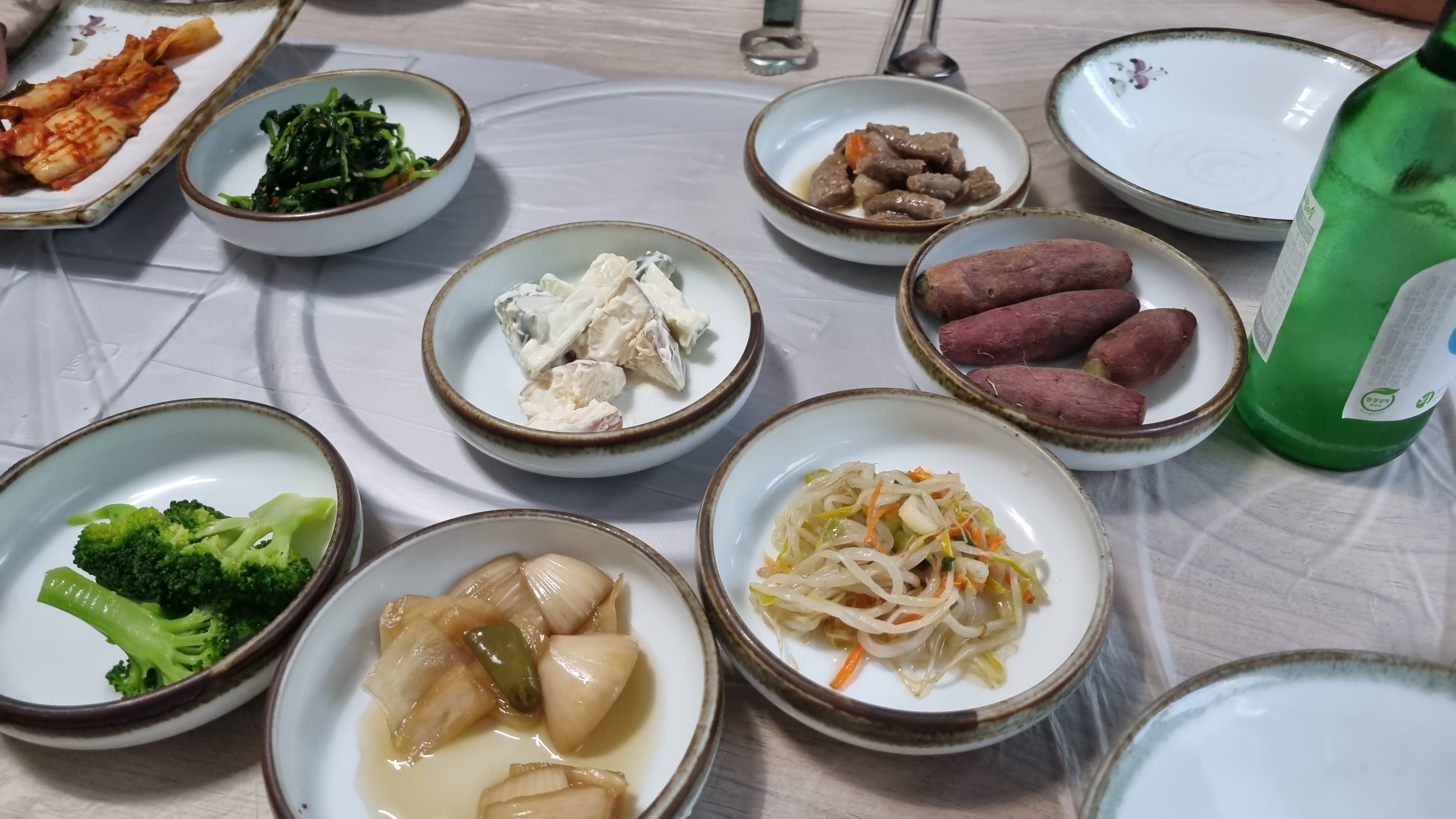 밑반찬인데 여러가지가 나오는데 고구마가 맛있으며 김치도 정말 맛있습니다