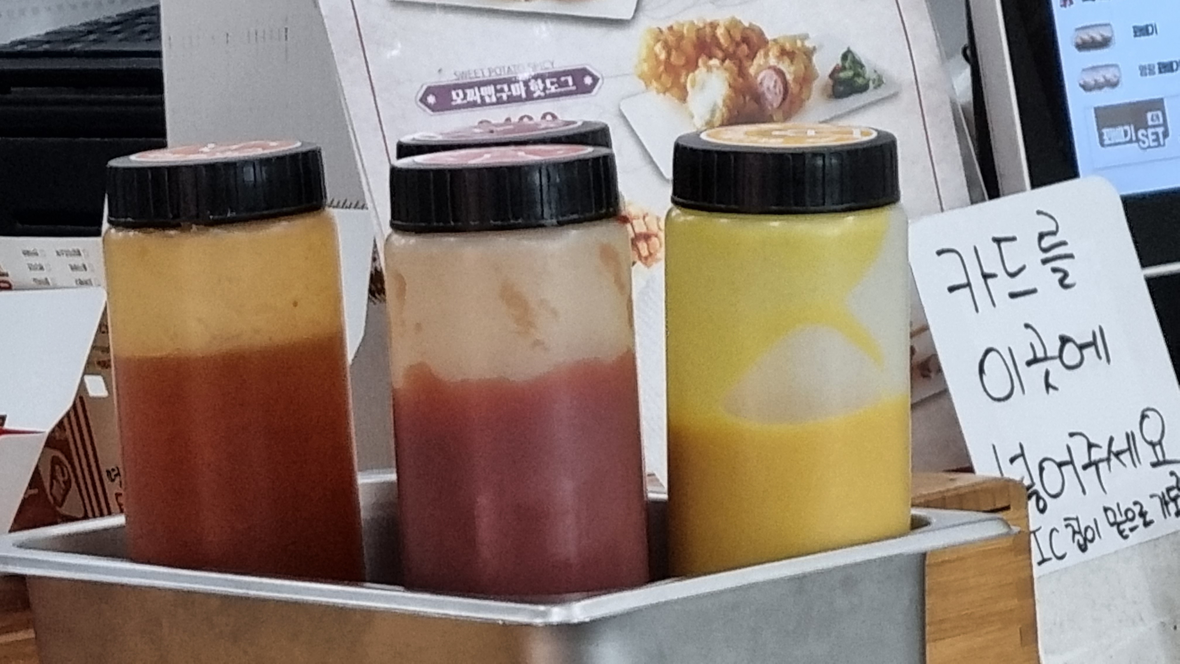 소스종류는 스위트칠리, 토마토케첩, 치즈머스터드, 체다치즈맛, 핫칠리, 허니머스터드가 있는데 필자는 가장 많이 나가는 스위트칠리와 토마토케참 소스를 선택했습니다.